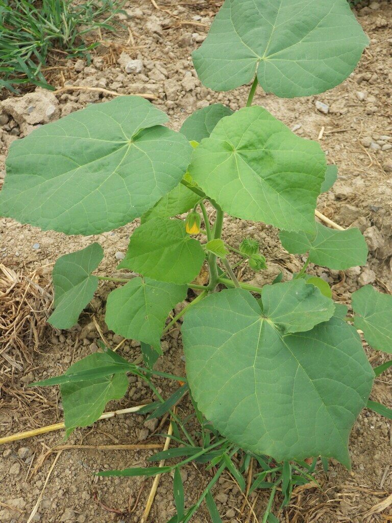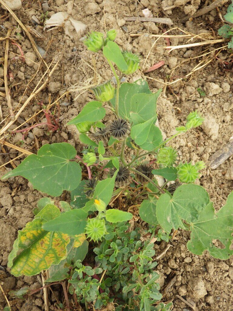 És una herba anual de 30-100 cm, robusta, erecta, ramificada a la part superior, tomentosa i amb pèls estel·lats. Les fulles són vellutades i llargament peciolades, el limbe de 5-15 cm de longitud és cordiforme amb l’àpex agut i el contorn crenat. La inflorescència està formada per cimes axil·lars pauciflores. Les flors són grogues amb els sèpals ovats, aguts i soldats fins a la meitat inferior i pètals de 7-13 mm, obovats, truncats o emarginats. El fruit són 10-15 mericarpis més llargs que el calze, negres, hirsuts i bífids, les granes de 3-3,5 mm, són tuberculades i glabres.