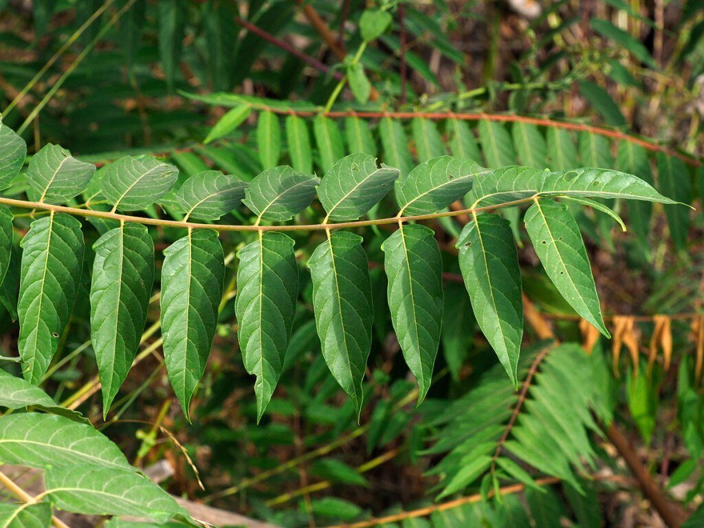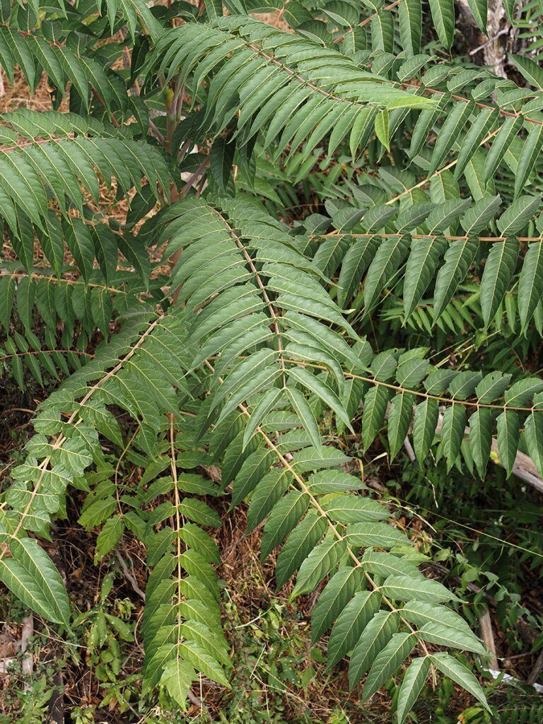 És un arbre d’1-20 m, caducifoli, d’escorça llissa i de color bru-grissenc amb vetes de color més clar i d’olor fètid. Les branques fan un angle agut amb el tronc principal i els branquillons i la base dels pecíols són rogencs. Les fulles són alternes, molt grosses i compostes amb 13-31 folíols asimètrics, peciolulats, ovats o lanceolats, acuminats, ciliats al marge, verds per l’anvers, més pàl·lids pel revers i amb 1-4 dents glanduloses a la base. Les flors són unisexuals, rarament hermafrodites, amb 5-6 sèpals lliures lanceolats i 5-6 pètals verdosos; les inflorescències masculines tenen moltes flors i molt oloroses i les femenines poques i inodores. Els fruits són sàmares allargades i agrupades en raïms penjants; cada sàmara conté una grana més o menys arrodonida, aplanada i de color marró fosc o vermell.
