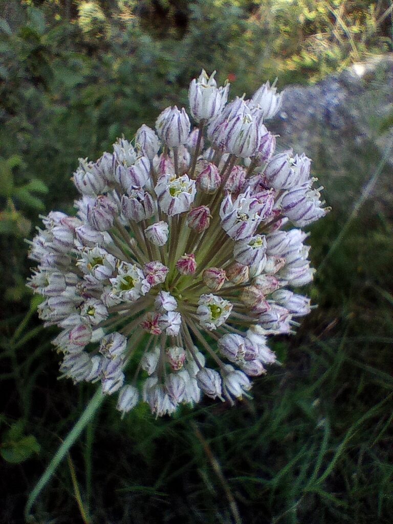 És una herba bulbosa de 20-100 cm. El bulb d’1,5 cm és ovoide amb bulbets laterals o sense. Les fulles (4-8) de 20-45 cm són planes, amb el marge completament denticular i disposades al llarg de la meitat inferior de la tija i amb una beina que pot recobrir 1/3-1/2 de la tija. La inflorescència és de forma esfèrica, densa, multiflora i de 4-9 cm de diàmetre amb una bràctea caduca de 3-6 cm. Les flors normalment són blanquinoses, amb el periant ovoide i tèpals de 4-5 mm amb el nervi central d’un color més intens, els estams són sovint ± exserts, els externs són simples i els interns són tricuspidats. El fruit és una càpsula de 3-5 cm amb 1-2 granes per lòcul.