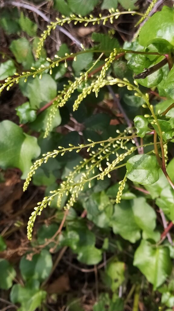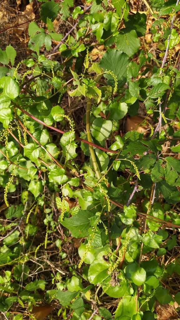 És una herba perenne de 2-5 m, enfiladissa, glabra, rizomatosa i amb nombrosos tubercles. Les fulles són alternes i curtament peciolades, el limbe és ovat, ± cordiforme i de contorn enter. La inflorescència és en raïms laxos de 5-12 cm de longitud. Les flors són blanquinoses de 2-5 mm, pedicel·lades i amb dues bràctees aplicades al periant. El calze té 2 sèpals ovats, obtusos i escariosos, la corol·la, amb el tub curt, té 5 segments oblongs, patents i obtusos; té 5 estams exserts dilatats a la base. El fruit carnós i comprimit està inclòs dins del periant persistent.