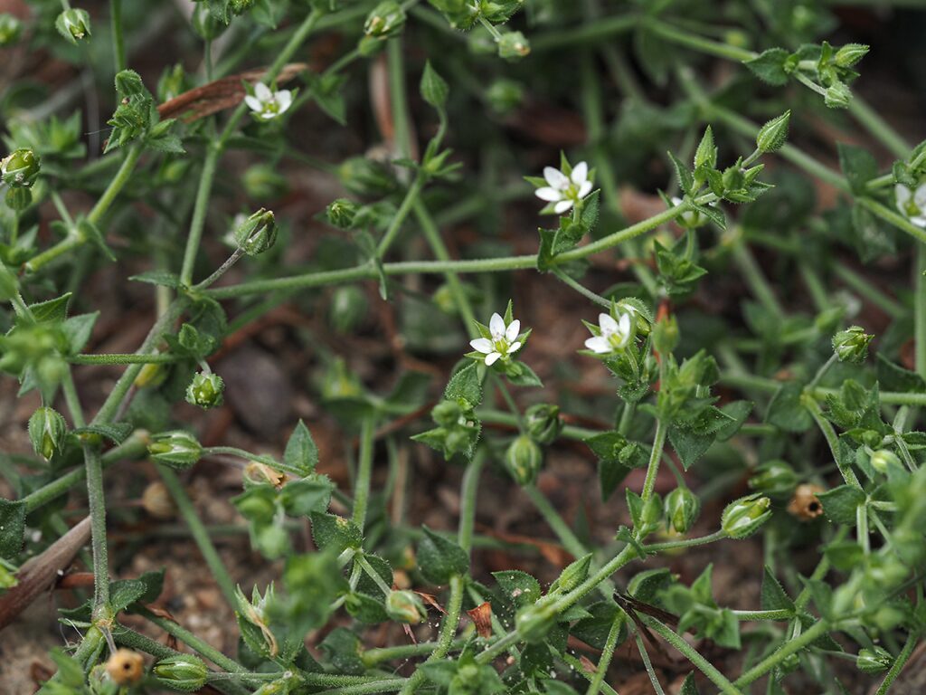 És una herba anual de 3-30 cm, erecta o ascendent, en general poc ramificada i puberulenta. Les fulles són oposades, curtament acuminades, les inferiors peciolades i les superiors sèssils. La inflorescència és laxa en cimes multiflores i inicialment en dicasi. Els Pedicels són generalment més llargs que el calze, els sèpals só de 3-5 mm de longitud i aguts, els pètals, d’1,5-3 mm, són blancs. El fruit és una càpsula ovoide, fortament ventruda a la part inferior, dura i difícilment compressible amb els dits.