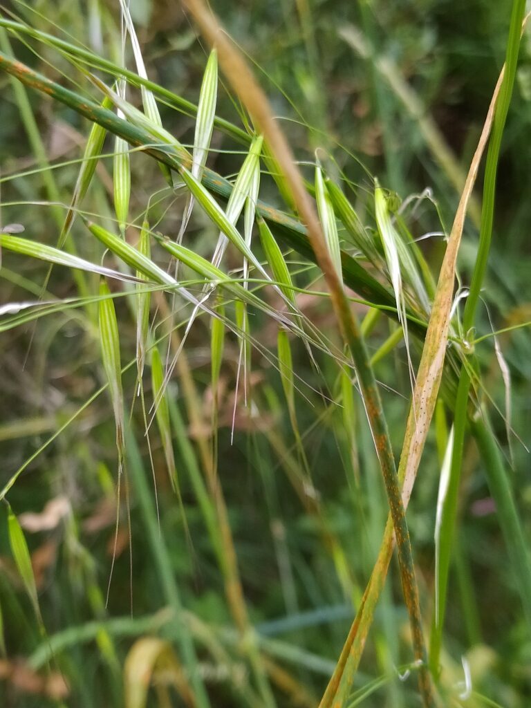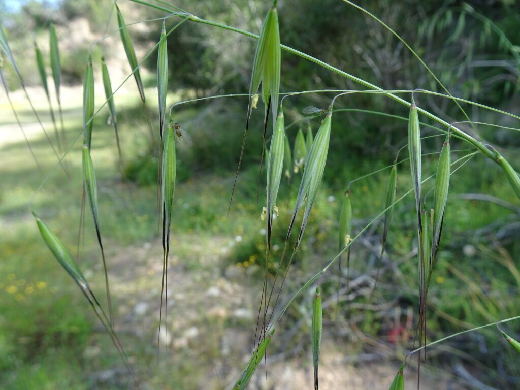 És una herba anual de 0,3-1 m, erecta o ascendent. Les fulles són glabres o ± piloses, amb el limbe linear-lanceolat i de 10-30 cm x 3-8 mm. La lígula és membranàcia, de 2-5 mm. Té la inflorescència en panícula, de 10-30 cm i sovint de tendència unilateral. Les espiguetes tenen 2-3 flors, totes articulades i separables, i amb les glumes semblants, de 18-32 mm i que ordinàriament no ultrapassen les flors. El lemma, de 13-25 mm, té dues setes o arestes terminals de 3-5 mm i una aresta dorsal de 2,5-5,5 cm.