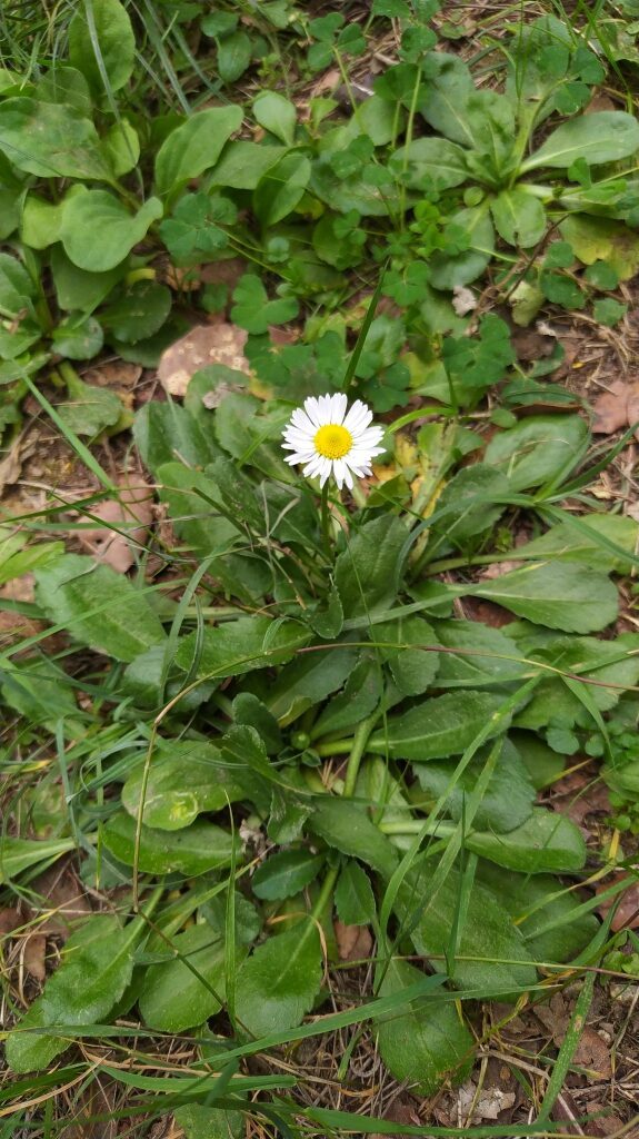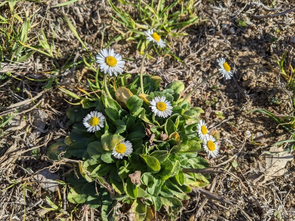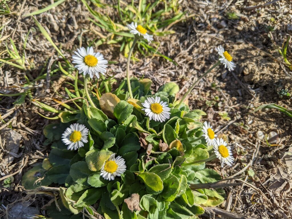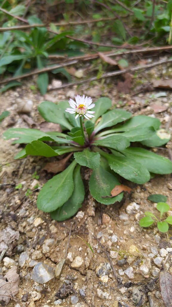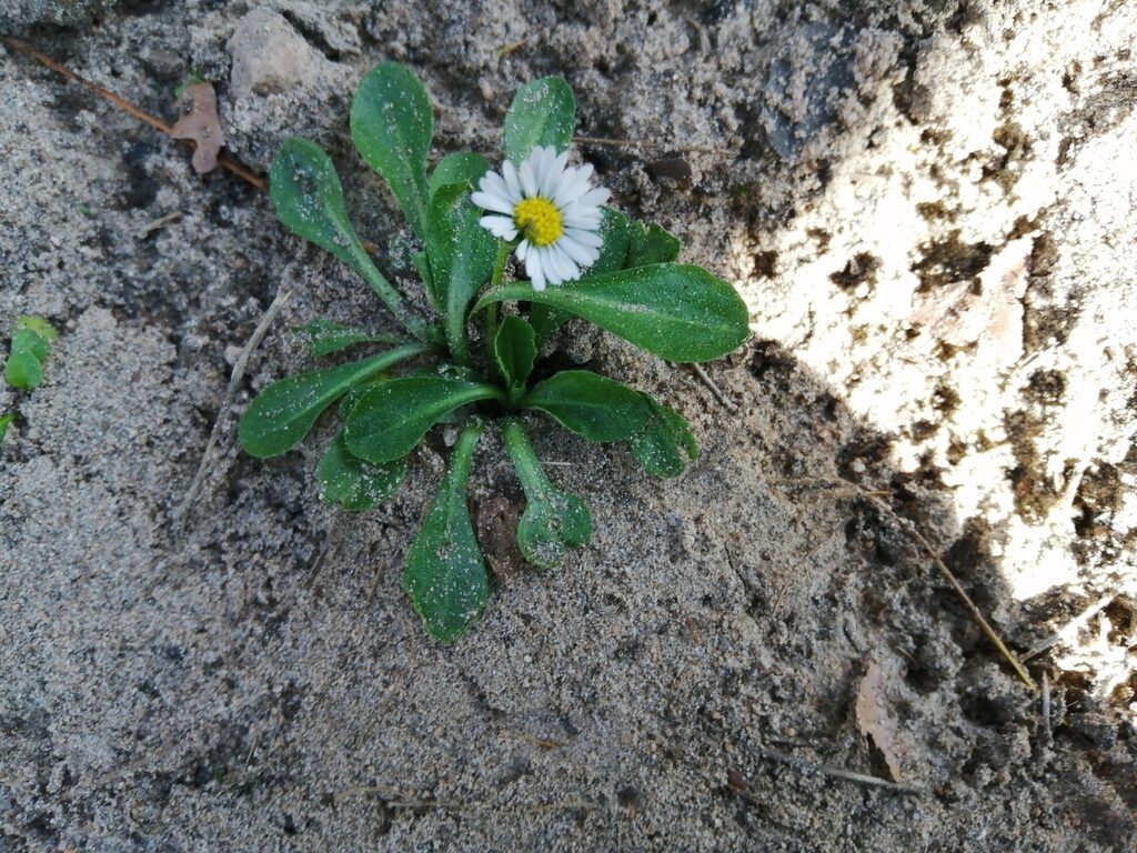 És una herba perenne de 5 a 25 cm, acaule, de rabassa gruixuda i carnosa amb les fulles ± aglomerades en roseta basal i estolons curts. Les fulles són pubescents o glabrescents amb el limbe obovat i bruscament contret en pecíol, de contorn ± crenat i àpex obtús normalment amb un sol nervi. El capítol de flors, d’1,5 a 3 cm de diàmetre, es troba al damunt del peduncle, que fa de 4 a 25 cm. Les bràctees de l’involucre són ordinàriament obtuses. Les flors externes tenen la lígula blanca, sovint tenyides de púrpura al revers o l’àpex; les centrals son tubulars i grogues, de vegades amb l’àpex vermellós a la maduració. Els fruits, en aqueni pilós, no tenen papus.
