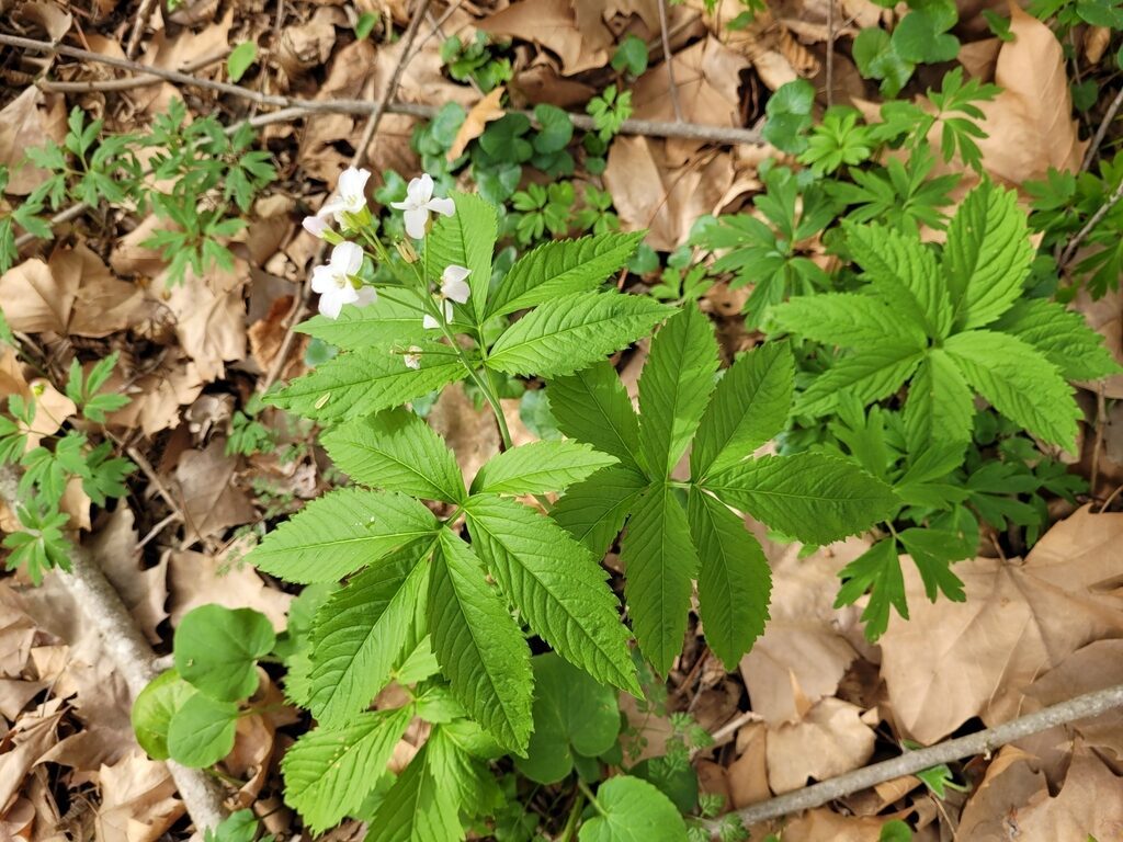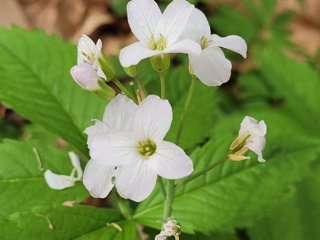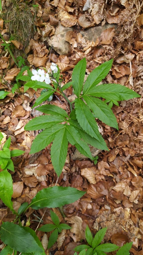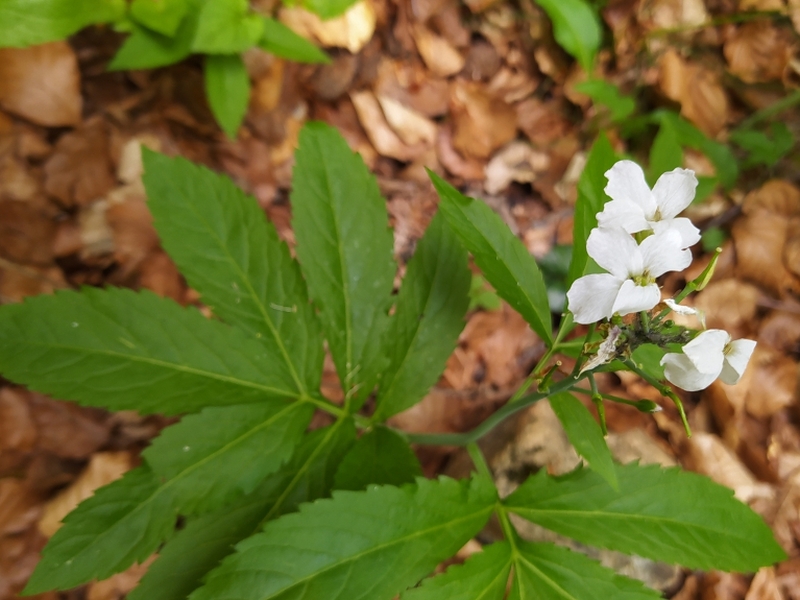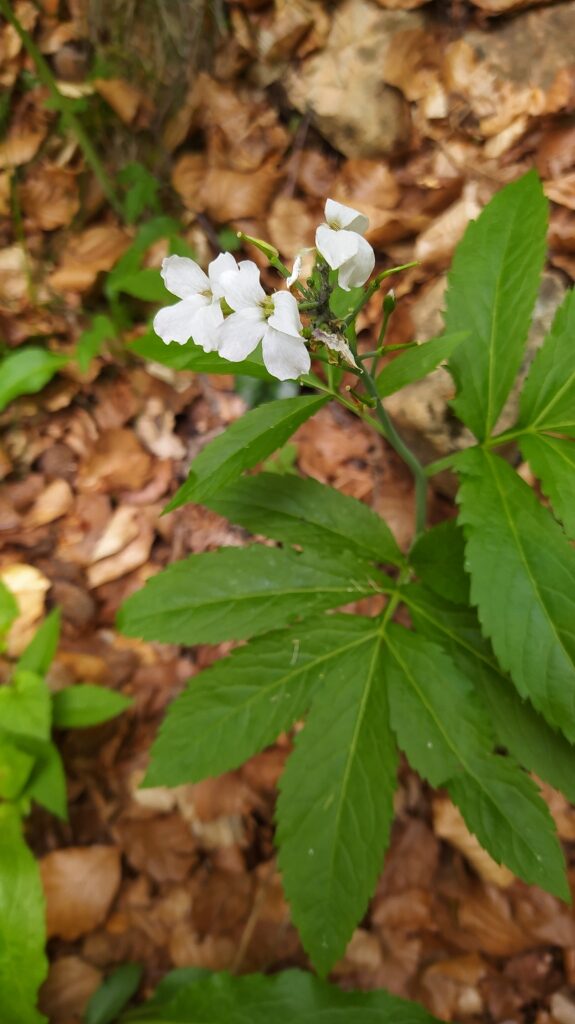 És una herba perenne de 30-60 cm, erecta, glabrescent o molt poc pilosa. El rizoma és cobert d’esquames obtuses d’1-2 mm. La tija és simple, flexuosa i sense fulles a la part baixa. Les fulles són peciolades, alternes a la summitat i pinnaticompostes amb 5-9 folíols lanceolats, dentats i aguts. La inflorescència és en raïm lax de 8-30 flors que tenen sèpals de 9-10 mm i pètals de 14-20 mm, de color blanc, sovint tendent a violaci o a rosa. Els fruits són síliqües de 40-80 mm de longitud amb els pedicels erecto-patents.