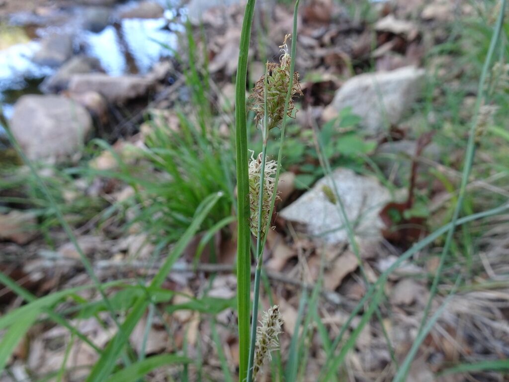 És una herba perenne de 20-60 cm, rizomatosa, glauca i amb les tiges trígones i les beines inferiors enteres. Les fulles, de 3-6 mm d’amplada, són més curtes que les tiges. La inflorescència té 2-3 espigues masculines i 2-4 de femenines. La bràctea inferior és foliàcia i sovint ultrapassa la inflorescència. Les glumes masculines són ovades, agudes o mucronades, brunenques i amb el nervi mitjà verdós; les femenines són lanceolades o bé ovades i apiculades i brunenques. Té 3 estigmes i utricles de 2-4 mm amb un bec curtíssim.