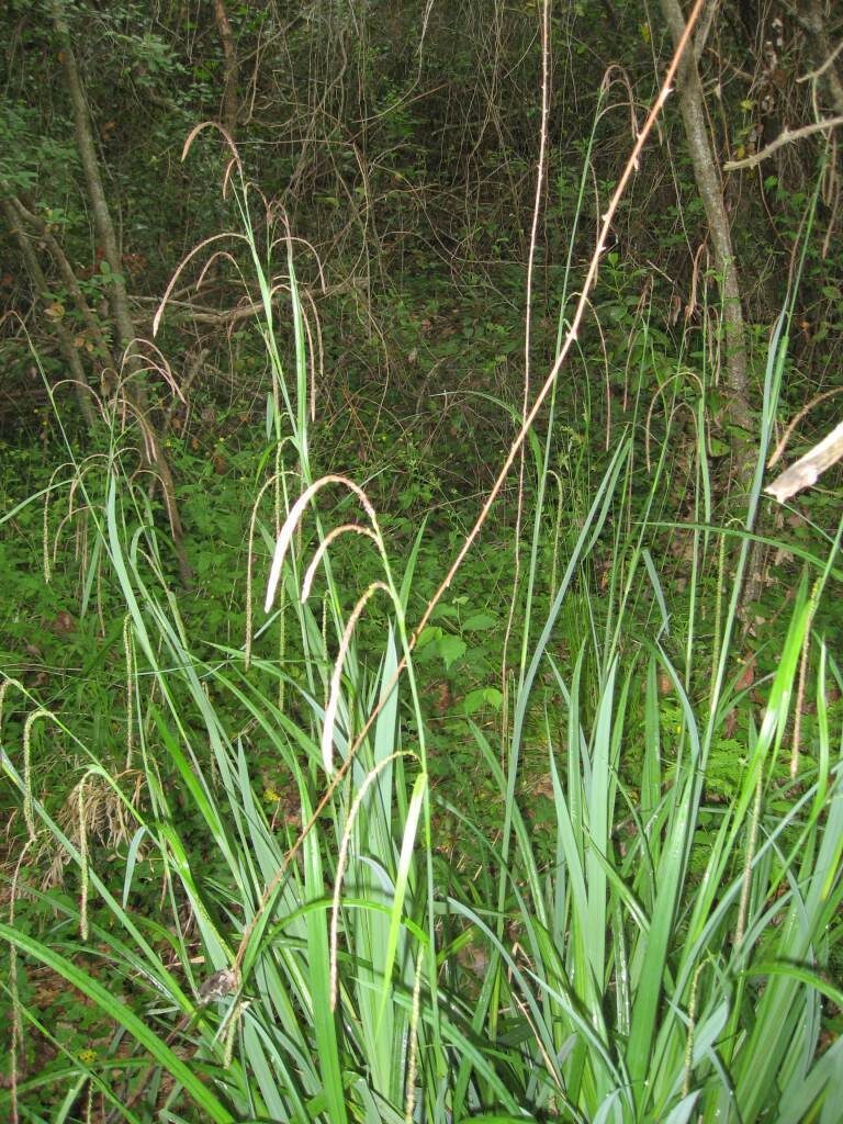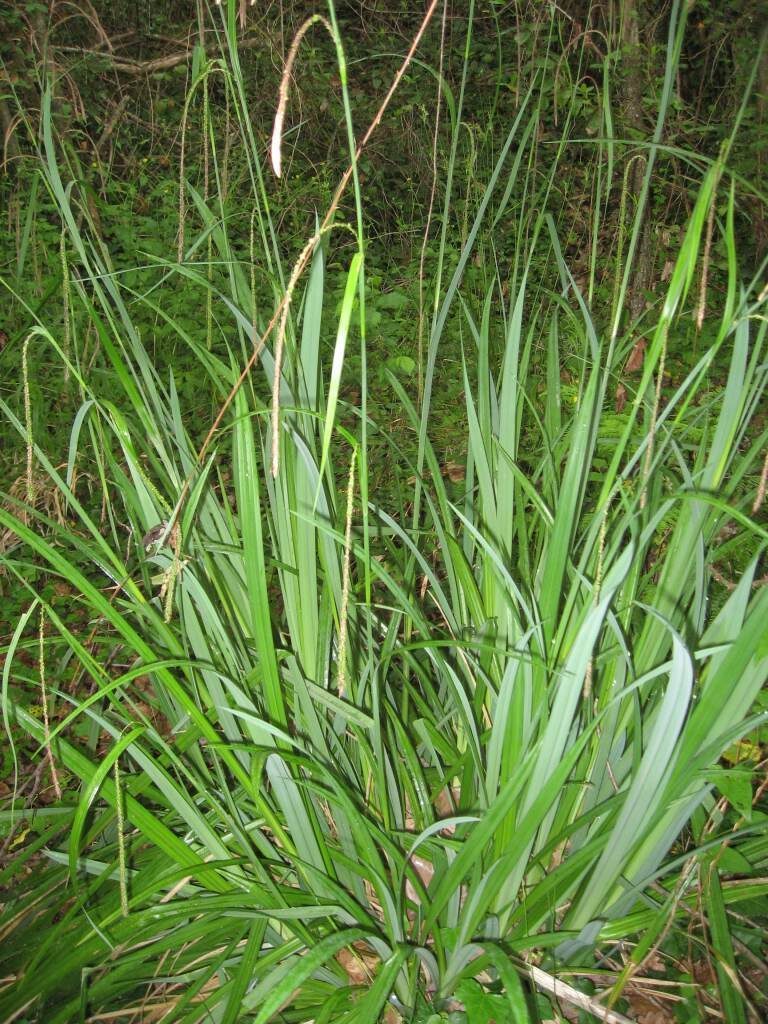 És una herba de 0,5-1,8 mm, robusta, cespitosa, glabra i amb tija és trígona, de 2-3 mm de gruix. Les fulles, de 10-20 mm d’amplada, són verdes i ± coriàcies; tenen 1 espiga masculina, rarament 2, de 5-10 cm de longitud i 4-6 espigues femenines denses, la inferior de les quals llargament pedunculada, les superiors sovint subsèssils amb la bràctea inferior foliàcia, de longitud poc inferior a la inflorescència i llargament embeinadora. Les glumes femenines són estretament ovades, aristades o mucronades i els utricles verdosos, de 3-3,5 mm i amb el bec curt.