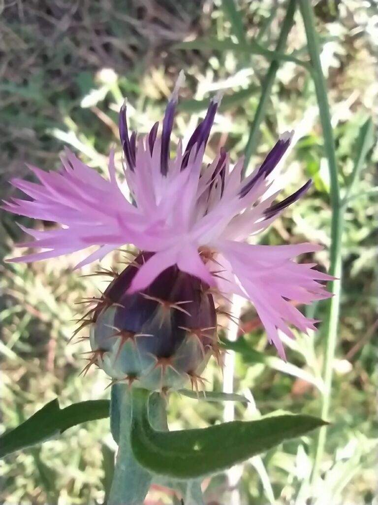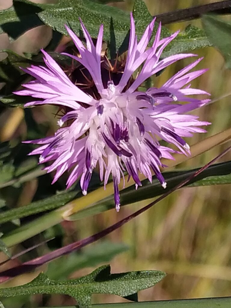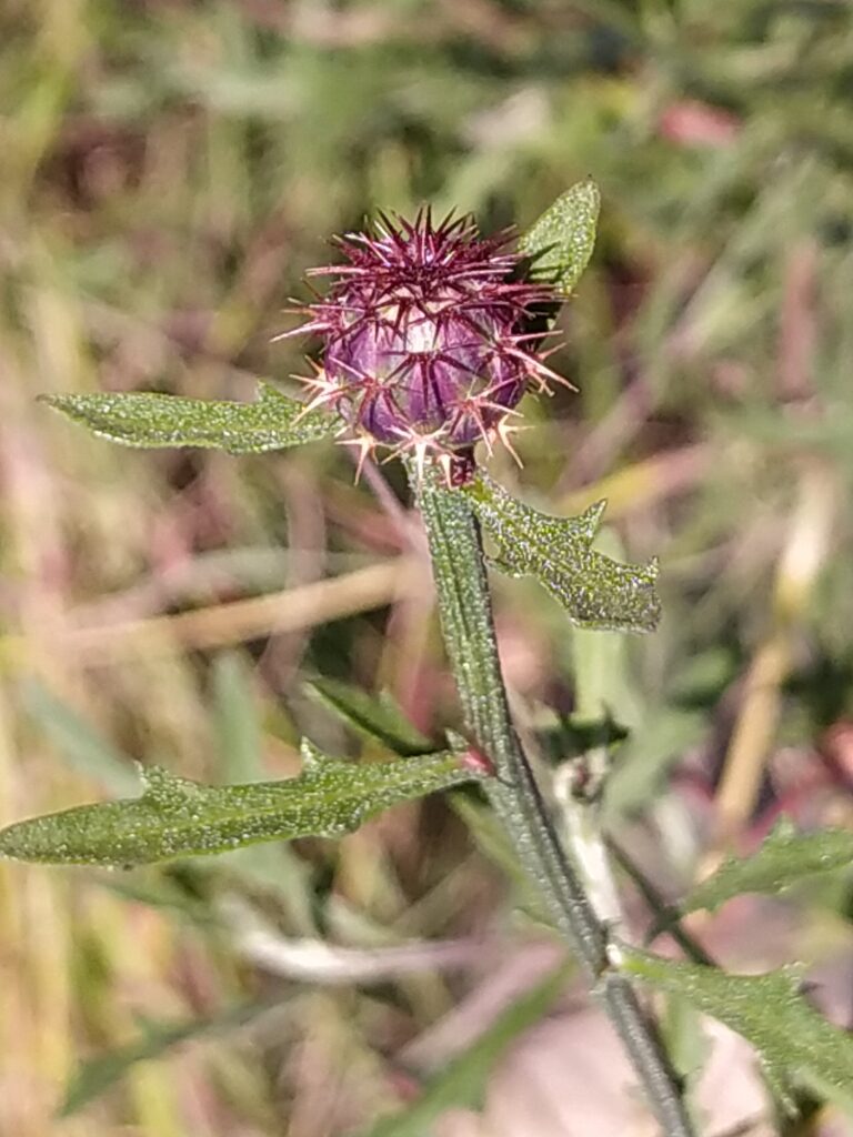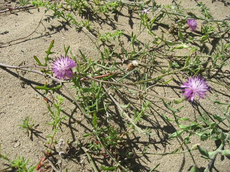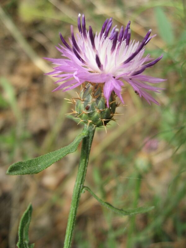 És una planta perenne de 10-50 cm, ascendent, decumbent o erecta, llenyosa a la base i ramificada. Les fulles són sèssils; les inferiors, bastant dividides; les superiors, més petites i menys dividides o quasi enteres. Les flors són totes tubulars amb la corol·la d’un rosa intens o purpuri i s’agrupen en capítols terminals d’1-2 cm. Estan envoltades per les bràctees espinoses de l’involucre, que són ± ovades i rematades per un apèndix de forma palmada amb 3-5 espinetes grogues totes molts semblants, de vegades ± atrofiades i en aquest cas amb 1-3 puntes curtes. Els fruits (aquenis) són allargats, de 3,5-5 mm, lleugerament comprimits, d’un groc palla amb línies longitudinals i marronoses a la maturitat.
