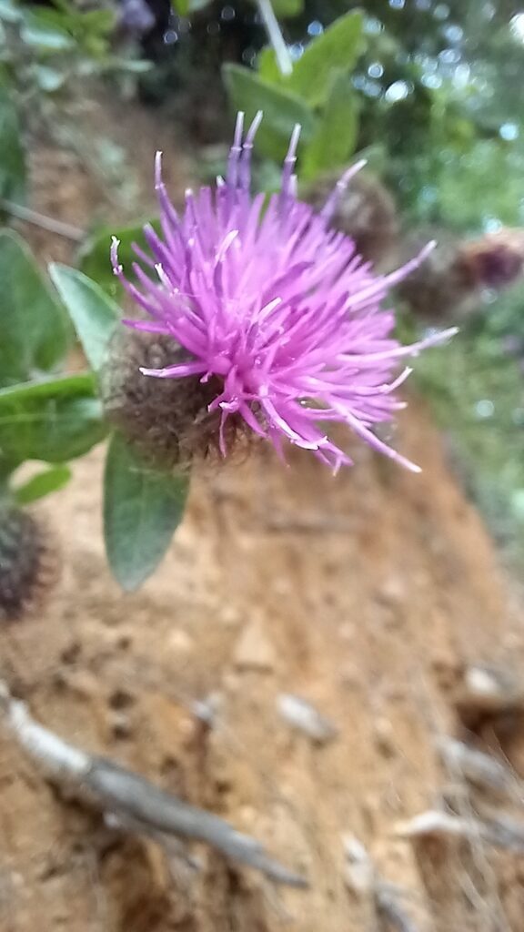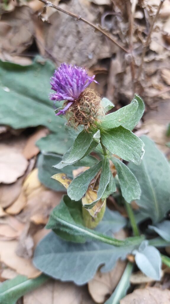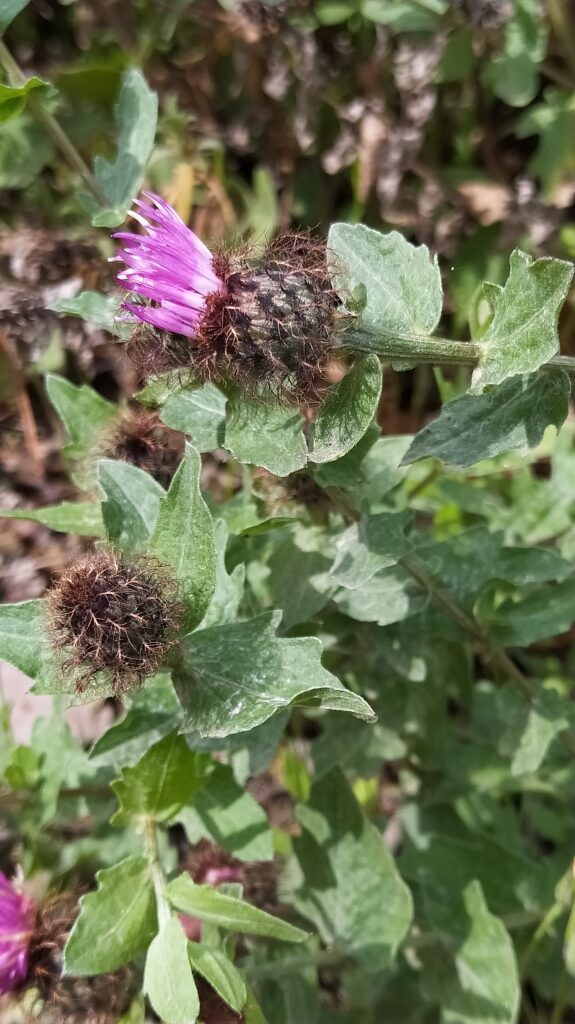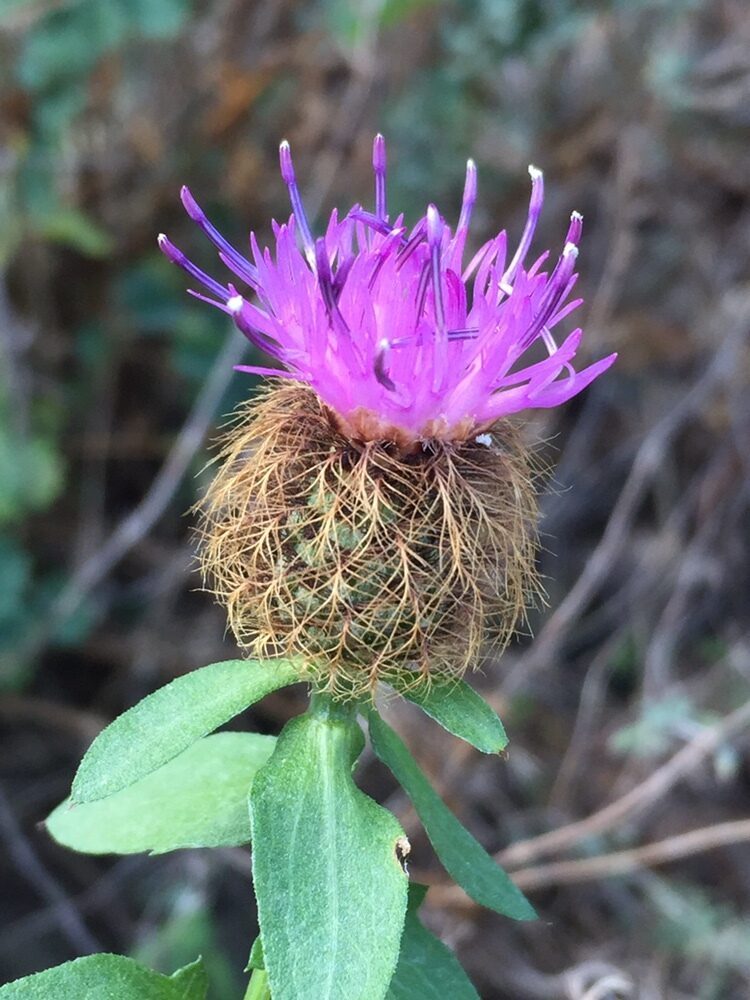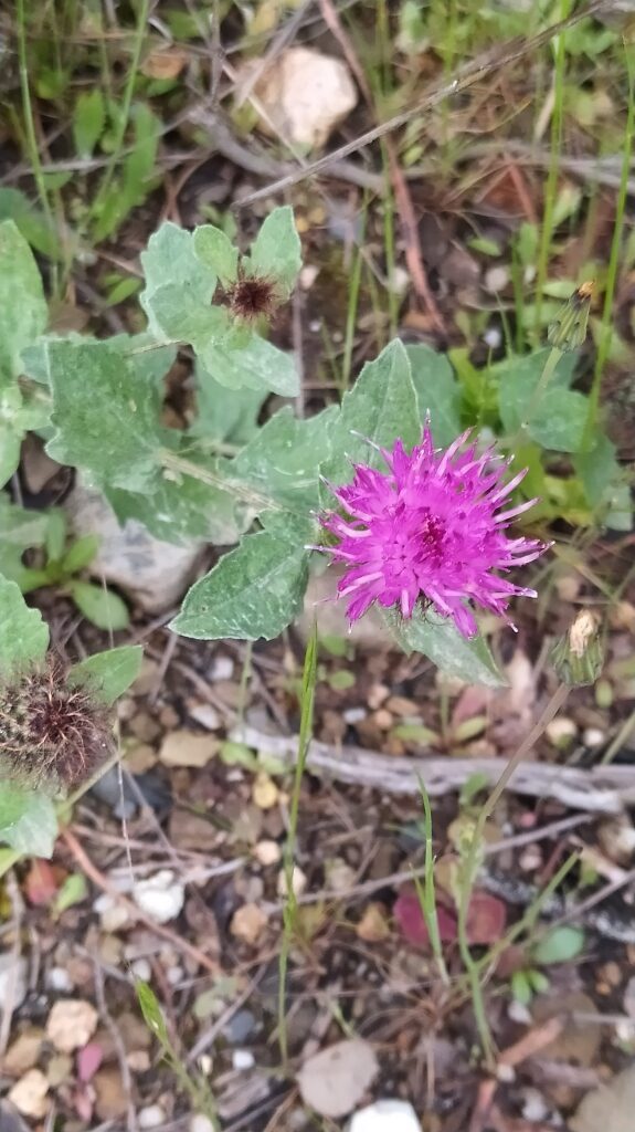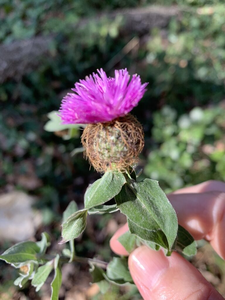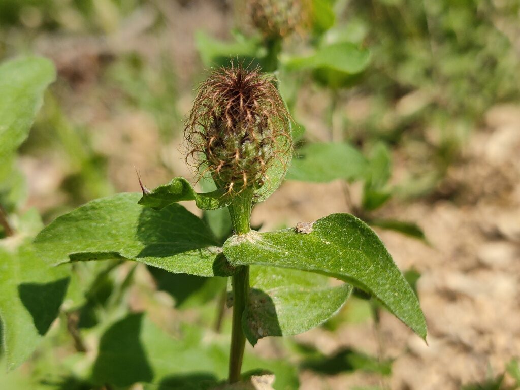 És una herba perenne de 10-50 cm, llenyosa a la base, rasposa, verdosa o ± grisenca amb pilositat lanuginosa. Les tiges són erectes, ascendents o a vegades ajagudes, simples o poc ramificades. Fulles, de fins a 9 cm, són ovades o amplament lanceolades, dentades o les inferiors partides; les basals són atenuades en un llarg pecíol i les caulinars sèssils, lleugerament auriculades i més petites a la part superior. Els capítols tenen l’involucre amplament ovoide, de 8-18 mm de diàmetre exclosos els apèndixs, amb les bràctees d’un groc-rogenc o brunenc, amb l’apèndix més fosc i recorbat, de longitud sovint superior a la bràctea, amb el cos linear, l’àpex subulat i el marge pectinat amb 10-15 parells de fímbries laterals. Les flors són d’un púrpura rosaci, totes hermafrodites i semblants, rarament les externes radiants. Els aquenis són de 3-3,5 mm, cilíndrics o obovoides, lleugerament comprimits i d’un groc palla; el papus és format per petites esquames agrupades en dues fileres.