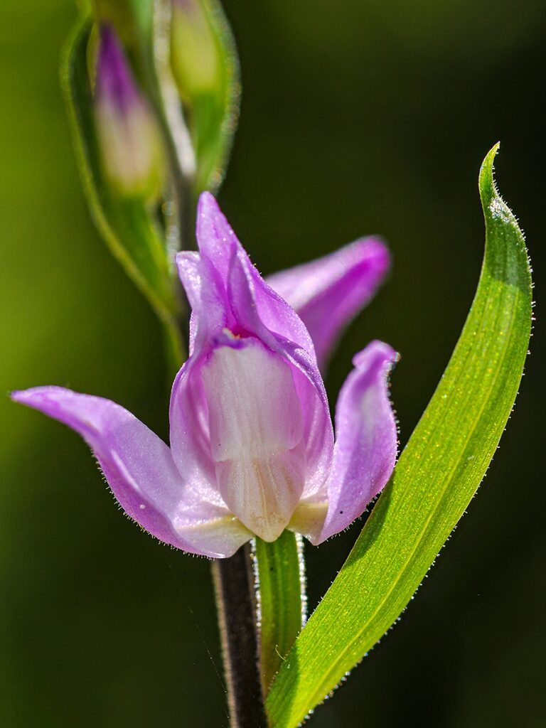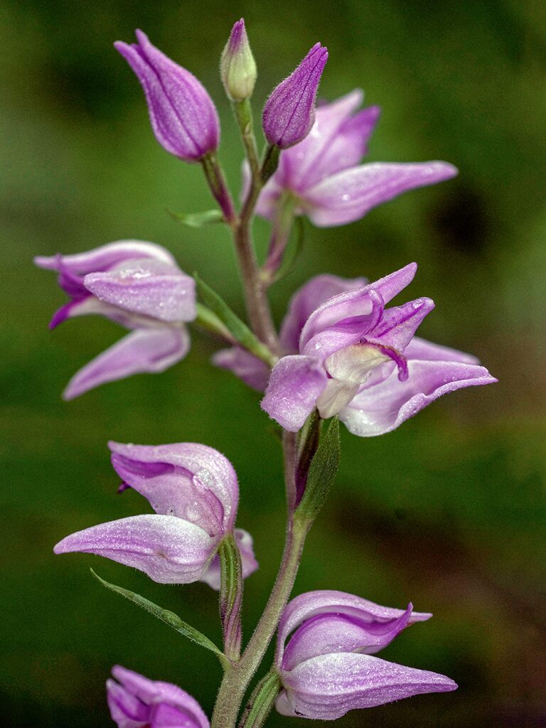 És una herba perenne de 10-60 cm amb rizoma curt. La tija és erecta, simple, estriada i pubescent-glandulosa a la part superior. Té de 5-8 fulles ± dístiques i oblongolanceolades, que fan de 5-12 cm. La inflorescència és una espiga terminal amb 3-10 flors d’un rosa intens o purpuri amb el label blanquinós, els tèpals aguts de 15-25 mm i l’ovari pubescent-glandulós. La càpsula, que és erecta i oblonga, conté granes planes i reticulades.