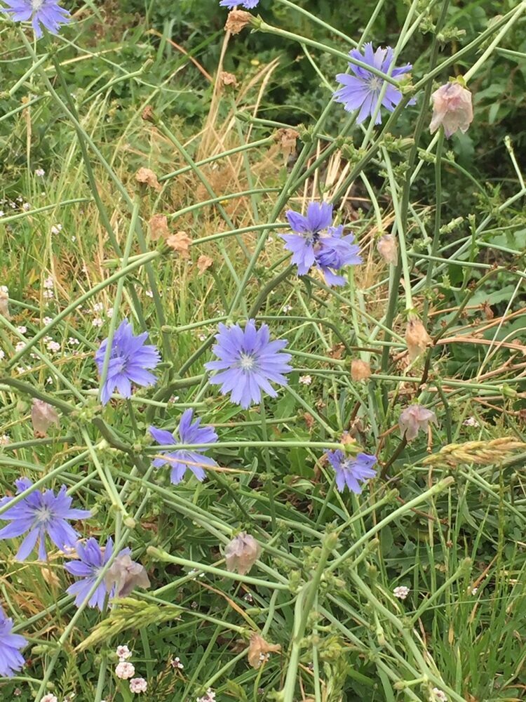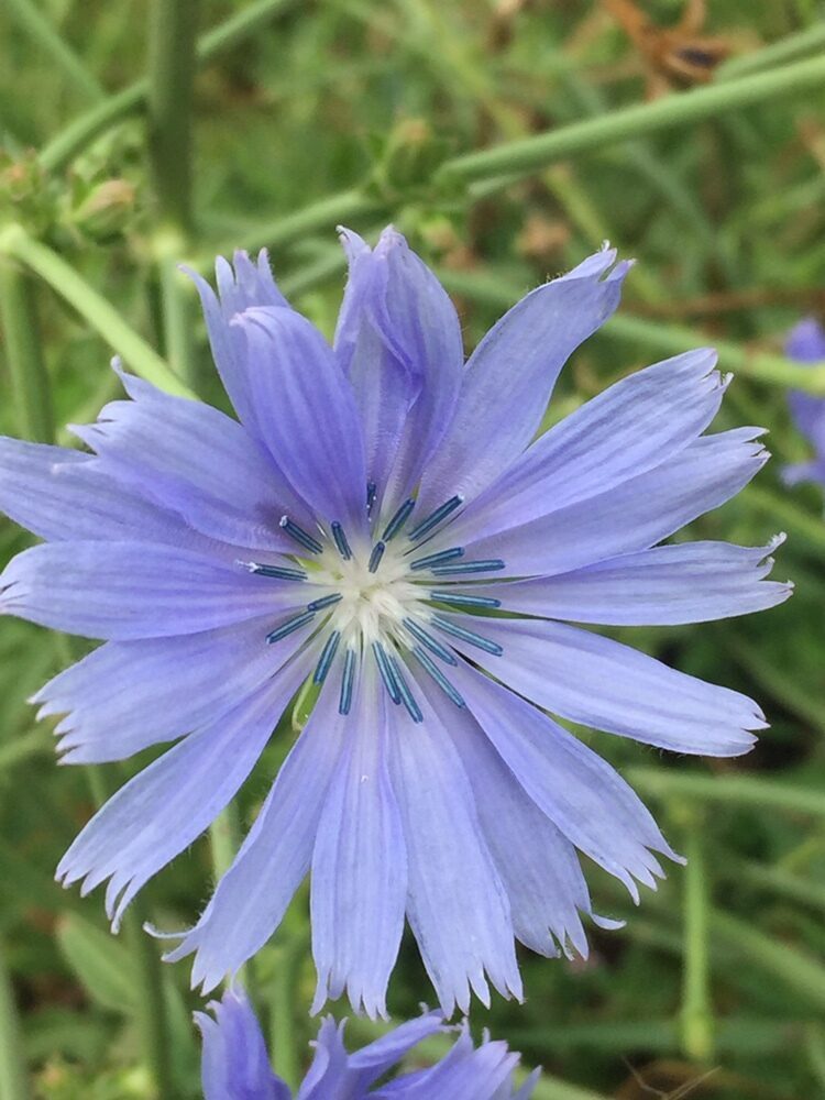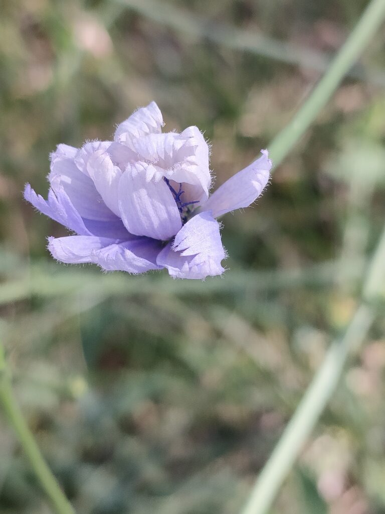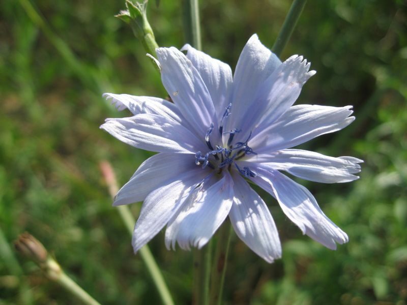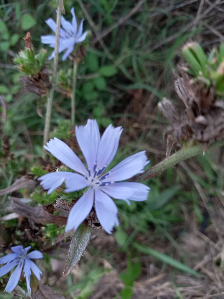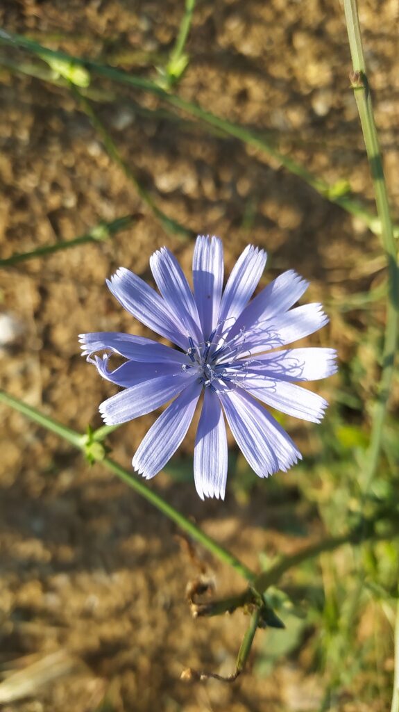 És una herba perenne de 30-100 cm, rizomatosa, molt ramificada i amb les branques molt obertes. Té les fulles basals en roseta de fins a 12 cm i amb el limbe partit amb les divisions normalment dirigides cap a la base de la planta, les caulinars semblants però més petites. El capítols són sèssils o pedunculats disposats al llarg de la tija en una inflorescència cimosa i amb l’involucre amb les bràctees en dos rengles, les exteriors ovato-lanceolades i les internes lanceolades. Té les flors blaves, totes ligulades i amb les anteres blaves. Els fruits són en aqueni, de 2-3 mm, ovoides o cònics i amb el papus format per esquames blanques curtes.