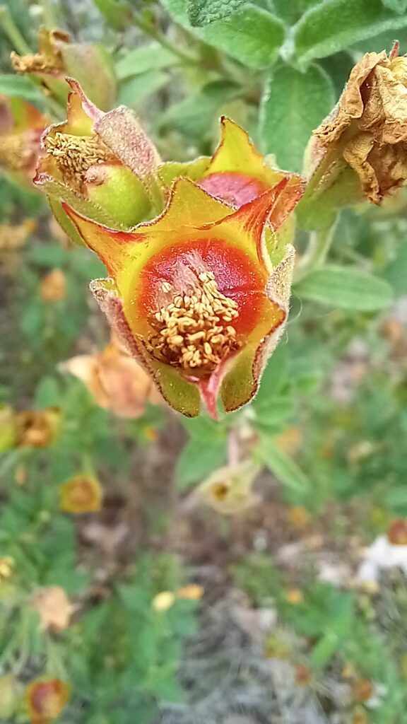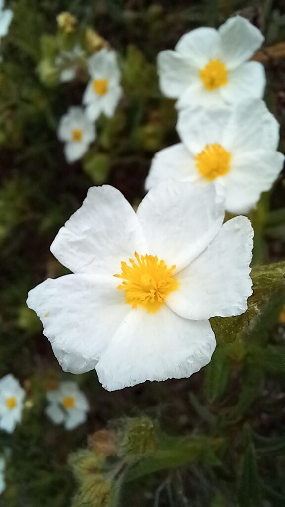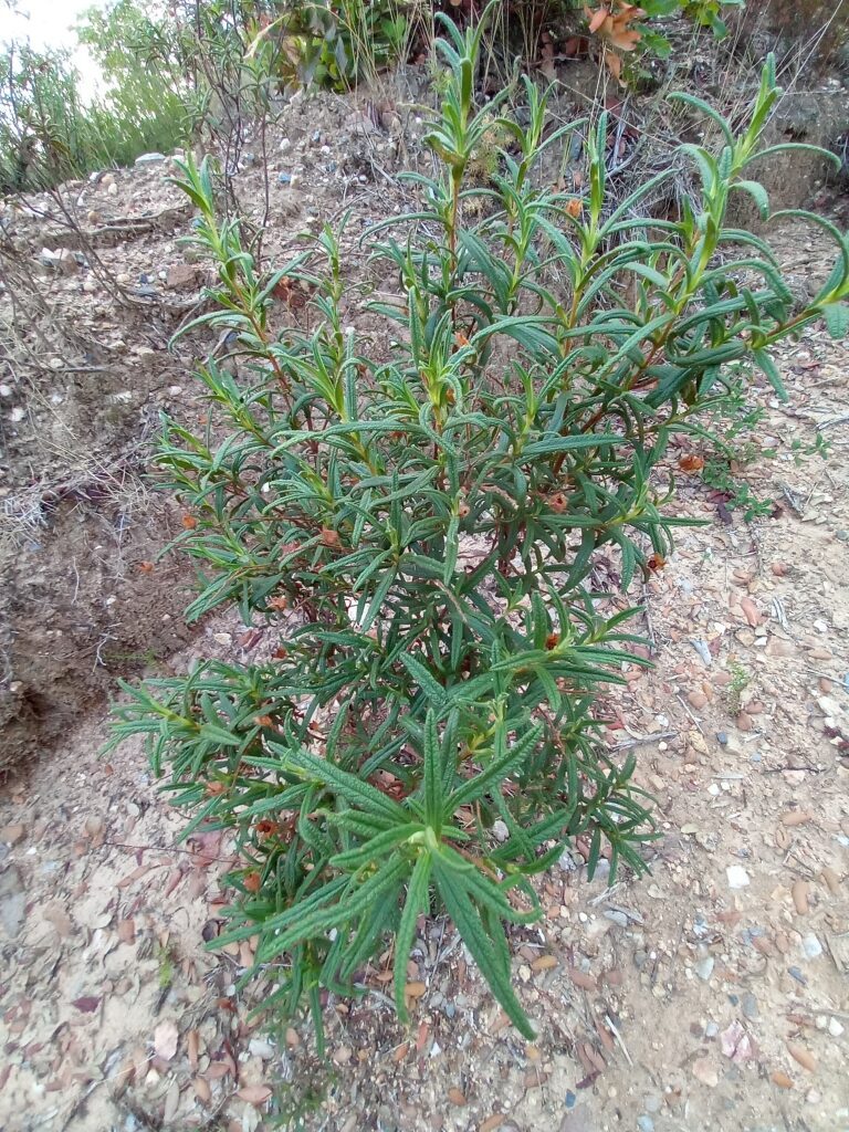 És un arbust de 50-150 cm, molt ramós, viscós i olorós, que té les branques erectes i els pèls patents. Les fulles tenen de 15-45 mm de llargària i són subsèssils, linear-lanceolades, trinèrvies prominents pel revers, verdes per les dues cares, i amb el marge revolut. La inflorescència és en cima ± escorpioide, unilateral i amb 2-9 flors que porten 5 sèpals pilosos, tots semblants, de 7-14 mm de longitud, acuminats i amb la base lleugerament cordiforme, pètals de 9-14 mm, blancs sovint tacats de groc a la base i obcordiformes, estams nombrosos, desiguals i més llargs que el pistil, i ovari pubescent amb l’estil molt curt. El fruit és en càpsula de 5-7 mm, globulosa, glabra, obtusa i amb granes d’uns 1,5 mm, reticulades.