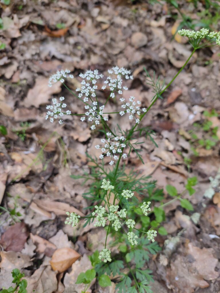 És una herba perenne de 10-60 cm, erecta, ± ramificada i glabrescent o poc pilosa. La tija florífera és generalment simple o poc ramificada, nascuda d’un tubercle ± globulós, prima i ± flexuosa a la part subterrània. Les fulles basals, amb el pecíol en part subterrani, són pinnatisectes amb els segments relativament amples i molt propers entre ells; les fulles superiors són pinnades amb lacínies nombroses. La inflorescència està composta d’una umbel·la de 3-7 cm, amb 4-12 radis, amb involucre nul o amb 1-2 bràctees i l’involucel amb 2-5 bractèoles. Els pètals són blancs i ± emarginats. El fruit és ovoide, comprimit pels costats i amb costes filiformes.