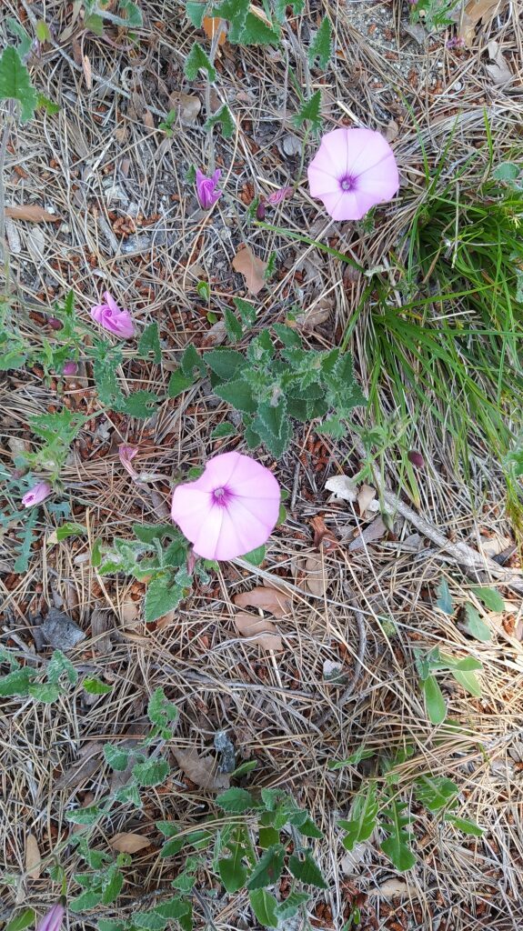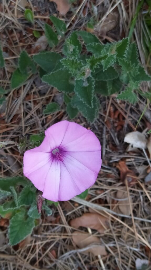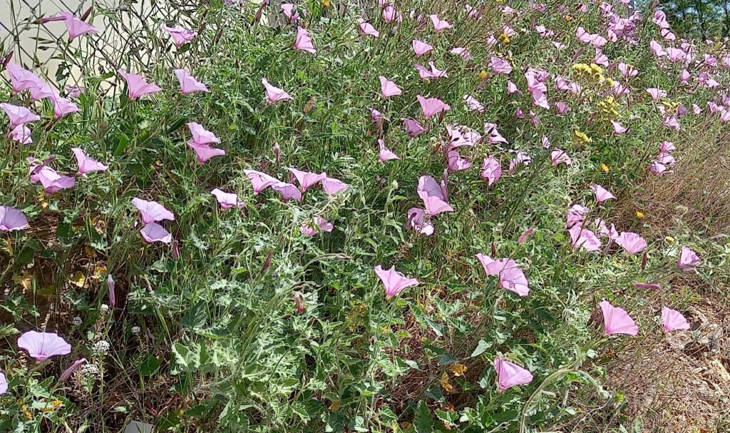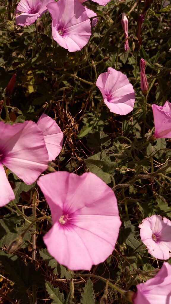 És una herba de 0,3-2 m, enfiladissa, amb la base llenyosa, de rabassa gruixuda i pilosa amb pèls patents blanquinosos. Les fulles tenen un pecíol d’1-6 cm, de limbe triangular cordiforme i ± auriculat, les inferiors de contorn irregularment lobat o crenat i les superiors de pecíol més curt i profundament dividides. La inflorescència és en cimes d’1-3 flors amb el peduncle de 30-100 mm normalment més llarg que la fulla corresponent i dues bractèoles ± oposades, linears-lanceolades i agudes; el calze és de tendència campanulada i la corol·la de 3-4 cm en forma d’embut i de color de rosa rarament blanca. El fruit és una càpsula més llarga que el calze, esfèrica, sense pèls i amb 4 granes marronoses o negroses i tuberculades.