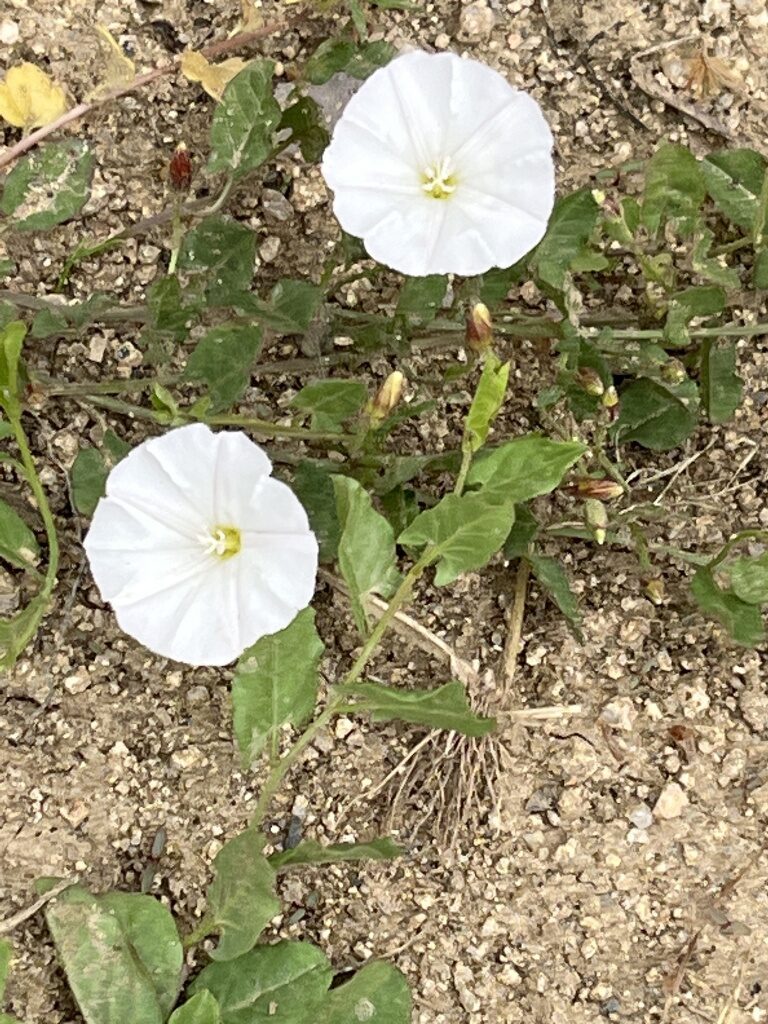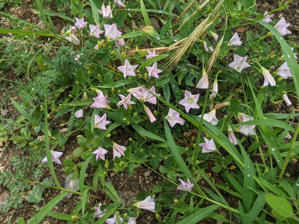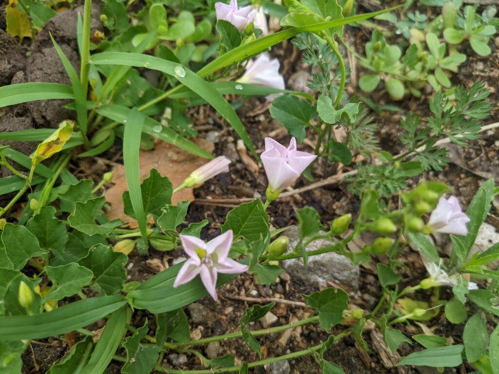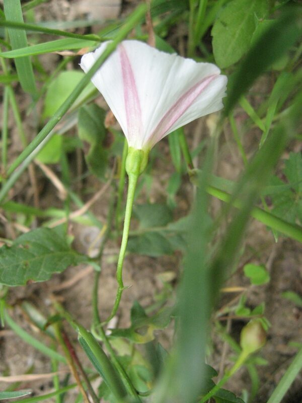 És una herba de 20-100 cm, decumbent o enfiladissa, sense pèls o de pilositat variable, i amb rizoma prim i profund. Les fulles, de 10-75 mm, tenen el pecíol variable i el limbe hastat o més o menys triangular que tendeix a formar aurícules normalment agudes a la base. Les flors neixen a l’axil·la de les fulles i són suportades per un peduncle de 15-60 mm, igual o més llarg que la fulla corresponent. Els sèpals tenen l’àpex obtús i sovint mucronat i la corol·la en forma d’embut de 15-25 mm de longitud, i és blanca o rosada. El fruit és una càpsula de 6-8 mm de longitud, glabra, esfèrica o el·lipsoidal, més llarga que el calze i conté 1-4 granes de color marró fosc i amb la superfície puntejada.