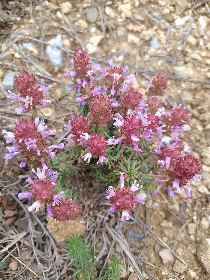 És una mata ± llenyosa de 10-30 cm i amb les tiges erectes o ascendents i pubescents. Les fulles són esparses, patents o reflexes, amb el limbe linear, l’àpex obtús i el marge enter o ± espinoso-denticulat. Les inflorescències són en raïms terminals, densos i espiciformes. Les flors són zigomorfes, amb el calze campanulat amb 5 lòbuls tacats de negre i 10 o més apèndixs exteriors d’1-3 mm en forma d’aresta; la corol·la és rosa, tubulosa i bilabiada amb els segments bipartits; conté 5 estams desiguals que sobresurten de la corol·la. La càpsula és esfèrica i amb 5 valves.