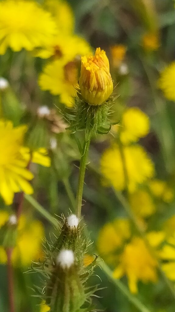 És una herba anual de 30-80 cm, erecta i ramificada i poc pilosa exceptuada la summitat que és híspida. Les fulles són oblongo-lanceolades, pinnatífides o pinnatipartides, les caulinars més petites amb aurícules molt agudes. La inflorescència és paniculiforme i laxa de capítols pedunculats i erectes, l’involucre de 8-10 mm està cobert de setes rígides amb la base engruixida; les flors són grogues i totes ligulades. Els aquenis són de 3-5 mm amb el papus de 4-5 mm blanc que ultrapassa poc l’involucre.