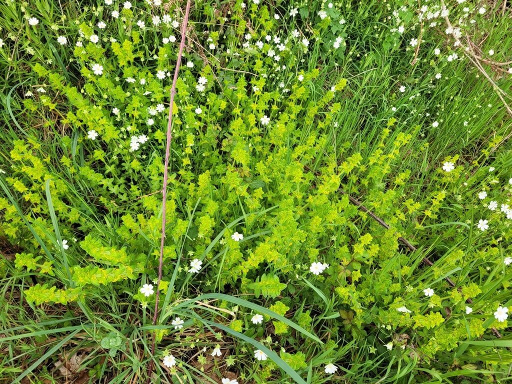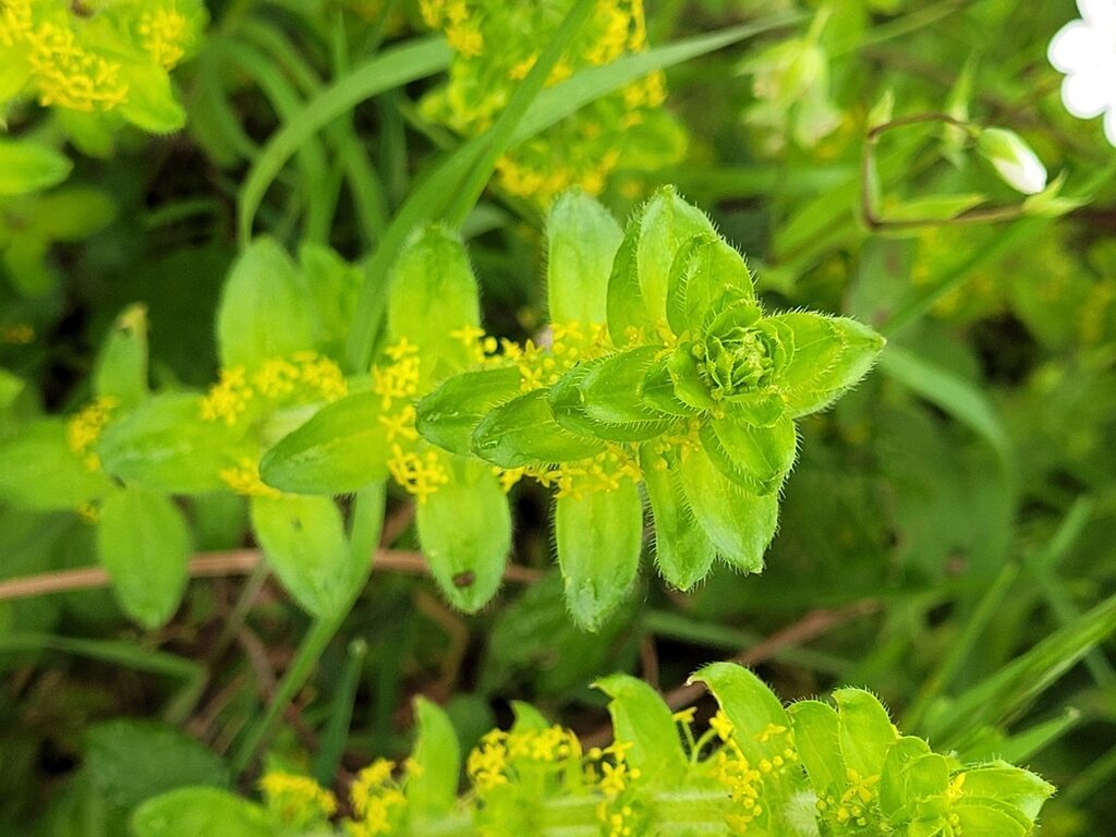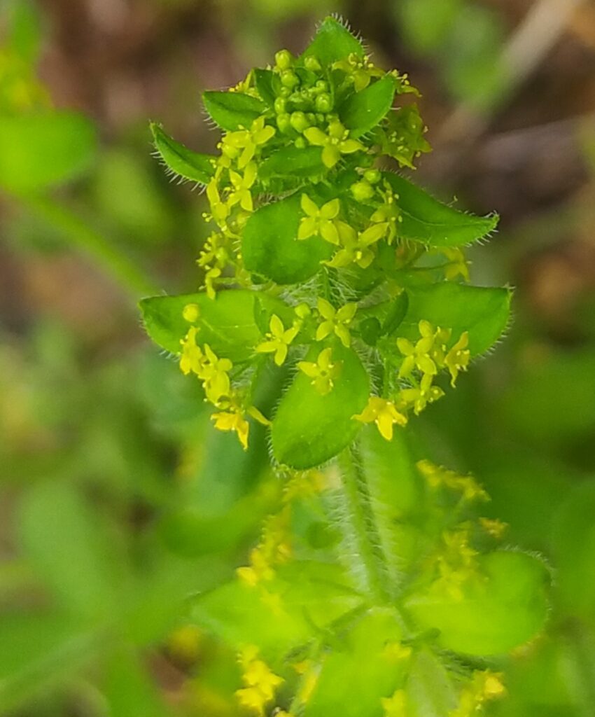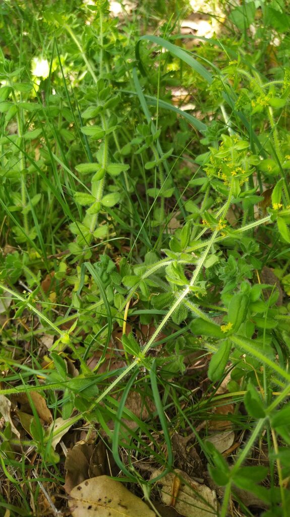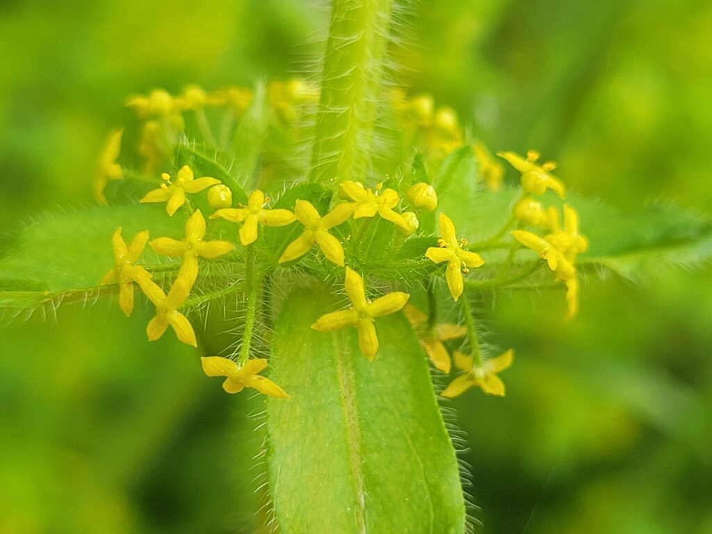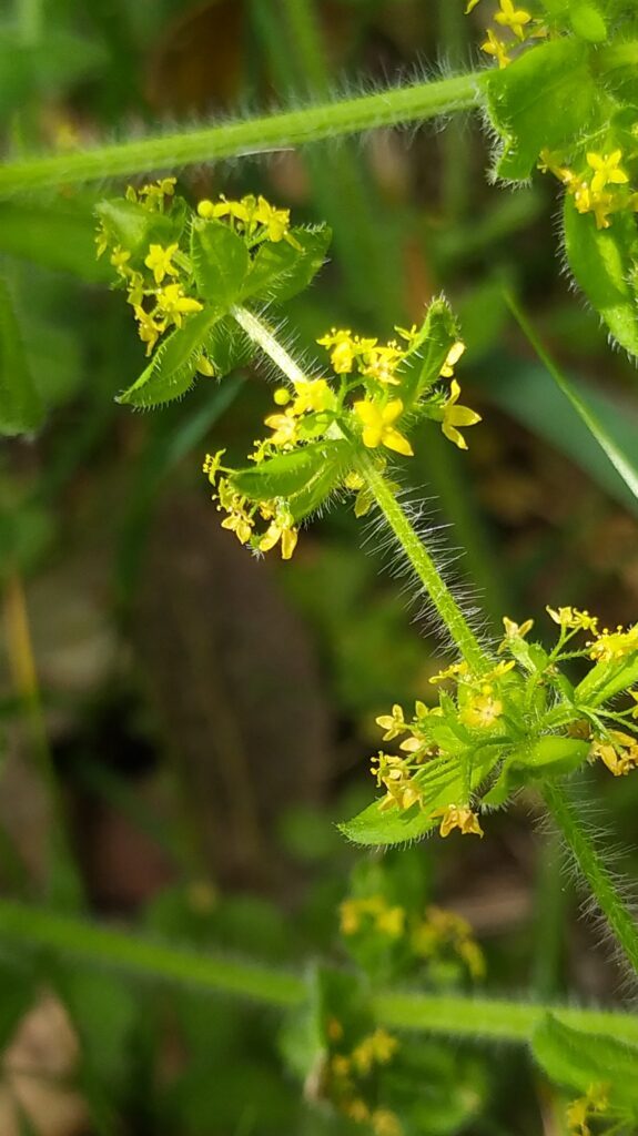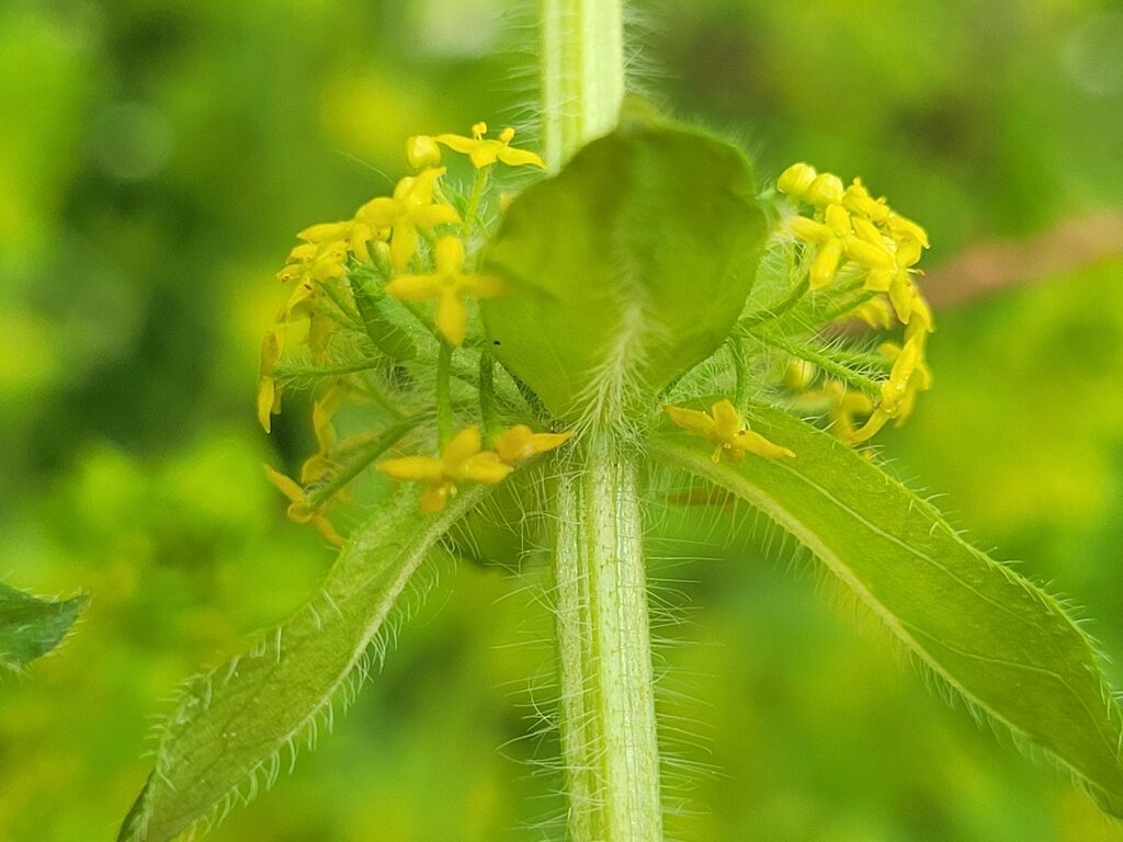 És una herba perenne de 20-60 cm, ascendent, pilosa i amb les tiges densament cobertes d’una pilositat patent. Les fulles són ovades, planes, sèssils, trinervades, piloses, disposades en verticils de 4 i ordinàriament molt més curtes que els entrenusos. La inflorescència presenta cimes de 5-11 flors tetràmeres, flairoses, amb peduncles pilosos i amb 2 bràctees foliàcies; la corol·la és de 2-3 mm, groga, i els estils són dividits fins a la base. El fruit té d’1,8-2,7 mm i és glabre.