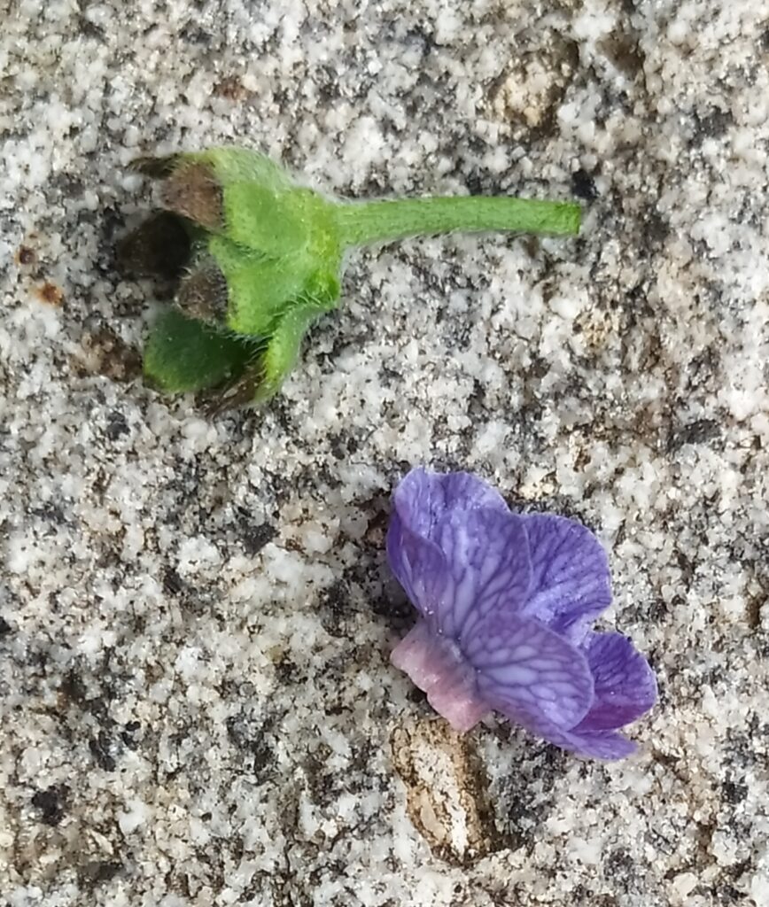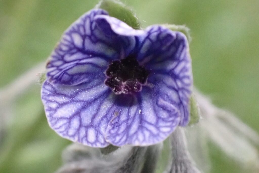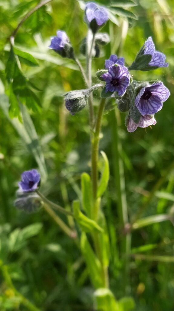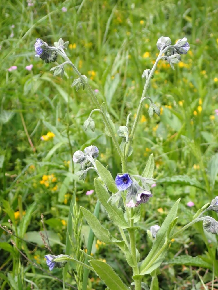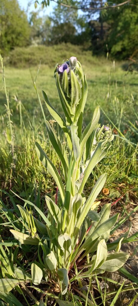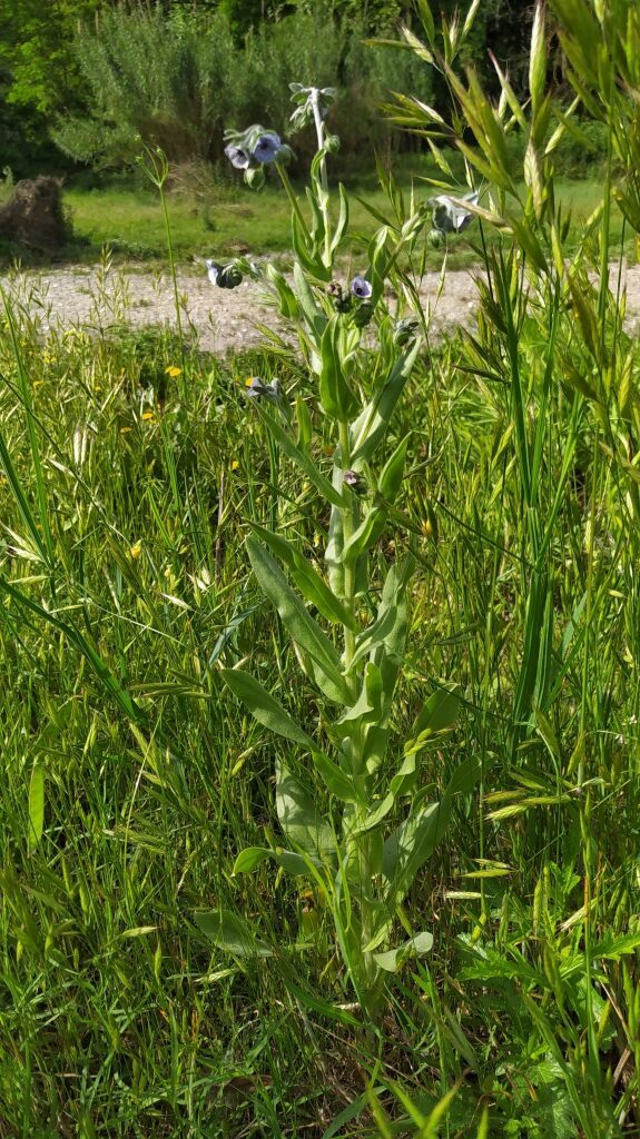 És una herba biennal de 20-60 cm, pubescent-tomentosa i erecta. Les fulles basals són en roseta, oblongo-lanceolades i atenuades en pecíol; les caulinars són progressivament més petites i les superiors, sèssils i arrodonides a la base. La inflorescència és ramificada amb nombroses cimes disposades en panícula. Les flors són pedicel·lades amb el calze amb els segments oblongs de 6-8 mm i hirsuts, i la corol·la blava amb venes violetes, amb un tub d’1-2 mm i els segments patents, plans i glabres per la cara exterior. L’estil, en el fruit, fa de 2-4 mm. Els mericarpis madurs són convexos, sense marge engruixit i densament coberts d’agullons curts mesclats amb petits tubercles.