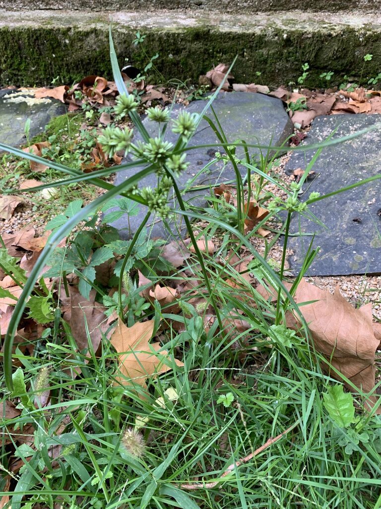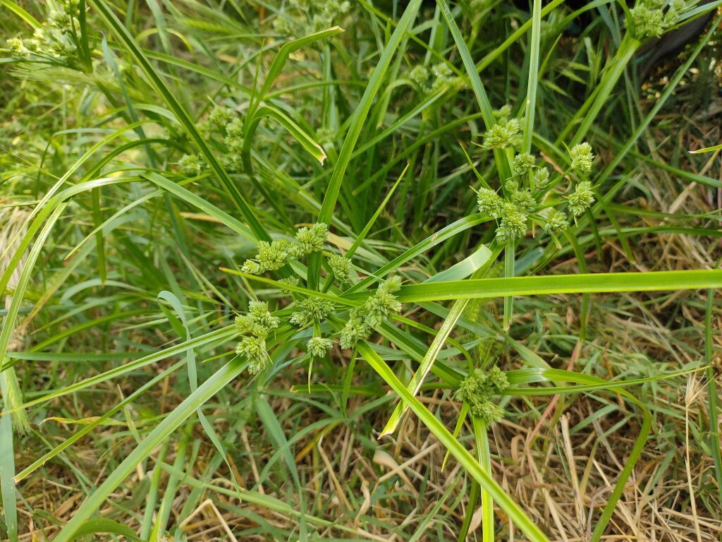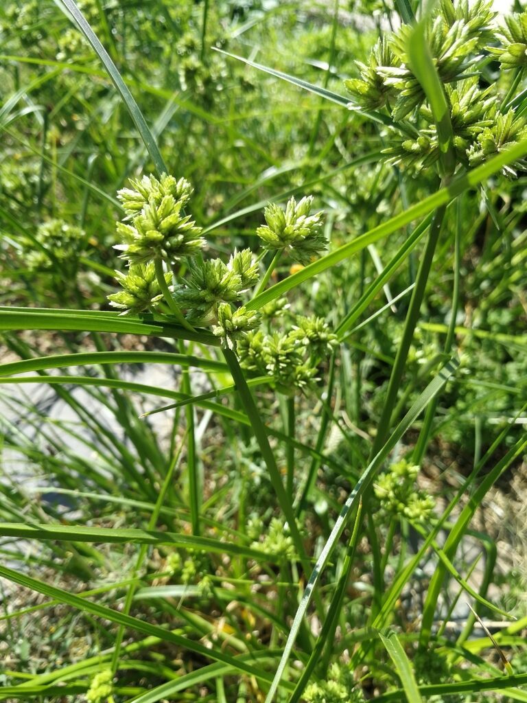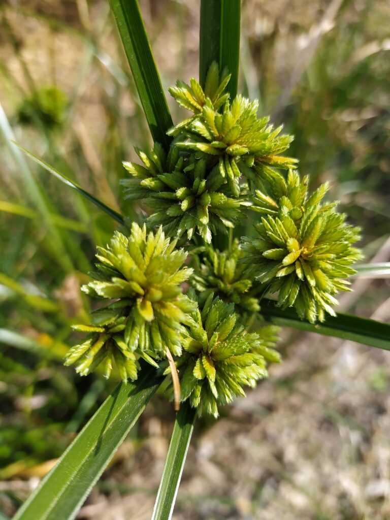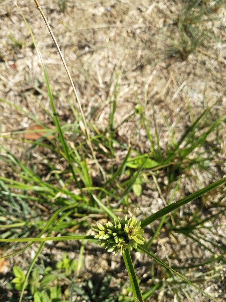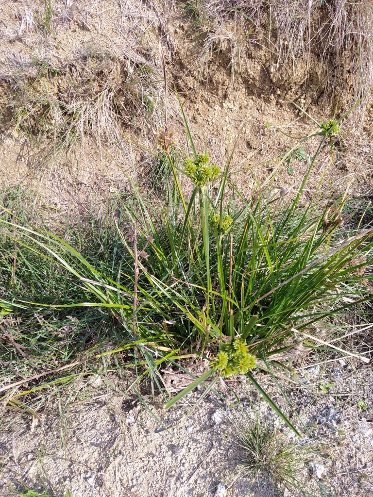 És una herba perenne de 20-100 cm, glabra i amb la tija trígona. Les fulles de 4-10 mm d’amplada són en general més curtes que la tija. La inflorescència és una umbel·la amb 8-10 radis desiguals, 4-8 bràctees involucrals i glomèruls esferoïdals densos de 10-25 espiguetes que són compactes groguenques o d’un verd pàl·lid amb 14-30 flors de 3 estigmes i glumes de 2-3 mm, agudes d’un verd clar ± uniforme. El fruit és una núcula trígona.