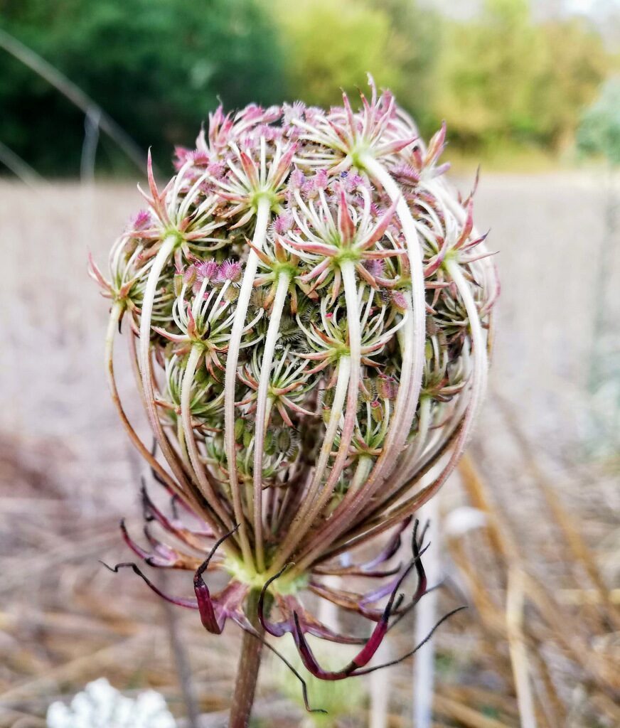 És una herba de 10-150 cm, normalment biennal, erecta, ± ramificada i glabrescent o laxament pubescent. Les fulles són molt dividides, les inferiors peciolades, les superiors subsèssils, més petites i freqüentment dividides en lacínies linears. Les inflorescències són llargament pedunculades amb les umbel·les planes a la floració, normalment amb una flor central negra o vermellosa i fortament contretes a la fructificació; l’involucre té els radis incurvats i prims i les bràctees dividides en lacínies linears i poc més curtes que els radis; les flors tenen els pètals blancs o ± rosacis i emarginats. Els fruits (els mericarpis) tenen agullons de 0,6-1 mm.