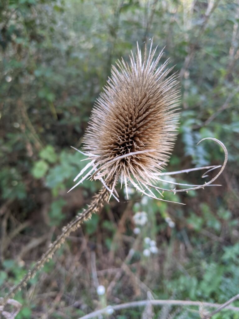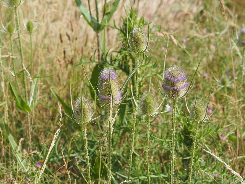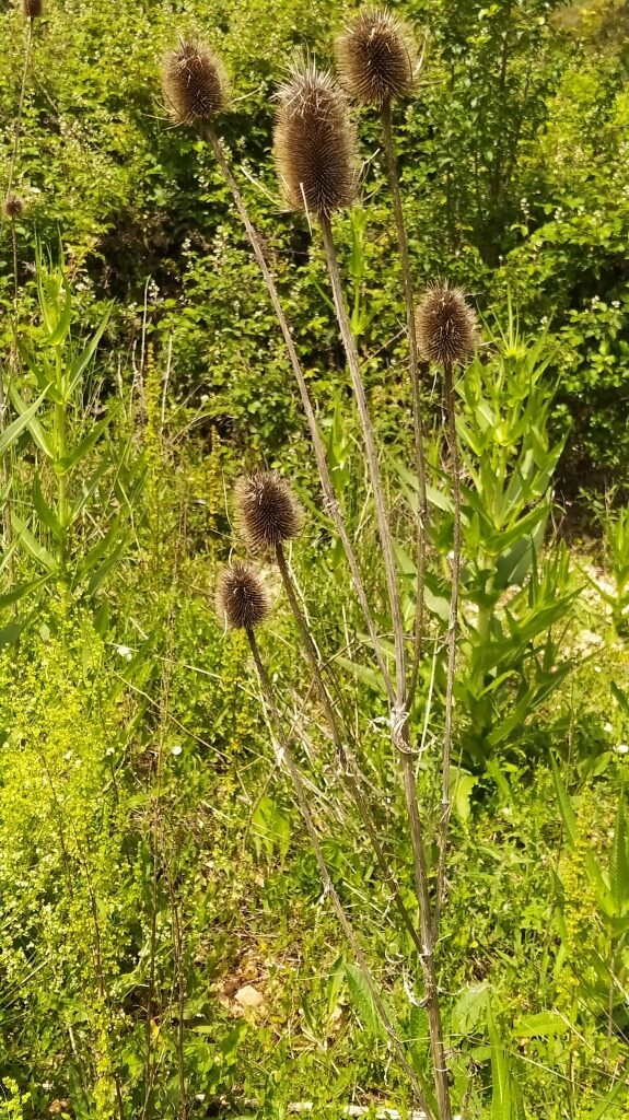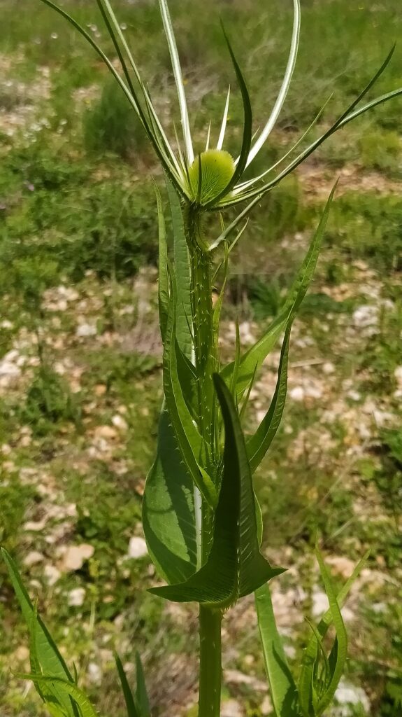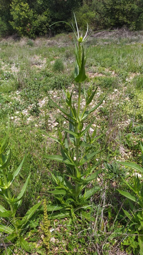 És una herba biennal d’1-2,6 m, erecta, robusta, ± ramificada i glabrescent. Té la tija angulosa i aculeada. Les fulles basals, en roseta, són oblongues, enteres i curtament peciolades; les caulinars són més petites, sèssils i sovint ± connates, lanceolades i aculeades, principalment al nervi central. Les inflorescències són capítols ovoides llargament pedunculats. Les bràctees de l’involucre són molt més grans que les esquames del receptacle. Les flors són violàcies, de longitud semblant a les esquames del receptacle i s’obren en una zona circular que ascendeix progressivament cap a l’àpex del capítol. Els fruits es troben en aquenis de 3-5 mm.