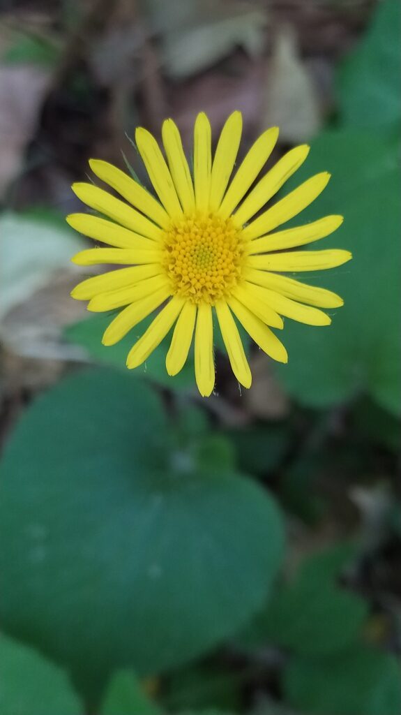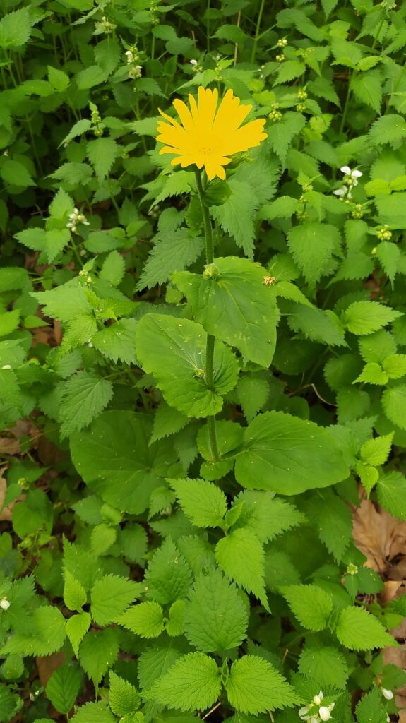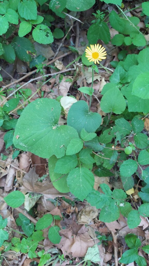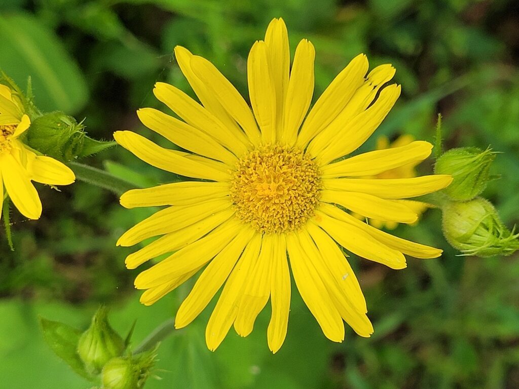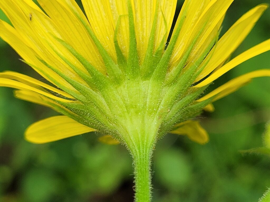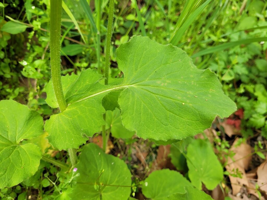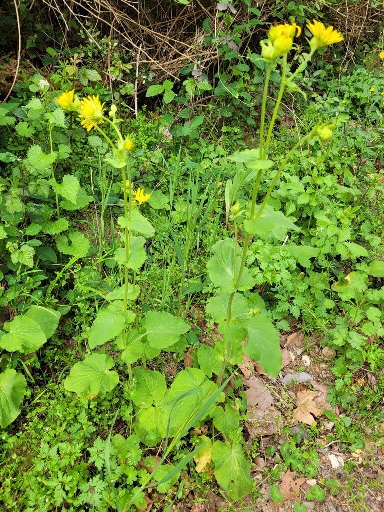 És una herba perenne de 30-80 cm, erecta, pilosa i amb estolons subterranis. El rizoma és cobert de flocs de pèls sedosos. La tija és poc foliosa, les fulles basals són llargament peciolades amb el limbe ovato-orbicular i el contorn dentat o subenter. Les fulles caulinars inferiors són semblants a les basals, però més petites. Les caulinars superiors són ovatolanceolades, sèssils i amplexicaules; de vegades la part inferior té forma de pecíol amplament alat i auriculat a la base. Els capítols de la inflorescència són grocs i mesuren de 3-6 cm de diàmetre; estan agrupats en corimbe terminal. L’involucre té les bràctees glanduloses, ovatolanceolades terminades en una llarga punta setàcia. Les flors externes són ligulades i les interiors, tubulars.