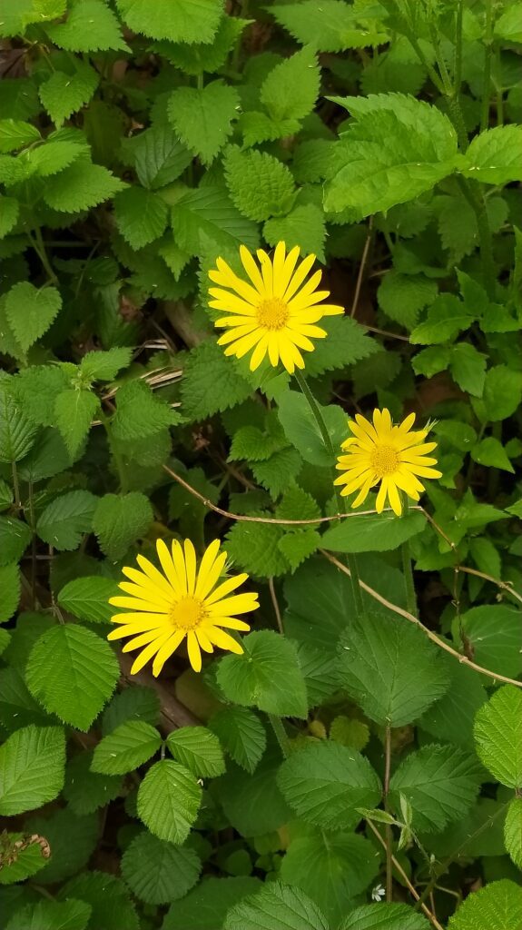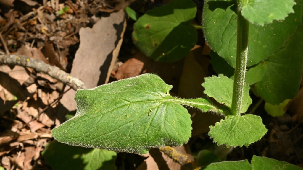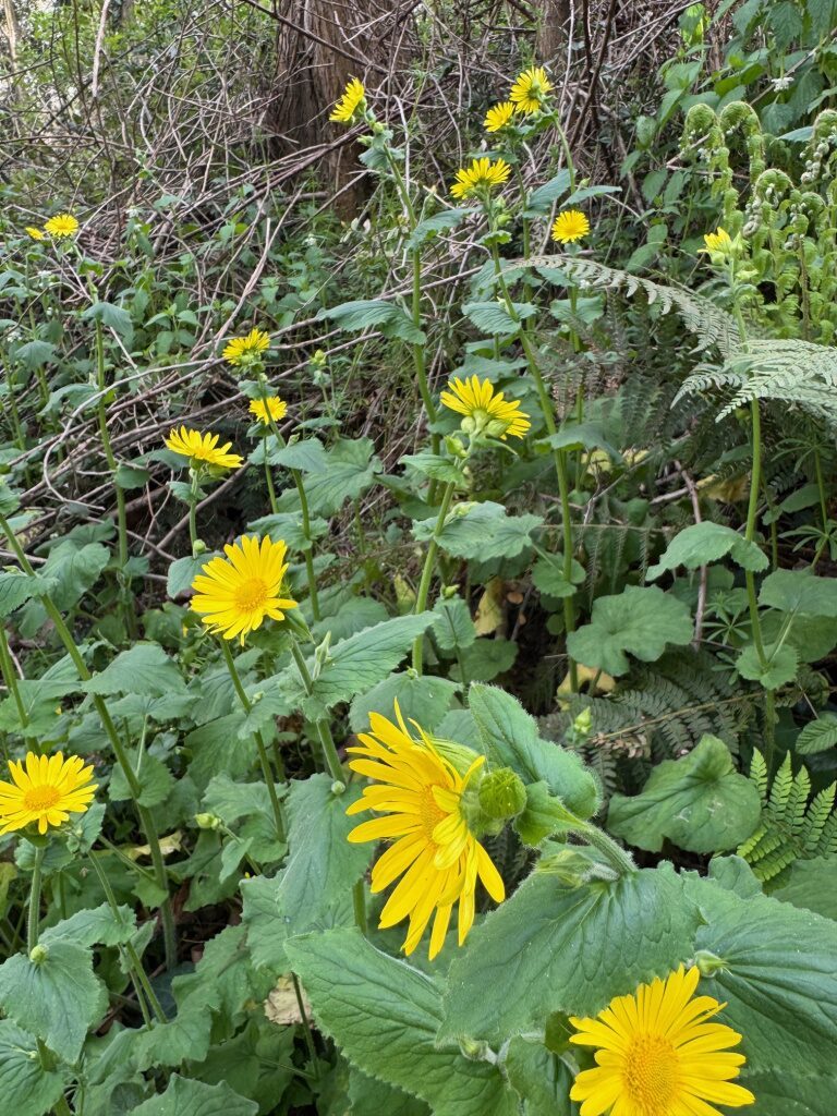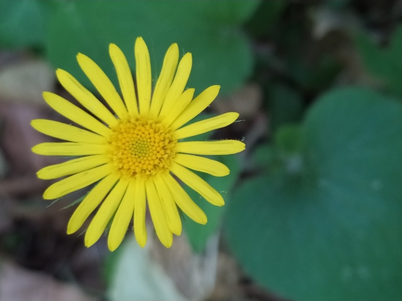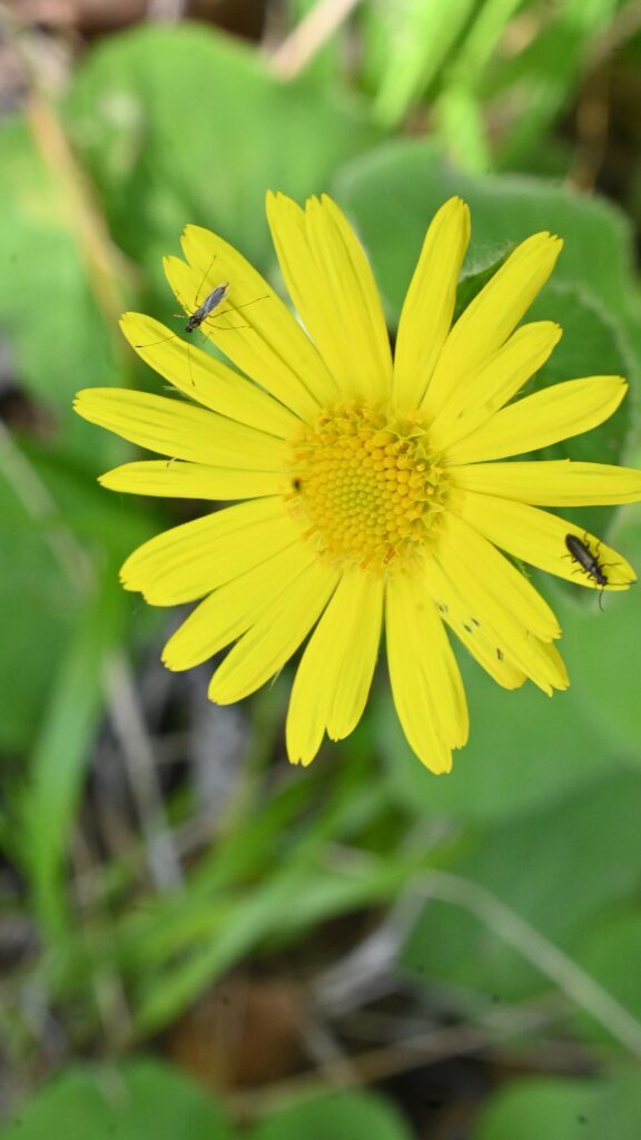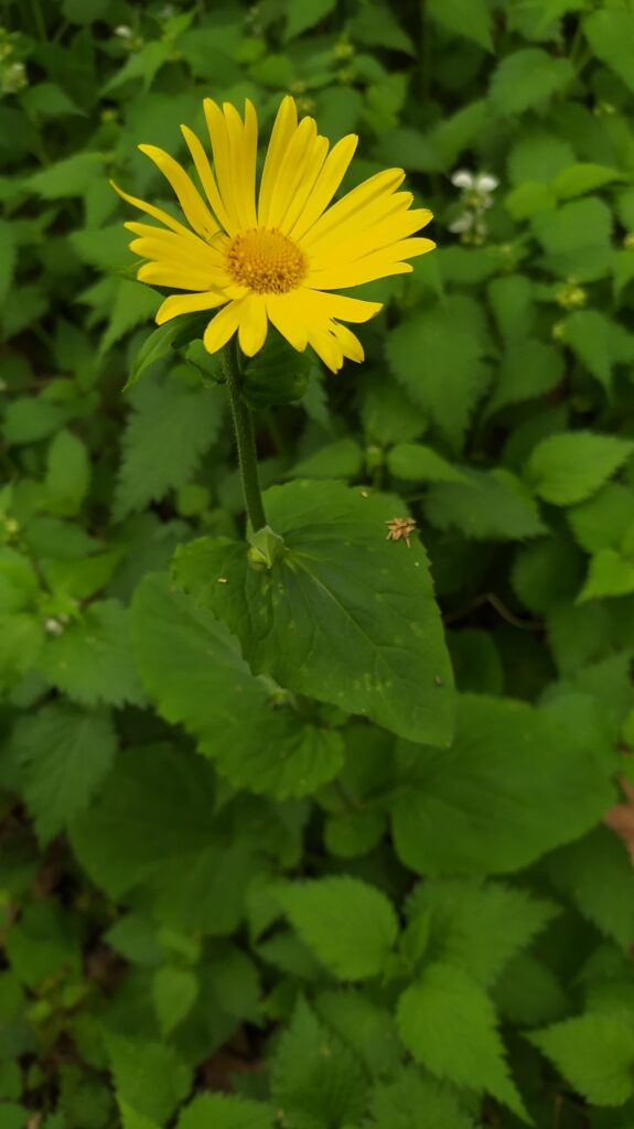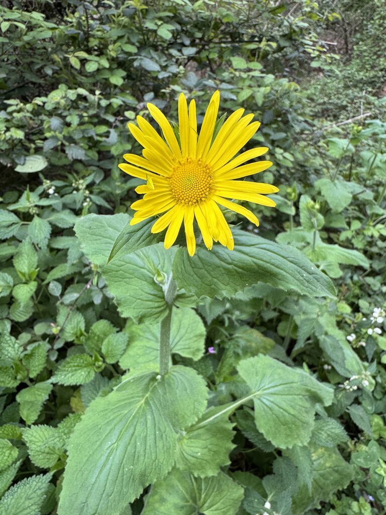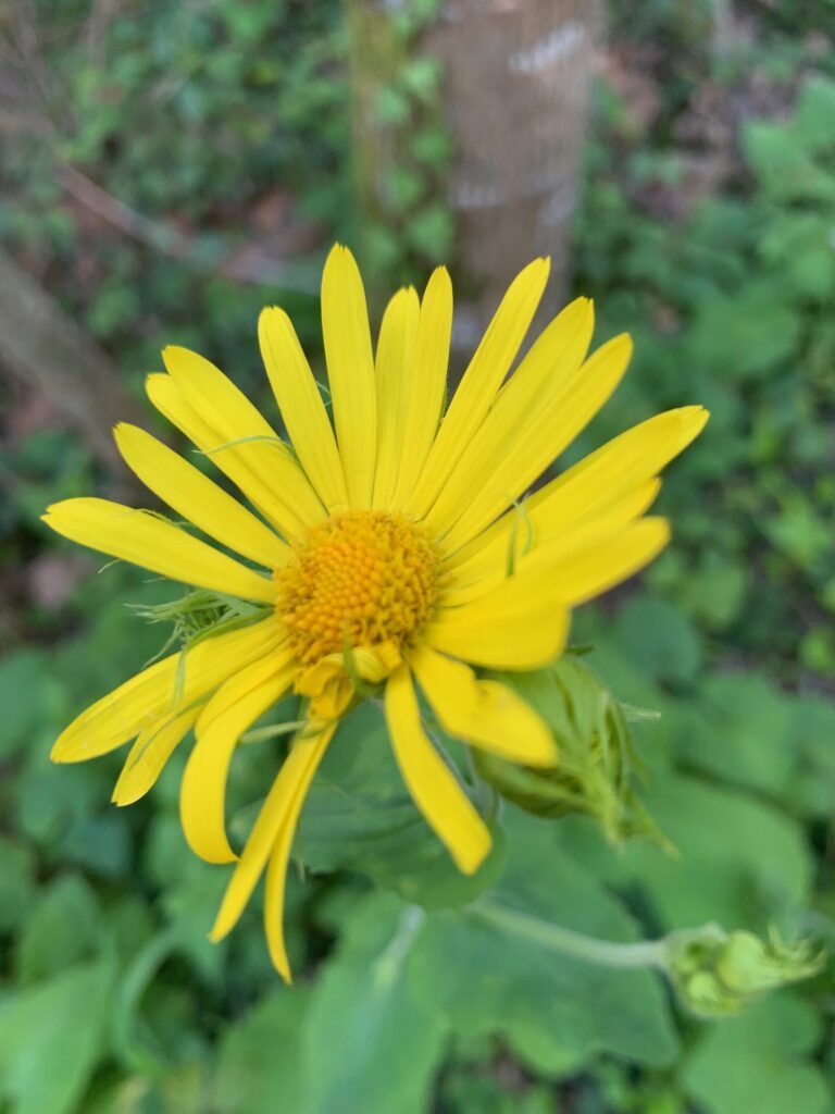 És una herba perenne de 30-80 cm, erecta, pilosa i amb estolons subterranis. El rizoma és cobert de flocs de pèls sedosos. La tija és poc foliosa, les fulles basals són llargament peciolades amb el limbe ovato-orbicular i el contorn dentat o subenter. Les fulles caulinars inferiors són semblants a les basals, però més petites. Les caulinars superiors són ovatolanceolades, sèssils i amplexicaules; de vegades la part inferior té forma de pecíol amplament alat i auriculat a la base. Els capítols de la inflorescència són grocs i mesuren de 3-6 cm de diàmetre; estan agrupats en corimbe terminal. L’involucre té les bràctees glanduloses, ovatolanceolades terminades en una llarga punta setàcia. Les flors externes són ligulades i les interiors, tubulars.