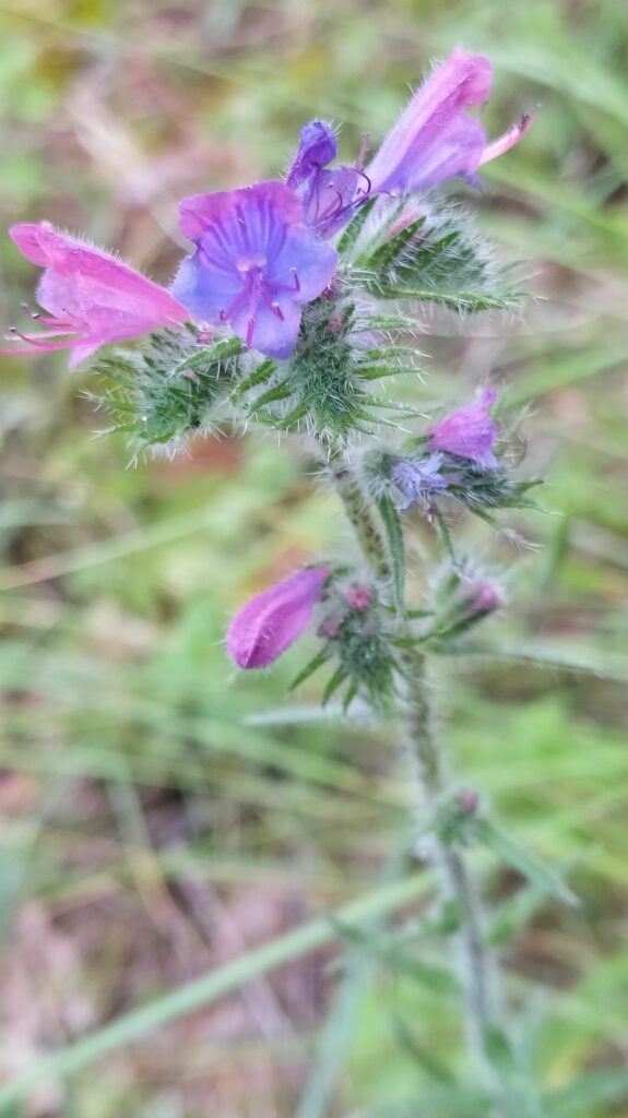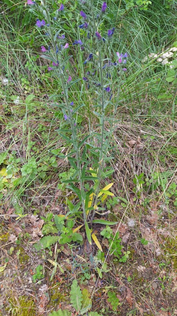 És una herba biennal de 20-60 cm, híspida amb setes pustulades llargues i pèls curts, i amb tiges erectes simples o poc ramificades. Les fulles de la roseta basal són oblongo-linears, atenuades en pecíol curt, uninervades i de 10-20 cm de longitud, les caulinars més petites i sèssils. La inflorescència és paniculiforme relativament densa i constituïda per cimes escorpioides, amb flors zigomorfes amb bràctees linear-lanceolades tan llargues o més que el calze; el calze, de 5-10 mm, té les dents linears-lanceolades, la corol·la en forma d’embut, d’un blau fosc ± violaci sovint tenyida de púrpura, normalment amb 4-5 estams exserts i glabres i l’estil més llarg que la corol·la i pilós.