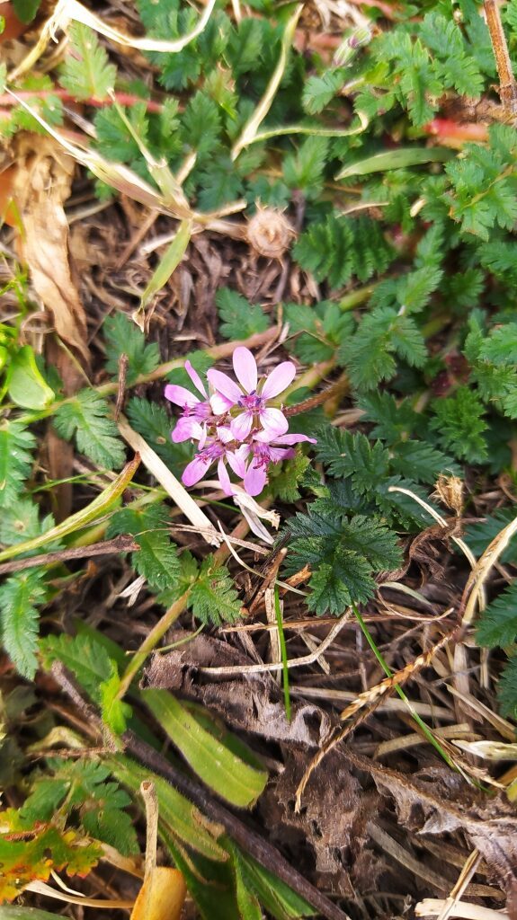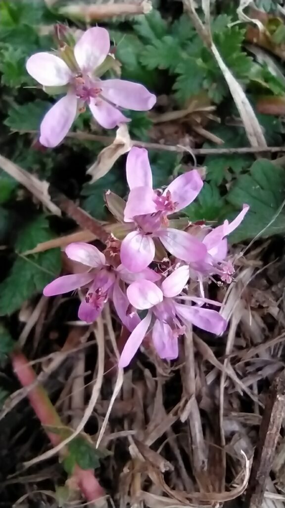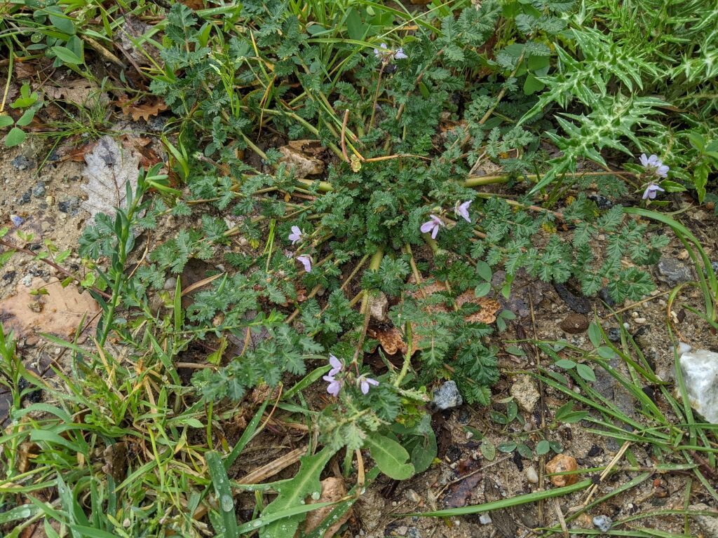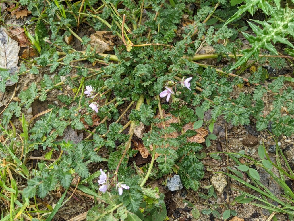 És una herba anual de 5-60 cm ± pilosa, d’arrel prima, inicialment acaule i després amb tiges folioses prostrades o ascendents. Les fulles són pinnatisectes de 3-20 cm amb 7-19 folíols obovats o oblongs, tots semblants de pinnatipartits a pinnatisectes. La inflorescència és en umbel·la de 2-12 flors amb les bràctees de 4-10 mm en part soldades a la base i lleugerament membranàcies; els sèpals, de 5-7 mm, són mucronats amb pèls la majoria no glandulífers i els pètals, de 4-11 mm, de color de rosa o ± purpuris. Els fruits són mericarpis pilosos amb un bec d’1-5 cm.