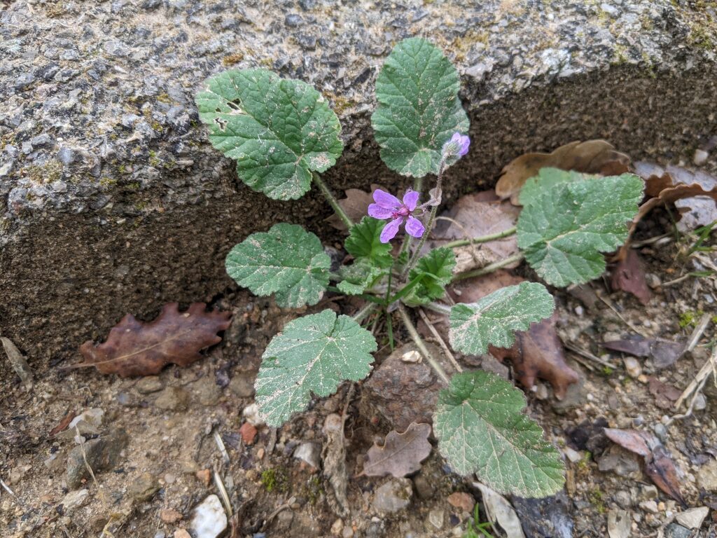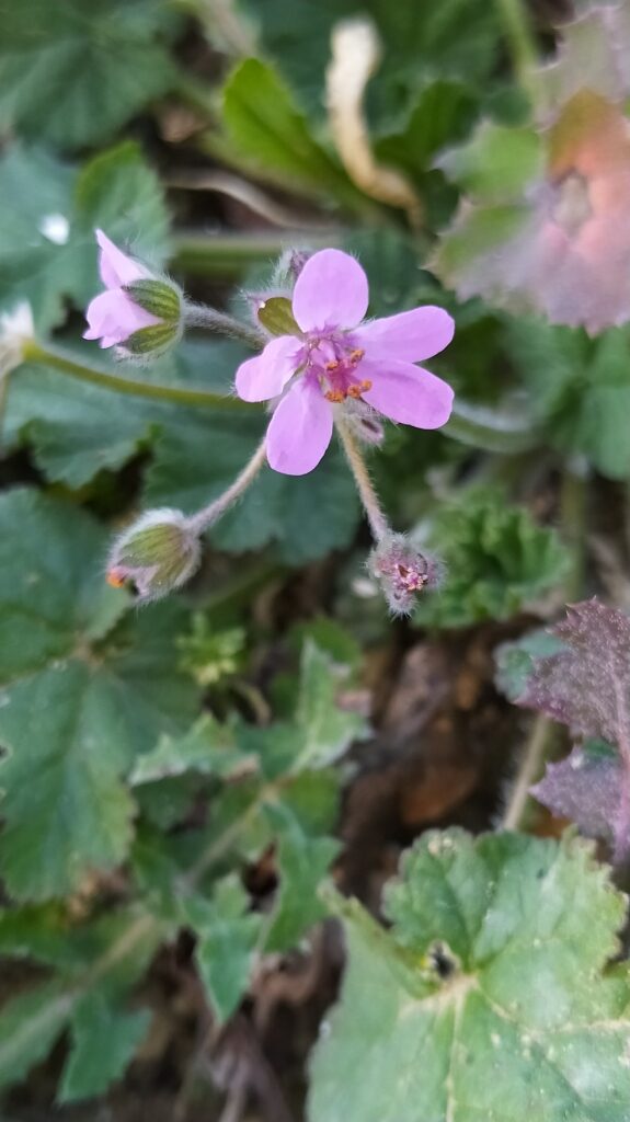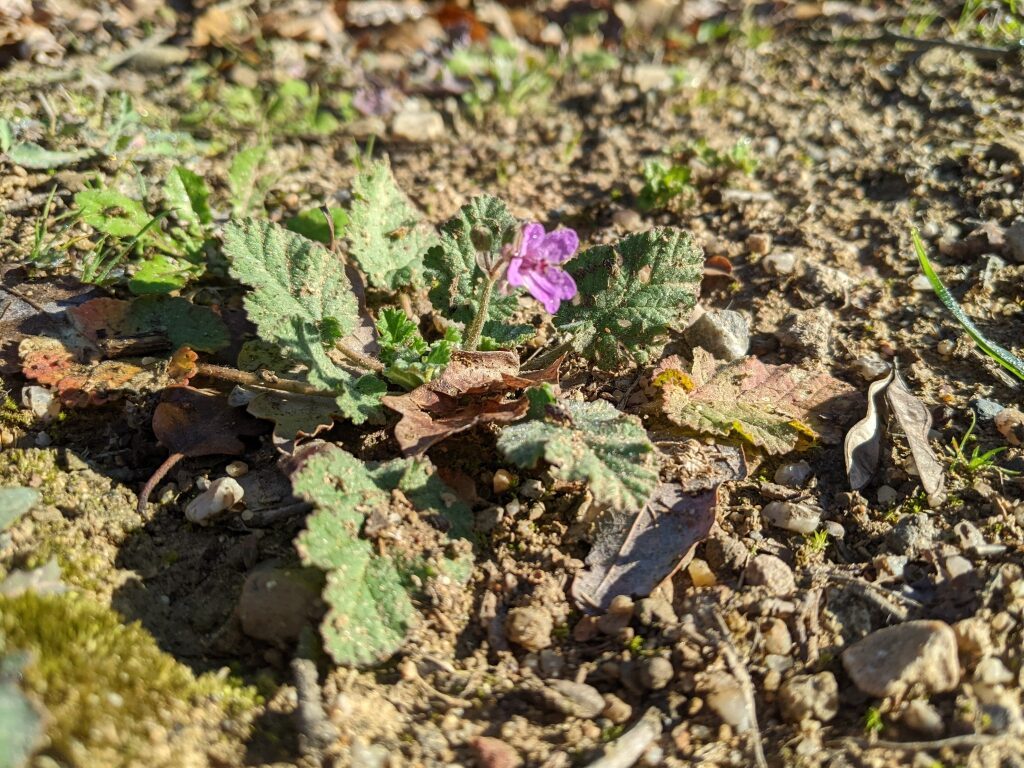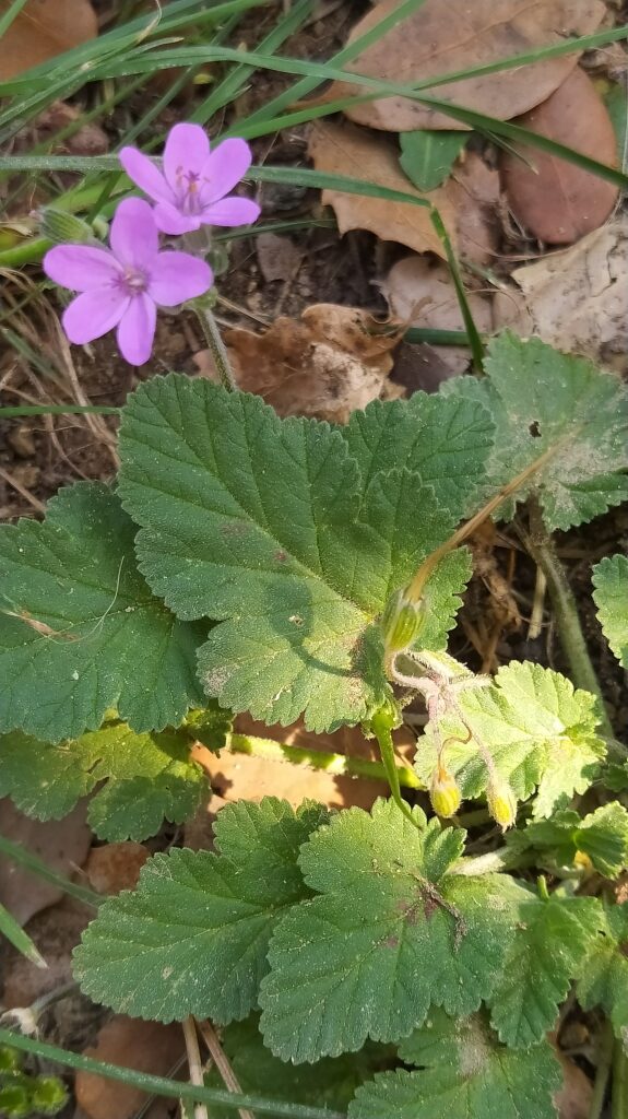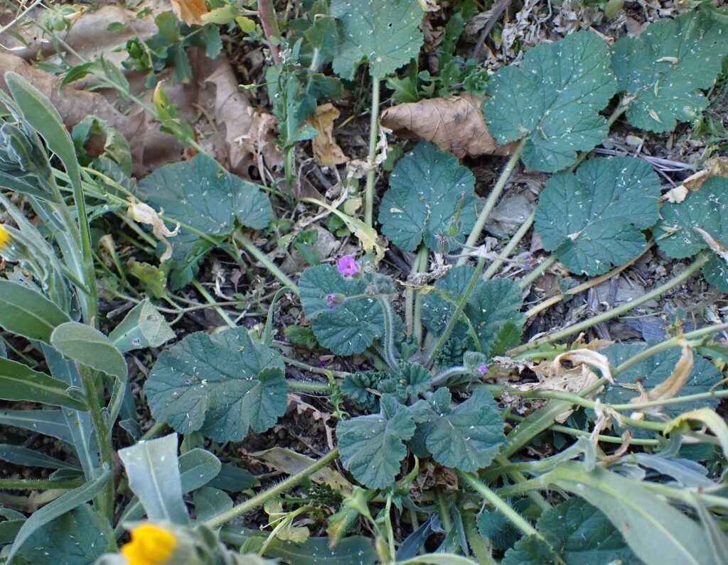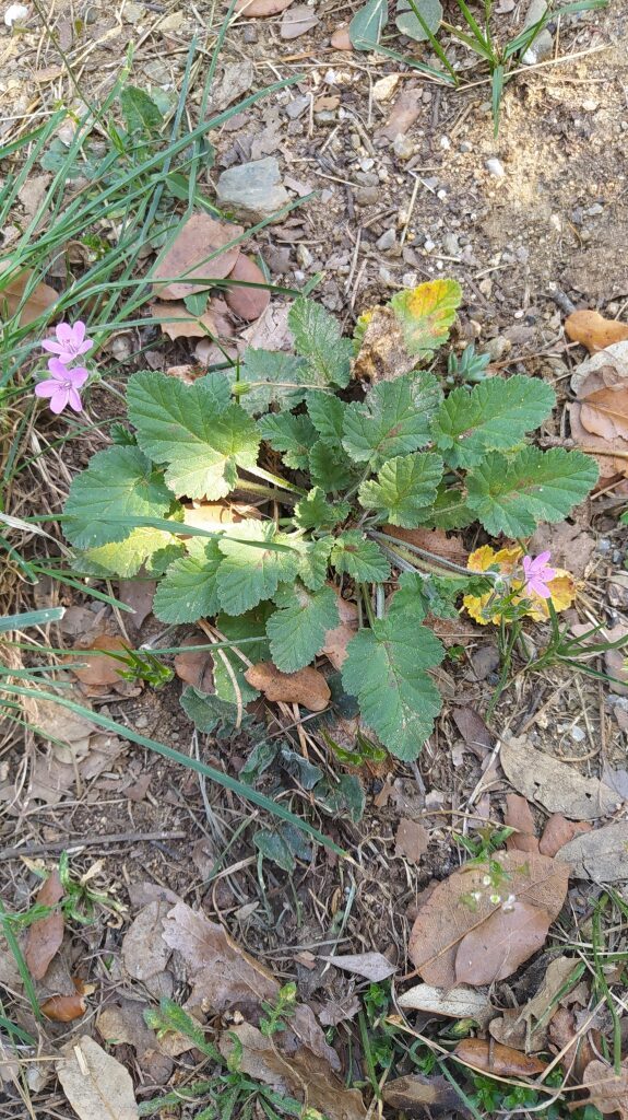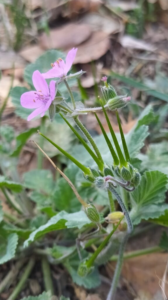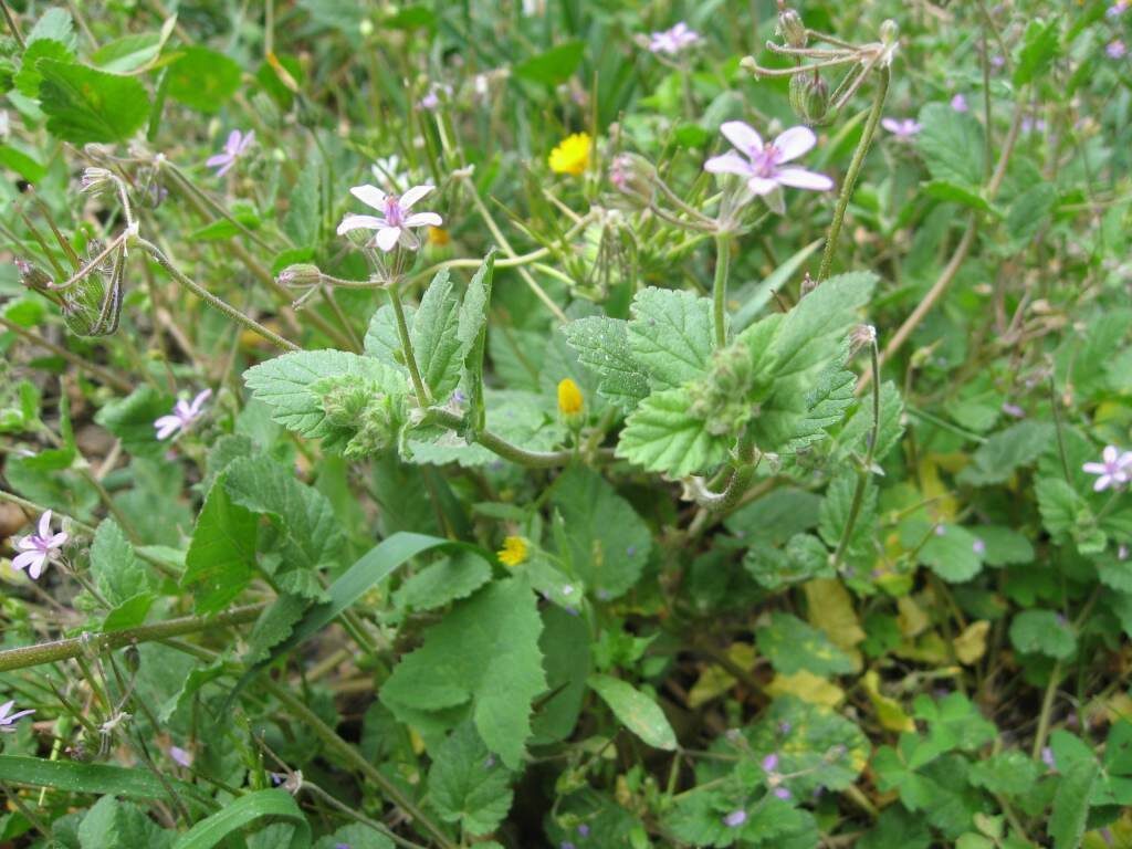 És una herba anual o biennal de 5-50 cm, prostrada o ascendent i pubescent-glandulosa. Té les fulles ovades o ovato-oblongues, cordades amb el contorn dentat o pinnatífid, les inferiors peciolades i les superiors curtament peciolades o subsèssils. Les estípules són triangular-ovades, blanquinoses i glabres. Les inflorescències són en umbel·les de 3-8 flors amb un involucre amb diverses bràctees lliures, membranàcies i ciliades amb pèls glandulífers pel revers. Els sèpals fan de 4-7 mm amb un mucró de 0,5-1 mm i els pètals, d’un rosa violaci, mesuren de 5-9 mm. Els fruits són mericarpis pilosos.