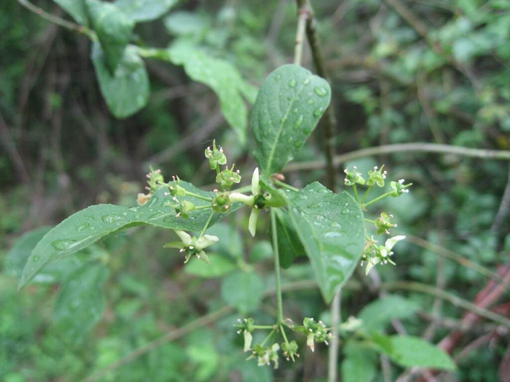 És un arbret o arbust de 2 a 6 m, caducifoli i amb les branques novelles quadrangulars i verdes. Les fulles són oposades, de 3-10 cm, d’un verd mat per l’anvers i més pàl·lides pel revers, i el limbe ovato-lanceolat, d’àpex agut o acabat en punta i contorn serrat. La inflorescència és corimbiforme, de 3-7 flors de 10-12 mm de diàmetre, amb 4 sèpals soldats a la base, 4 pètals d’un color blanc-verdós i 4 estams. El fruit és en càpsula obovoide, rosat a la maturitat amb 4, a vegades 5, lòbuls més o menys carenats. Les granes són lleugerament comprimides, marronoses i estan cobertes per una excrescència carnosa de color de carbassa.