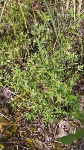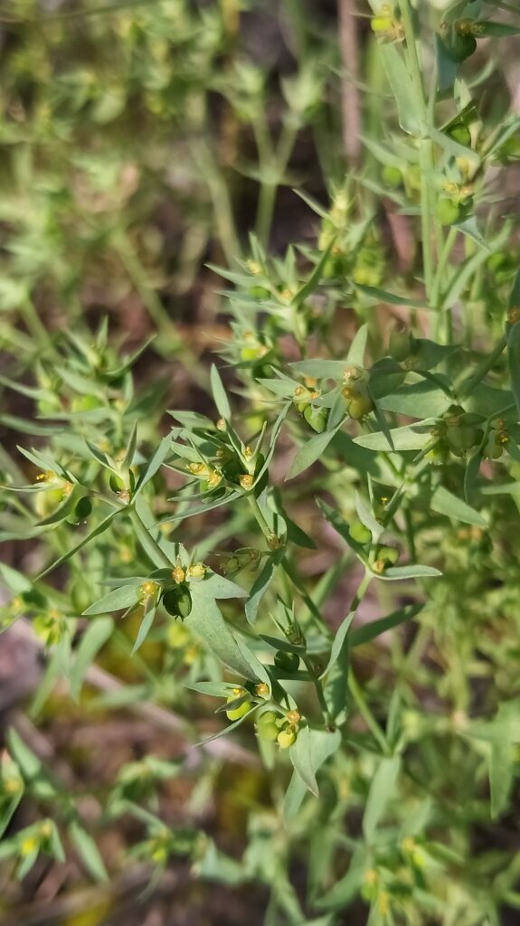 És una herba anual de 5-20 cm, glabra, simple o ramificada. Les fulles són caulinars, oblongo-linears i de contorn enter. La inflorescència és una umbel·la de 3-5 radis bifurcats, amb les bràctees lanceolato-linears eixamplades a la base. El ciati, d’1-2 mm, té glàndules grogues o vermelloses i bicornudes. El fruit és una càpsula llisa i estretament puntejada al dors, les granes, d’1-2 mm, són tuberculades.
