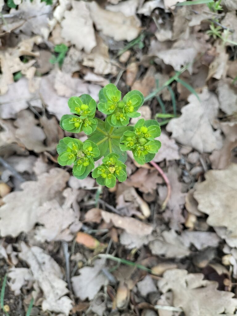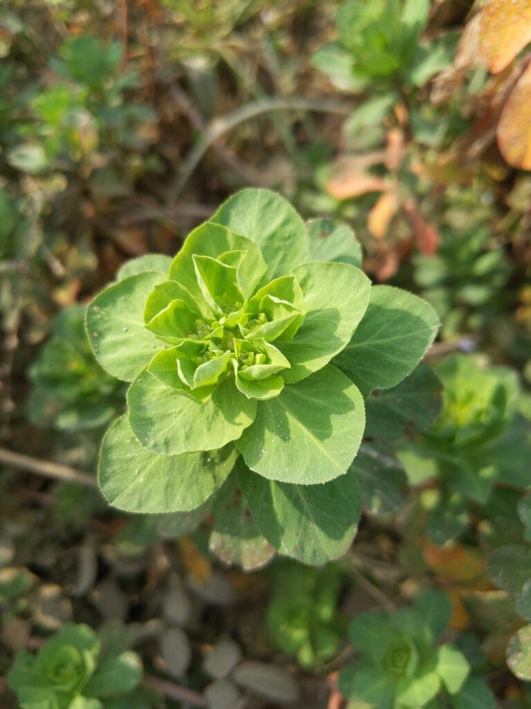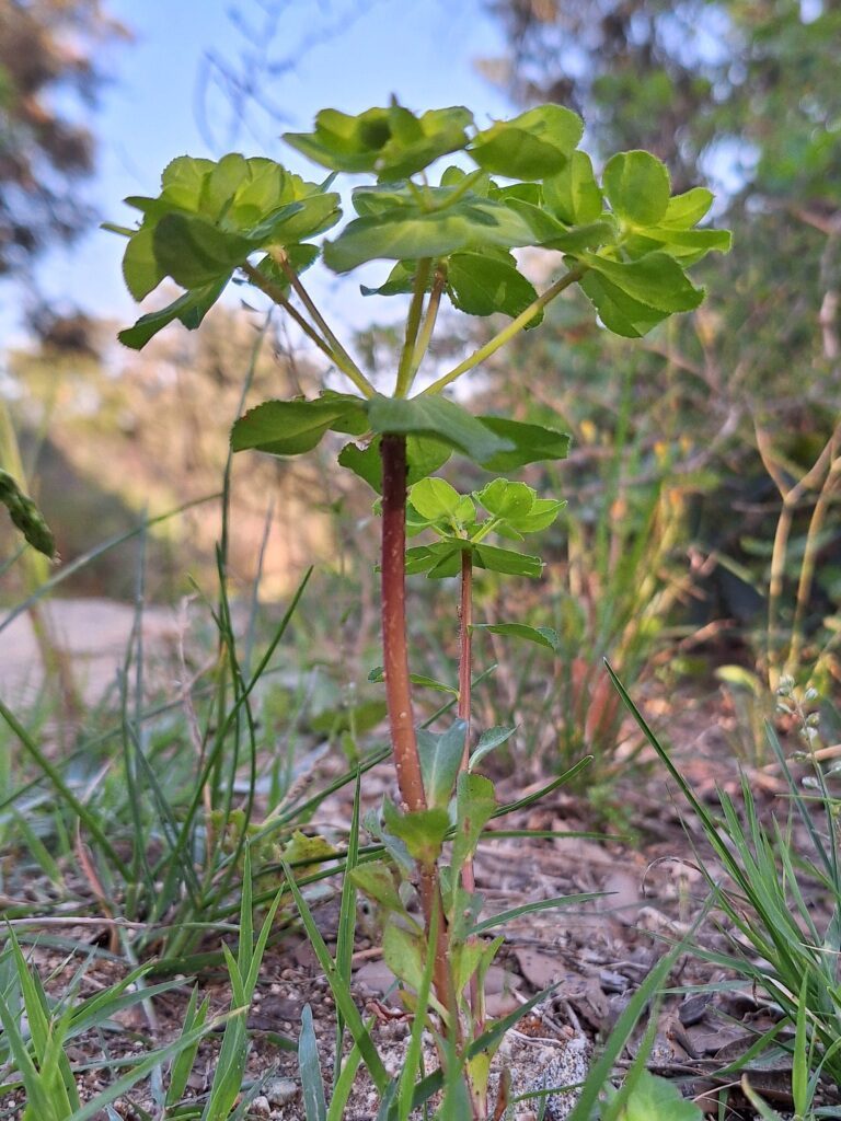 És una herba anual d’10-40 cm amb la tija normalment erecta, simple o poc ramificada, glabrescent i verda. Les fulles caulinars, de 4-40 mm, són patents i de tendència espatulada amb l’àpex obtús i de contorn serrat a la part superior i enter a la resta, les inferiors ben aviat caduques. Les inflorescències en general tenen 5 radis amb les bràctees obovades lliures; el ciati mesura 1-2 mm amb glàndules ± ovades i la càpsula de 2,5-3,5 mm que és llisa i conté granes rugoso-reticulades d’uns 2 mm, marronoses o negroses.