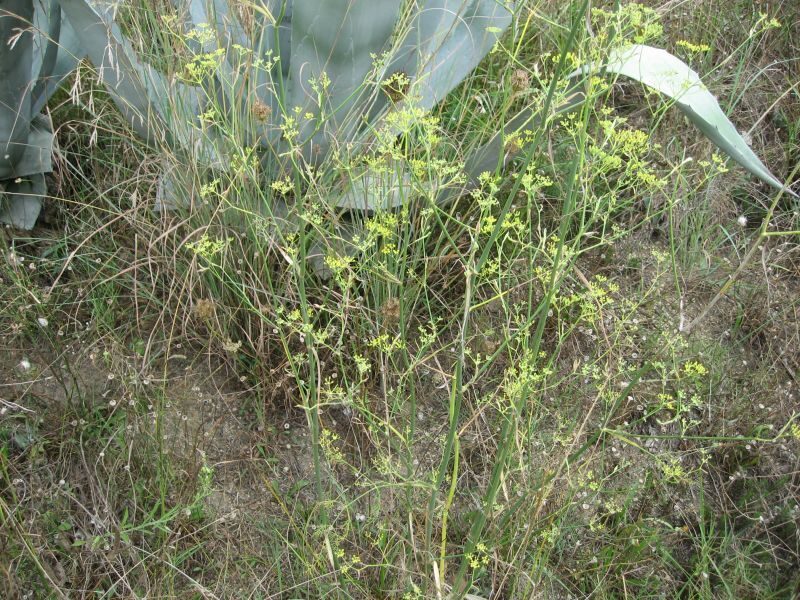 És una planta de 0,5-2 m, perenne, dreta, glabra, d’un verd grisenc i amb tiges estriades i ramificades a la part superior. Les fulles tenen el contorn triangular i estan dividides fins a 3-4 vegades en segments molt estrets, les inferiors de fins a 40 cm de llargada i són peciolades i aviat caduques, les mitjanes i superiors progressivament més curtes i menys dividides. Les inflorescències són laterals i terminals, nombroses, en umbel·la de 4-10 radis desiguals i amb flors petites de pètals grocs i enters. Els fruits, de 3-6 mm, són ovoides, glabres i amb les costes prominents.