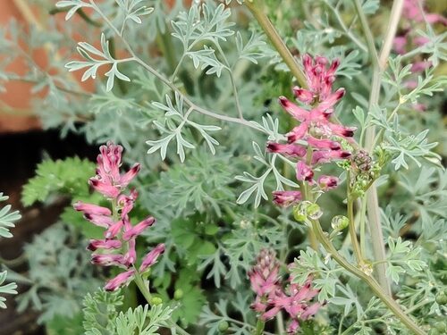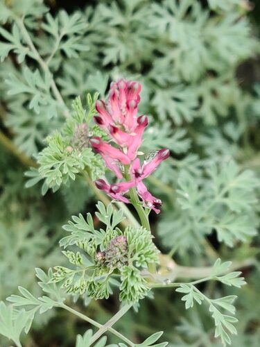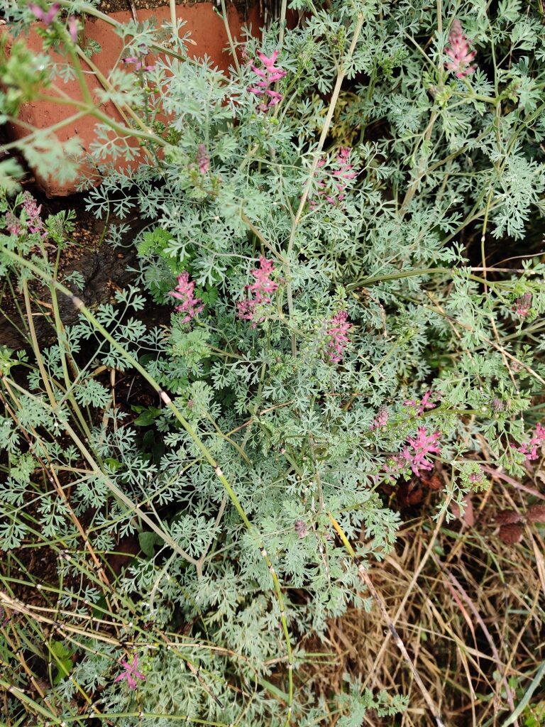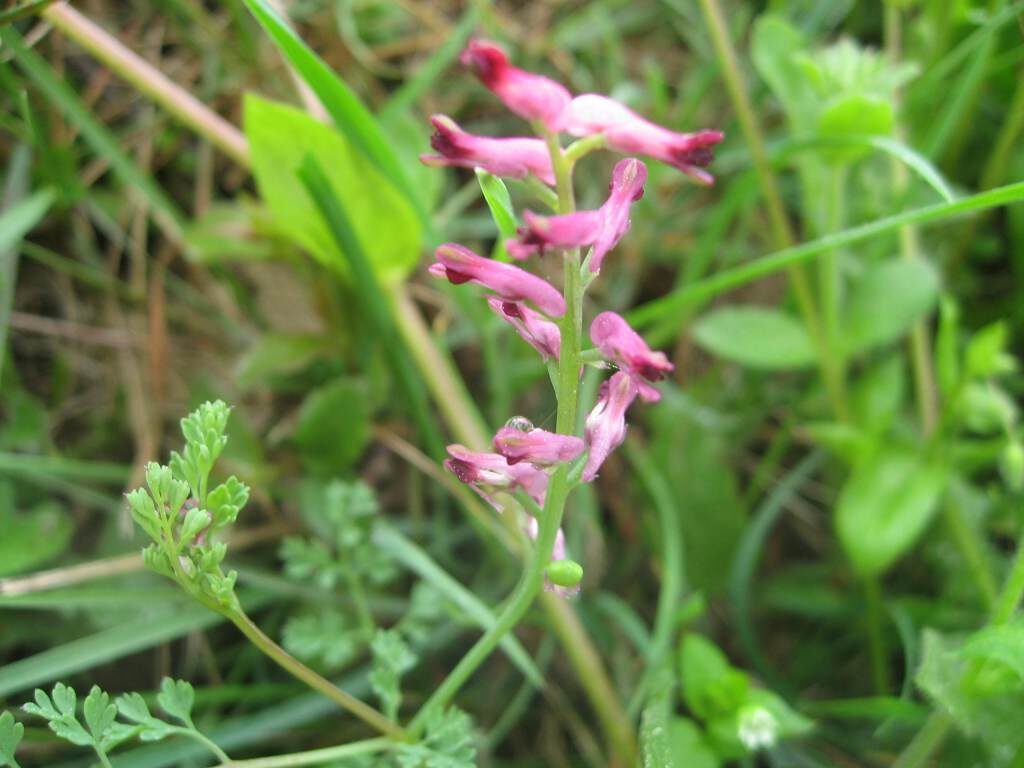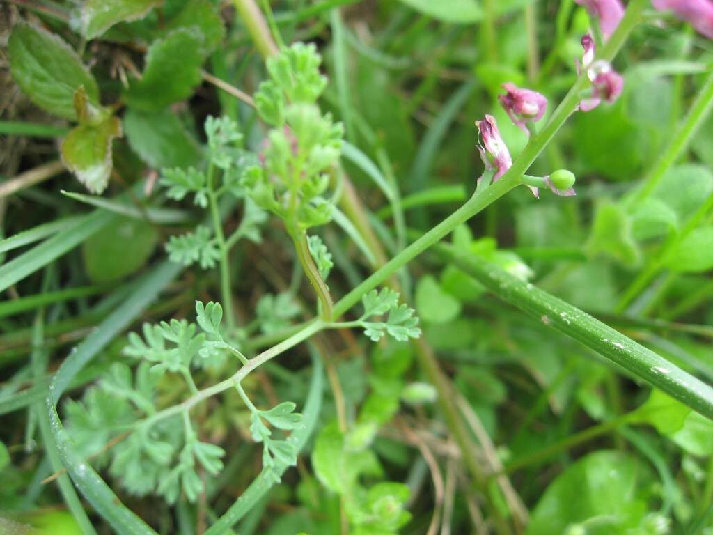 És una herba anual, de 10-50 cm, erecta o difusa i glauca. Té les fulles compostes, dividides dues o tres vegades i amb els segments molt estrets. Les inflorescències són en raïm i neixen a l’axil·la de les fulles i té un peduncle més curt que el raïm floral. Les flors són petites, de menys de 9 mm de llargada, amb bràctees més curtes que el pedicel, els sèpals d’1-1,5 mm d’amplada, més estrets que la corol·la i que no arriben a un terç de la seva llargada i la corol·la d’un rosa vinós. El fruit és rugós amb l’àpex truncat o emarginat i sovint d’amplada superior a l’alçada.