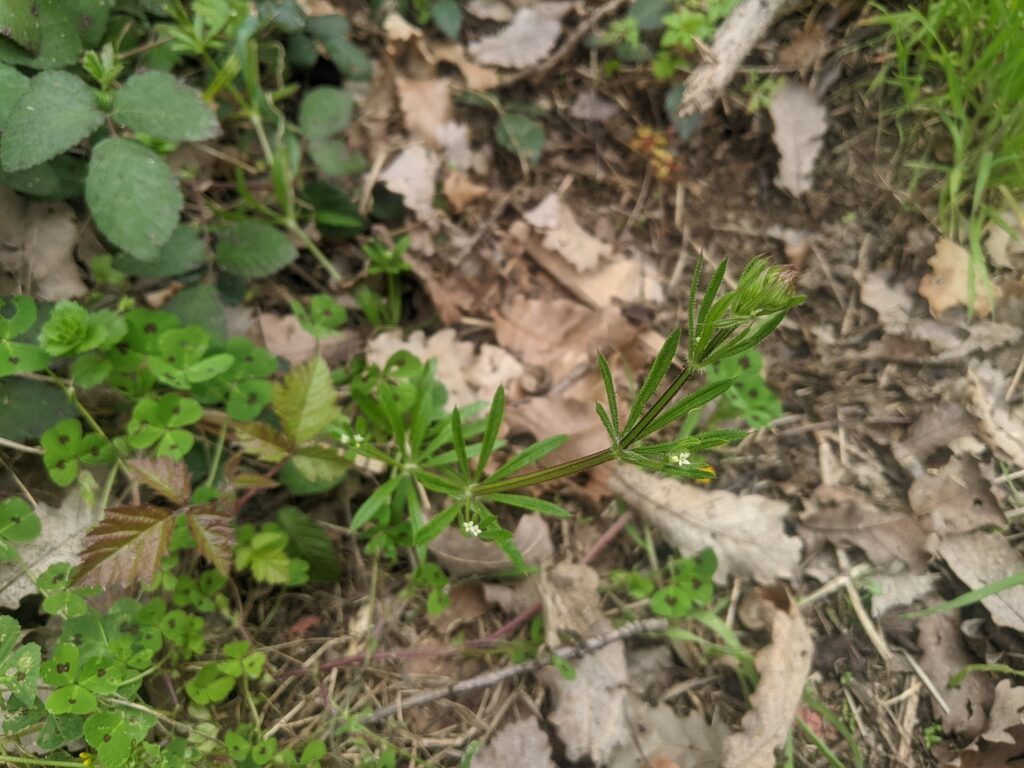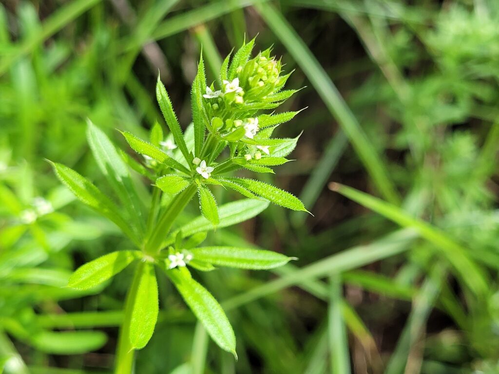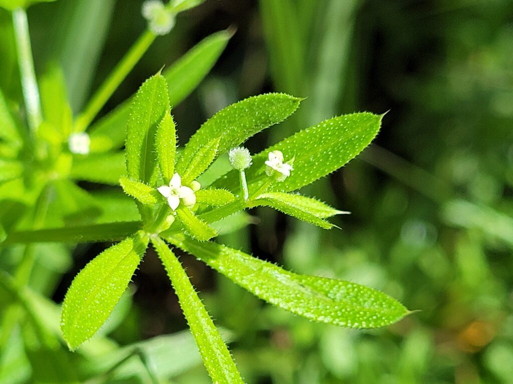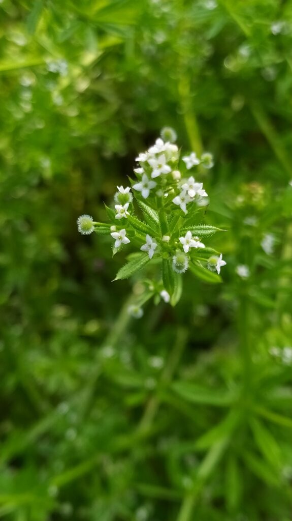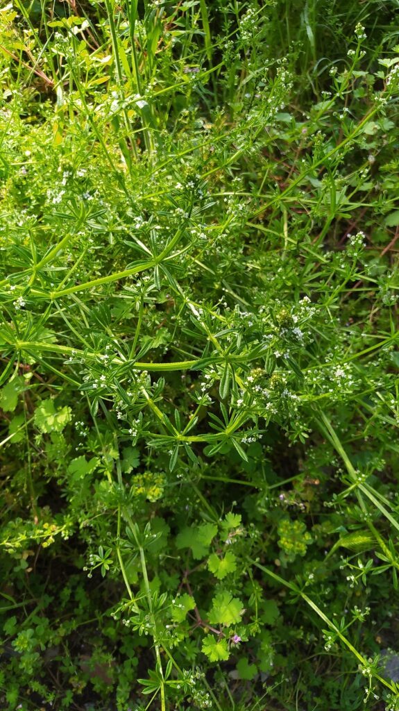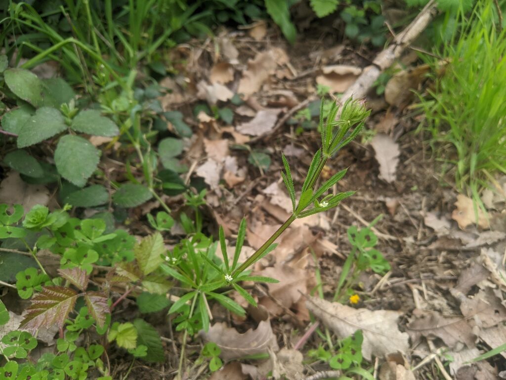 És una herba anual de 20-100 cm, enfiladissa i molt escabra. Té les tiges ascendents, amb ramificacions erectopatents i aculèols retrorsos. Les fulles són oblanceolades, agrupades en verticils de 6-10 fulles, agudes i amb l’anvers híspid. Les flors es troben agrupades en cimes generalment multiflores i més llargues que les fulles. Els peduncles i els pedicels són divaricats després de la floració. La corol·la fa d’1,5-3 mm de diàmetre i és rotàcia, amb els lòbuls erectes o patents, glabra, blanquinosa o verdosa i més estreta que l’ovari. El fruit, de 3-5 mm d’alçada, és densament setós.