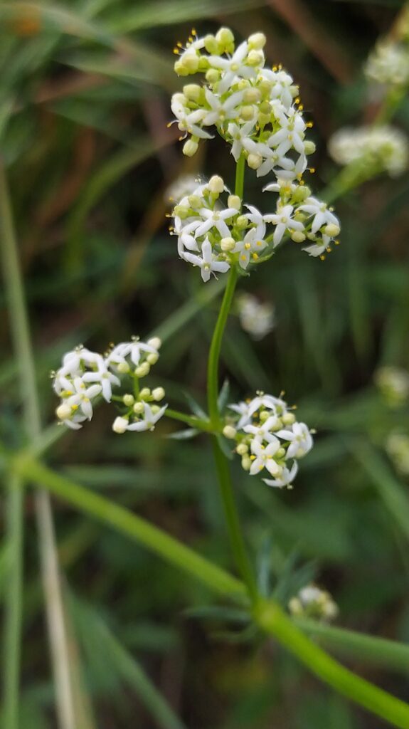 És una herba perenne de 25-80 cm, decumbent o ascendent, sovint estolonífera i normalment glabra. Les fulles, en verticils de 8-10, són linears de 10-30 mm de longitud i 0,5-2 mm d’amplada, planes o revolutes, brillants i amb una aresta de 0,2-0,6 mm. La inflorescència és piramidal o amplament oblonga i ocupa com a màxim la meitat de les tiges. Les flors, de 3-5 mm, són de corol·la blanca amb els lòbuls aristats o fortament apiculats. Els fruits són marronosos o ± negrosos, glabres i lleugerament rugosos.