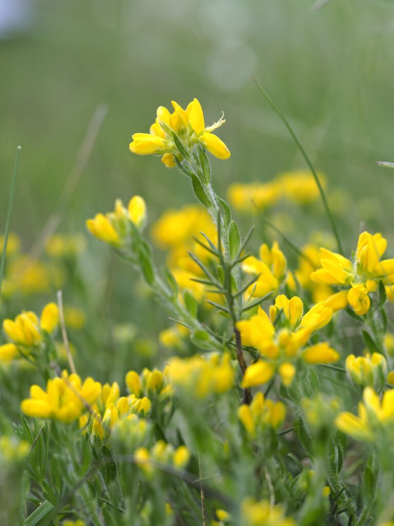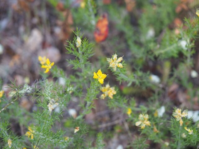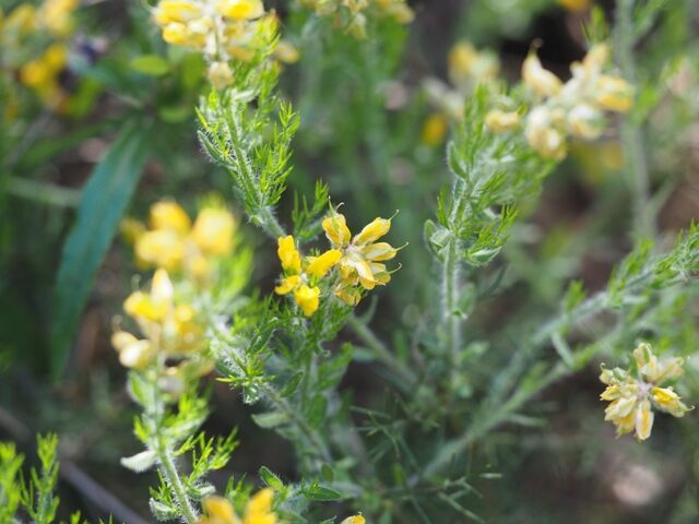 És una mata de 10-20 cm, verda i molt ramificada. Les branques velles no tenen fulles i estan cobertes d’espines ramificades no vulnerants. Les joves són folioses i hirsutes, amb les fulles alternes ± pubescents i oblongues, de 6-10 mm. Les flors es troben en un raïm curt umbel·liforme terminal. Els pedicels fan de 2-4 mm; són bracteolats amb el calze campanulat bilabiat amb llargs pèls. La corol·la és groga amb l’estendard ovat emarginat a l’àpex i poc més curt que la carena. El llegum és el·líptic, mesura de 6-9 mm, bru a la fi, glabrescent i amb 1-2 granes.