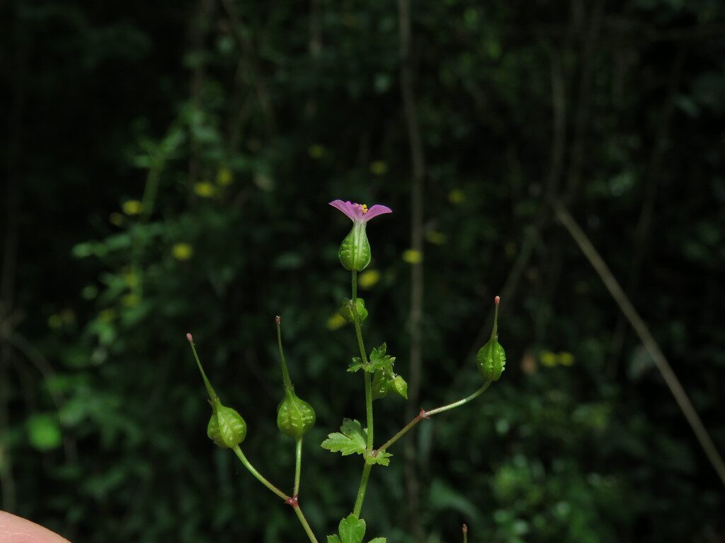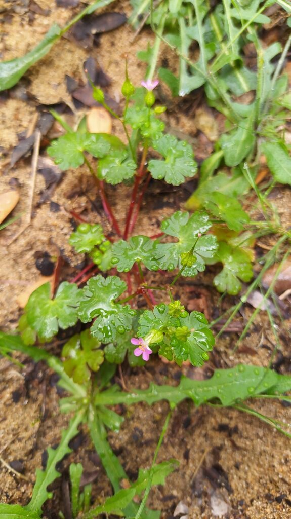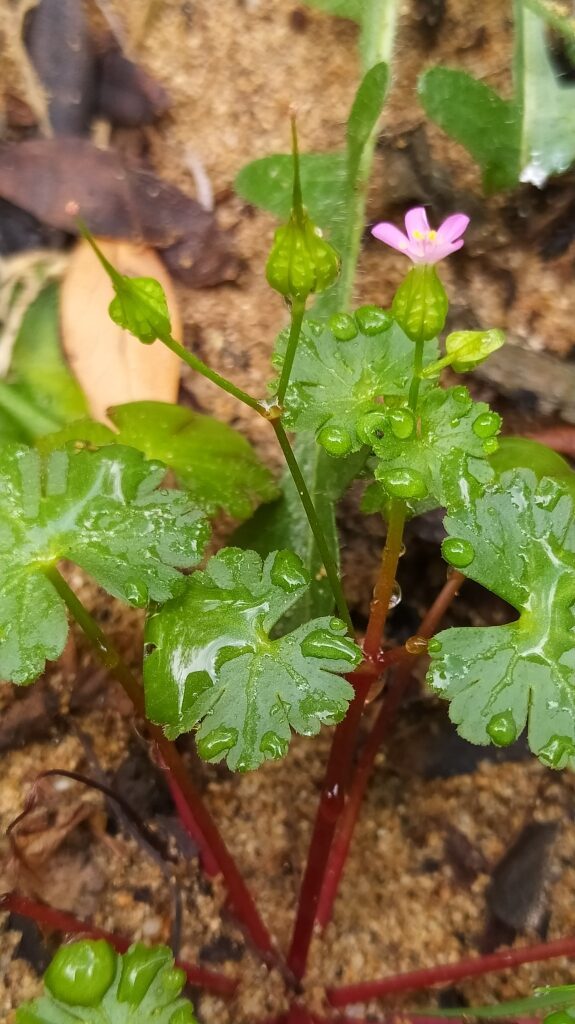 És una herba anual de 10-40 cm, ascendent o erecta, glabra o glabrescent i sovint vermellosa. Les fulles fan de 2-6 cm i són lluents, peciolades, lleugerament suculentes amb el limbe orbicular, palmatífid o palmatipartit i de lòbuls amples ovatocuneïformes, crenats o trífids a l’àpex. Té els peduncles biflors. Les flors tenen els sèpals de 5-7 mm, fortament carenats, amb rugositats transversals, aristats, erectes i connivents durant la florida, i els pètals d’un rosa viu i mesuren de 8-10 mm amb la longitud de l’ungla superior al limbe. Els mericarpis, pubescents, estan solcats a l’àpex.