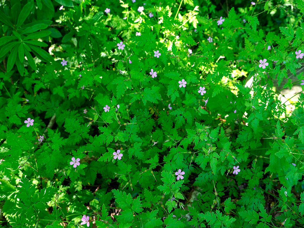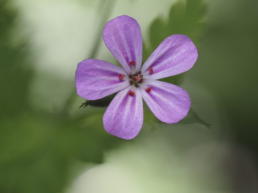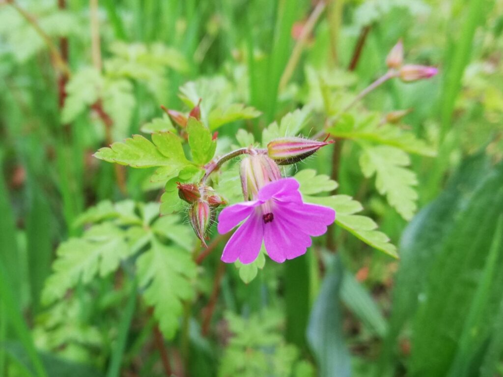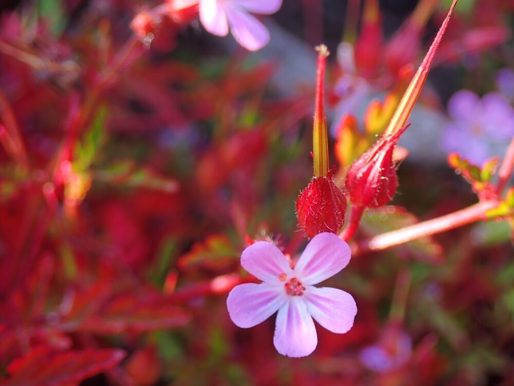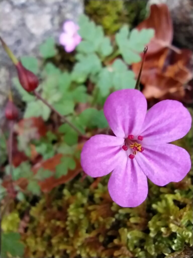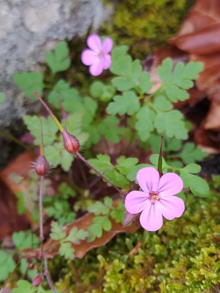 És una herba biennal, rarament anual, de 10-60 cm, foliosa, ramificada, pilosoglandulosa amb els pèls ± patents, sovint vermellosa amb les tiges ascendents. Les fulles fan de 3-9 cm amb el contorn de pentagonal a triangular, palmatisectes i dividides en 3(5) segments pinnatipartits. Les basals, en roseta i les caulinars, oposades. El peduncle medeix d’1-7 cm; és biflor amb sèpals de 7-9 mm aristats. Es pètals són purpuris, fan de 9-14 mm amb el limbe de 6-9 mm, contrets bruscament en ungla, erectopatents. Les anteres són purpúries i el pol·len groc. Els fruits són mericarpis ordinàriament pubescents.