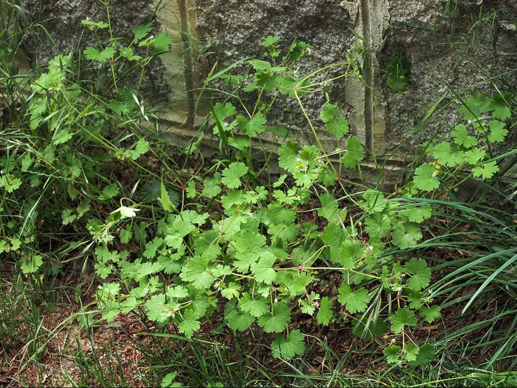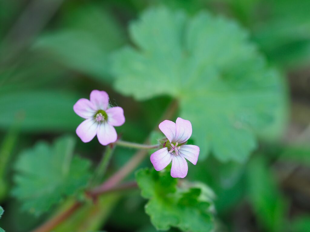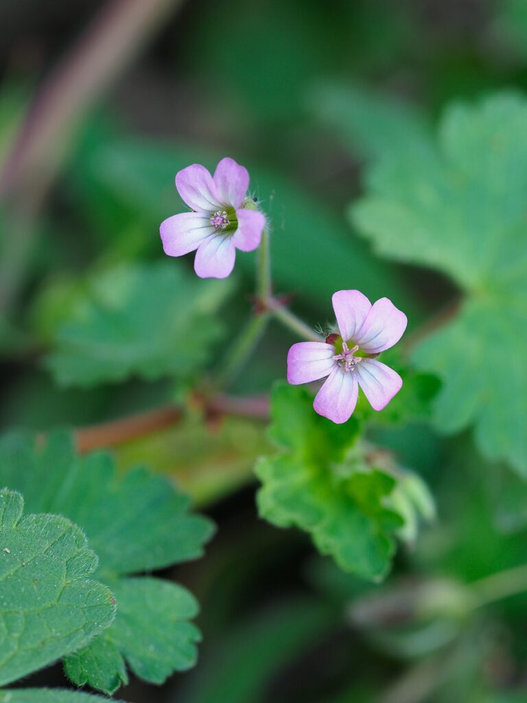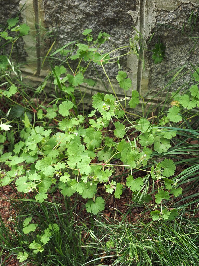 És una herba anual, de 5-40 cm, piloso-glandulosa i amb les tiges ascendents. Té totes les fulles peciolades, les basals en roseta i les caulinars oposades. El limbe és arrodonit, de 3-6 cm, dividit en 5-9 lòbuls més o menys triangulars amb l’amplada màxima a la part superior, profundament crenats a l’àpex i al sinus normalment amb un punt vermellós. Les estípules també són vermelloses. Les inflorescències són biflores amb un peduncle de fins a 4 cm i les flors rosades. Els sèpals són pilosos, mucronats i erectes o més o menys patents, i els pètals amb l’àpex enter. Els fruits (mericarpis) són llisos i pilosos.