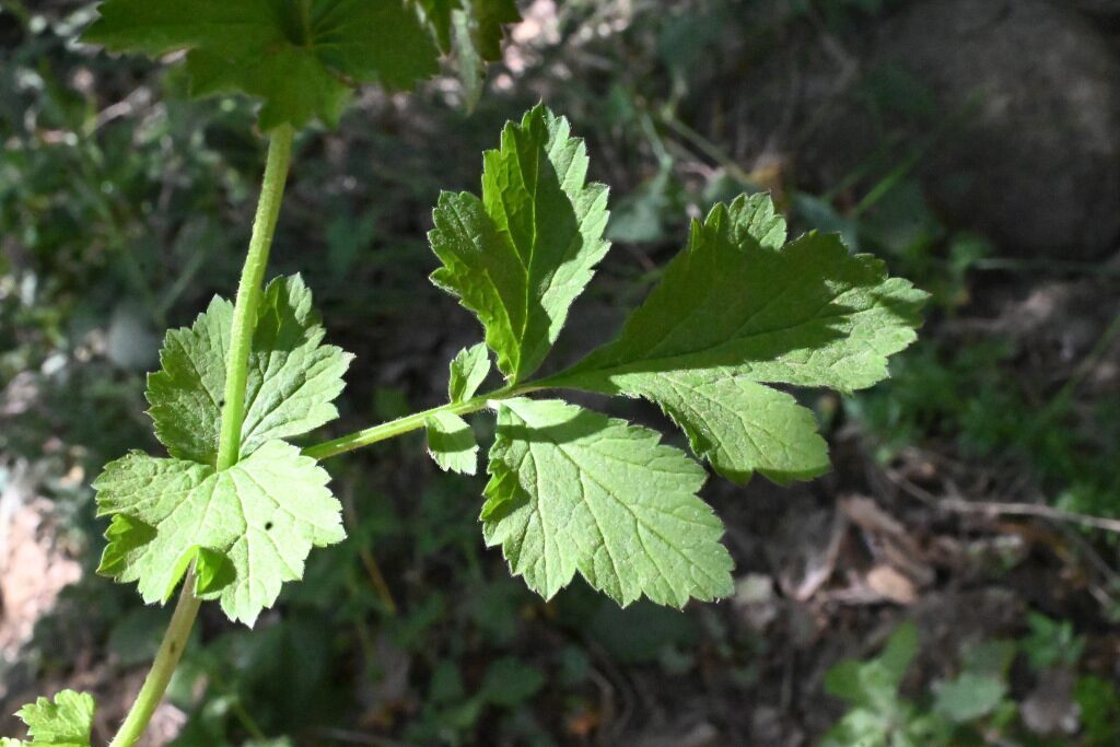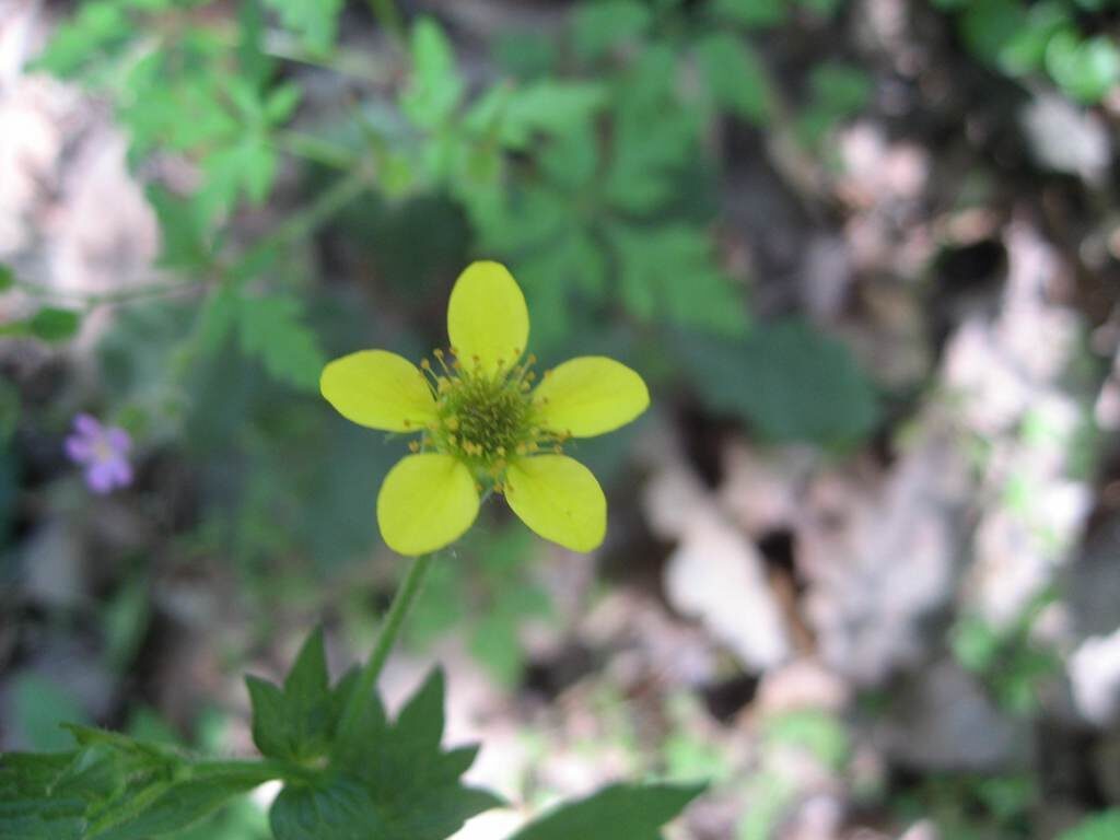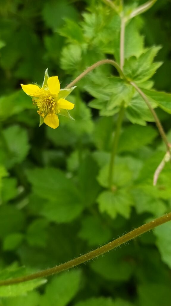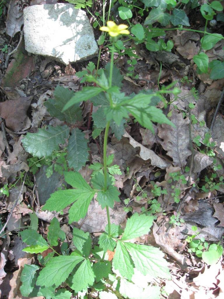 És una herba perenne de 20-80 cm, pilosa, amb el rizoma curt i gruixut i les tiges erectes i ramificades. Les fulles basals, en roseta, són pinnaticompostes amb 5-7 folíols de contorn lobato-dentat i molt desiguals. El folíol terminal és més gran que la resta i profundament lobat, mentre que les fulles caulinars són més petites, ± tan llargues com amples i ordinàriament amb 3 folíols o segments. Les estípules són grans, d’1-3 cm. Els sèpals fan uns 10 mm, estretament triangulars, pilosos, verds i reflexos després de la floració. Els pètals són grocs, poc més llargs que els sèpals i obovats. L’estil és glabre o poc pilós i articulat més amunt de la seva meitat.
