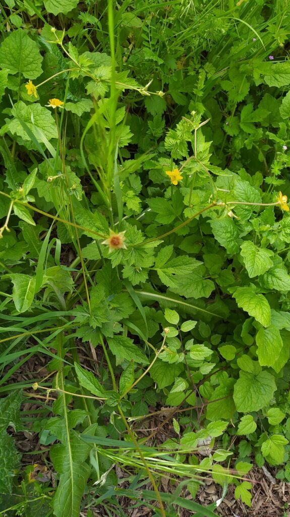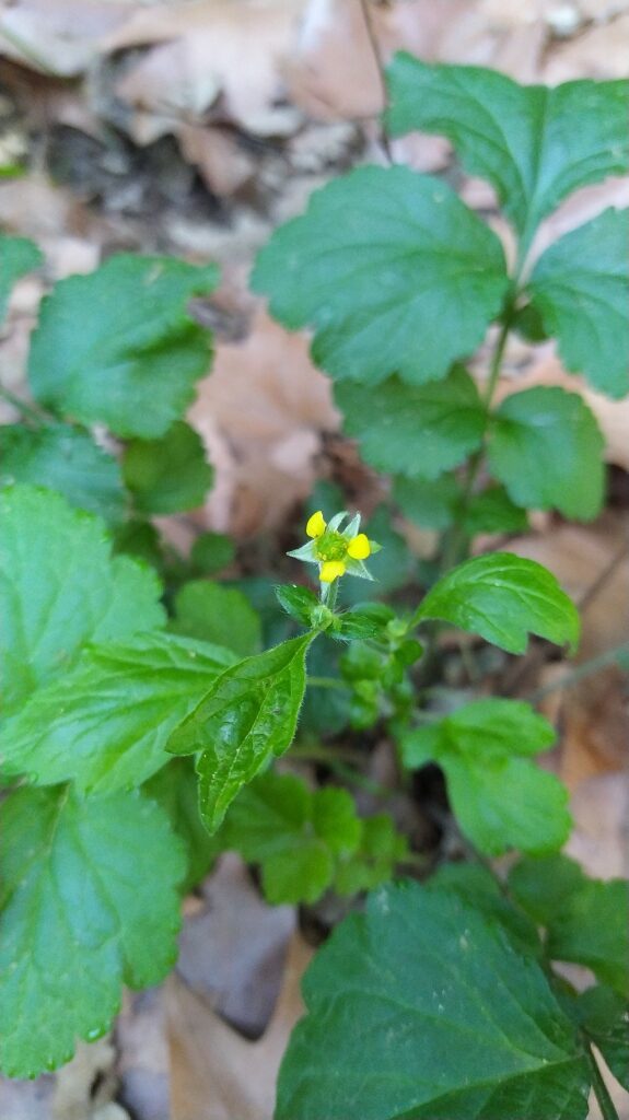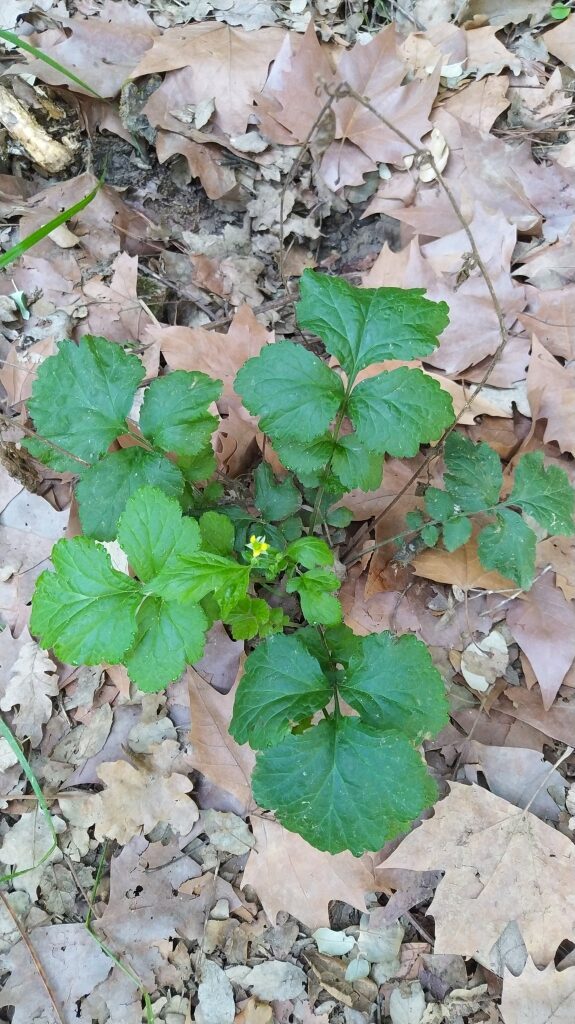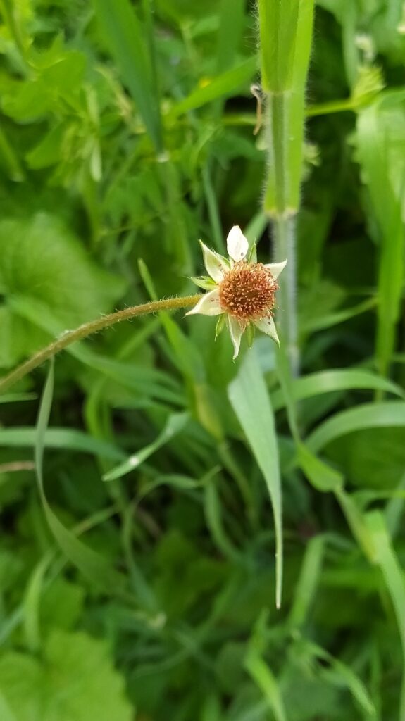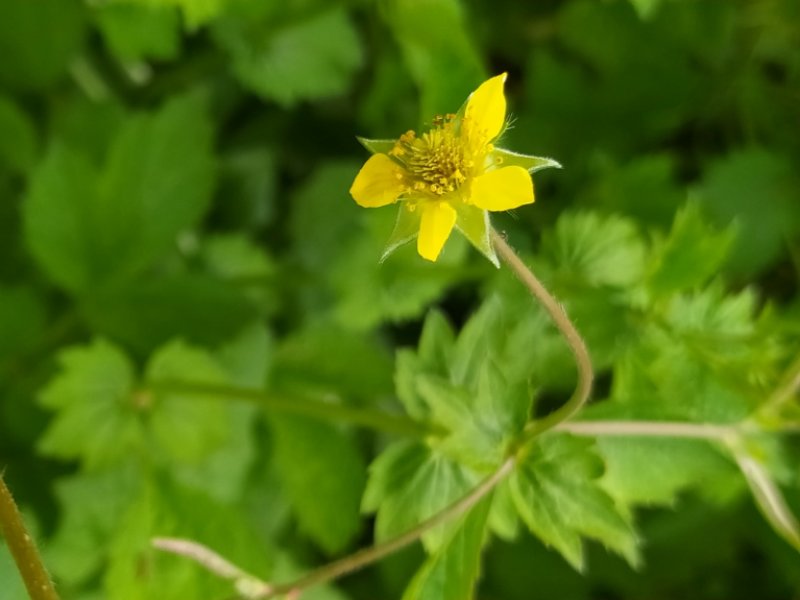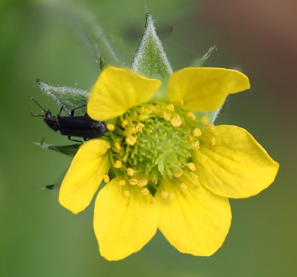 És una herba perenne de 20-80 cm, pilosa, amb el rizoma curt i gruixut i les tiges erectes i ramificades. Les fulles basals, en roseta, són pinnaticompostes amb 5-7 folíols de contorn lobato-dentat i molt desiguals. El folíol terminal és més gran que la resta i profundament lobat, mentre que les fulles caulinars són més petites, ± tan llargues com amples i ordinàriament amb 3 folíols o segments. Les estípules són grans, d’1-3 cm. Els sèpals fan uns 10 mm, estretament triangulars, pilosos, verds i reflexos després de la floració. Els pètals són grocs, poc més llargs que els sèpals i obovats. L’estil és glabre o poc pilós i articulat més amunt de la seva meitat.