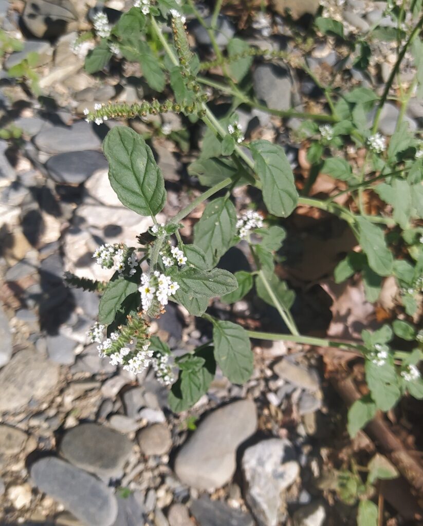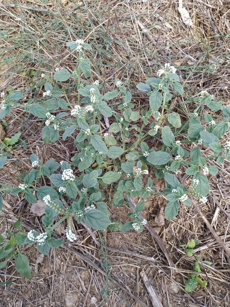 És una herba anual de 10-40 cm, pilosa, erecta o ascendent i ramificada des de la base. Les tiges tenen pilositat aplicada. Les fulles són peciolades amb el limbe ovat i pubescent de fins a 7 cm de longitud. La inflorescència, en cimes escorpioides denses de fins a 15 cm a la floració, sovint són geminades o ternades. Les flors són sèssils amb un calze de 2-3,5 mm de longitud, ± campanulat i dividit quasi fins a la base. La corol·la és violàcia o blanquinosa amb el tub de mida semblant al calze o poc més i els lòbuls ondulats. El fruit mesura d’1,5-2 mm; és glabre o pubescent i ± rugós.