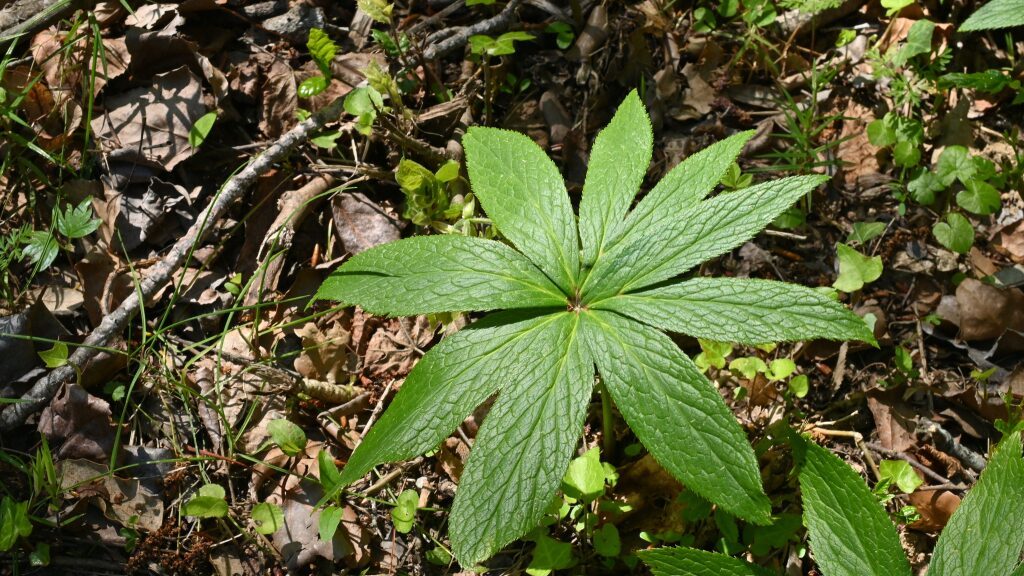 És una planta perenne, glabrescent, de rizoma horitzontal i amb nombroses arrels cilíndriques. Normalment té dues fulles grans, dividides amb 7-13 segments lanceolats i de contorn irregularment dentat. La tija, que aviat desapareix i que surt després de les fulles, porta unes bràctees digitades o lobulades a la part superior, amb 2-5 flors, a vegades de més de 3-5 cm de diàmetre i amb els sèpals verdosos i patents. Té 3, a vegades 4, fruits (fol·licles) soldats a la base i amb l’estil persistent.