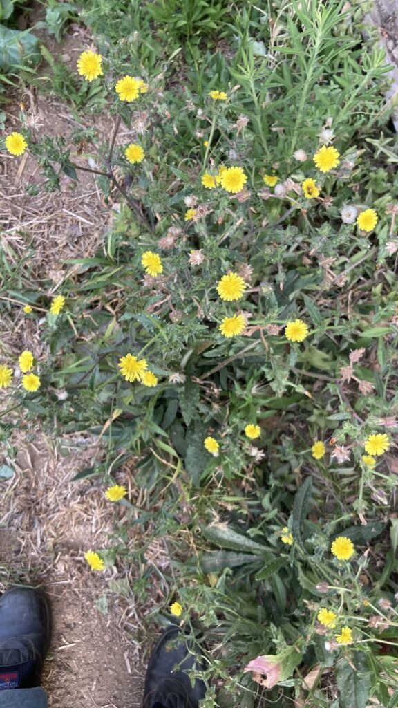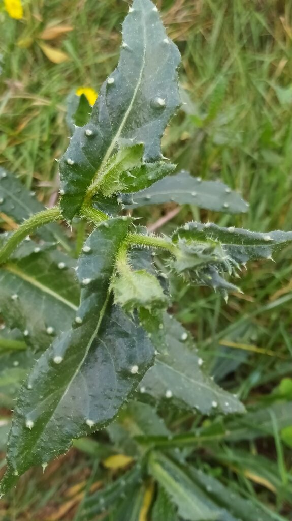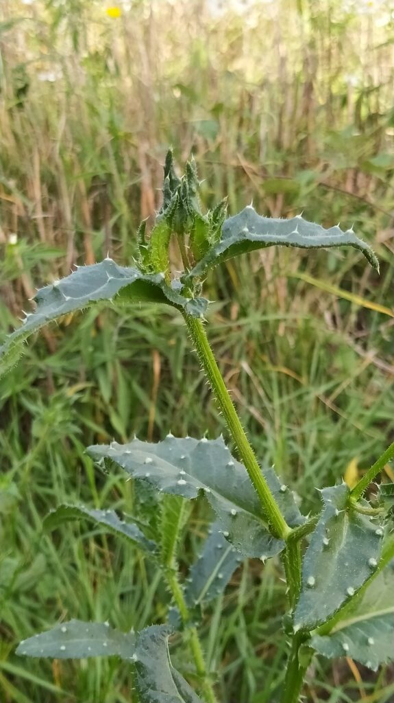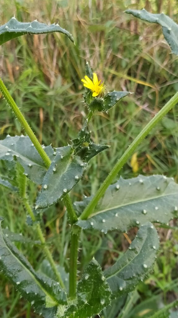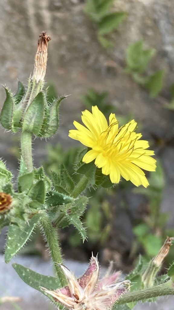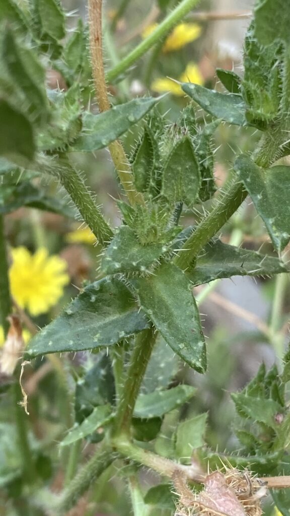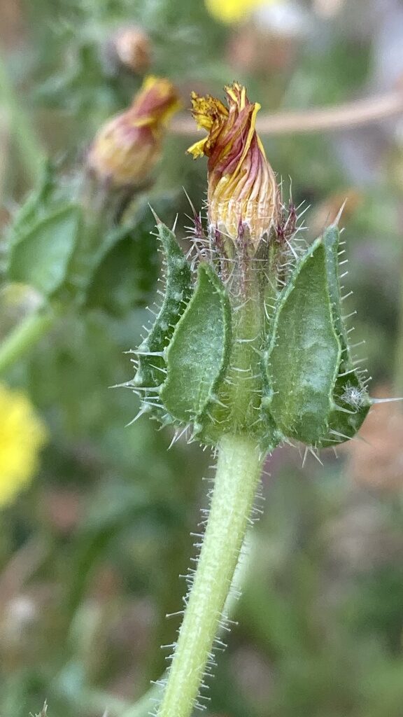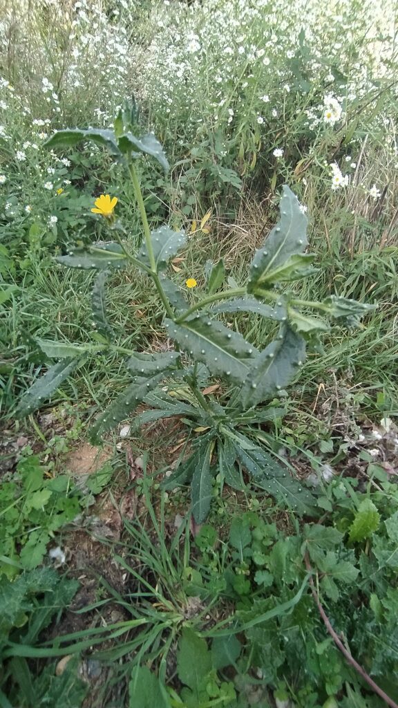 És una herba anual de 30-100 cm, erecta, ± ramificada i híspida amb pèls ± espinescents i inflats a la base. Les fulles basals són oblongues, subenteres o ± dentades, les caulinars, més petites i cordato-amplexicaules. Forma inflorescències en capítols pedunculats agrupats en una panícula subcorimbosa o espiciforme; les bràctees involucrals internes són lanceolades i les externes, amplament ovato-cordiformes. Totes les flors són grogues i ligulades. Els fruits són aquenis de 5-7 mm amb el papus plomós.