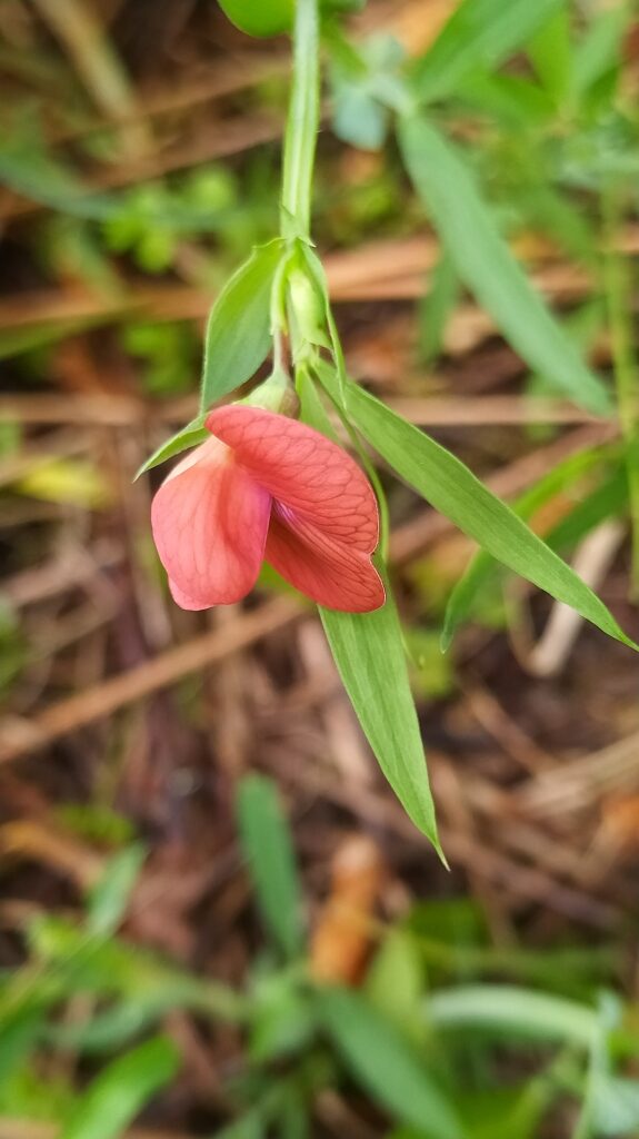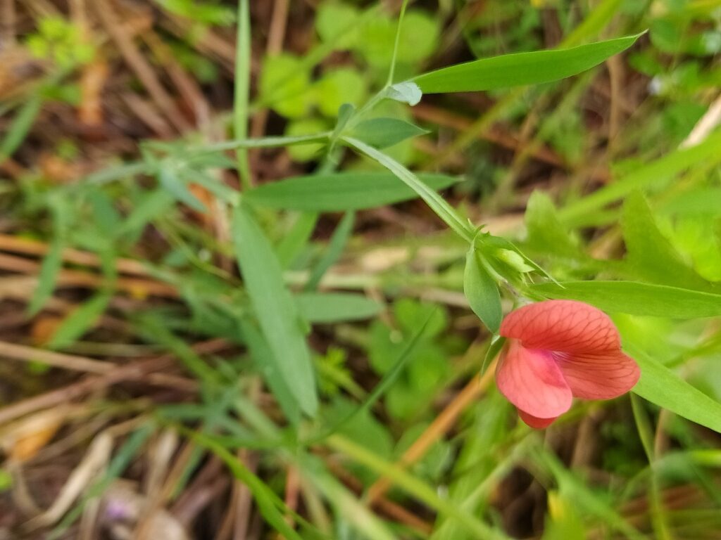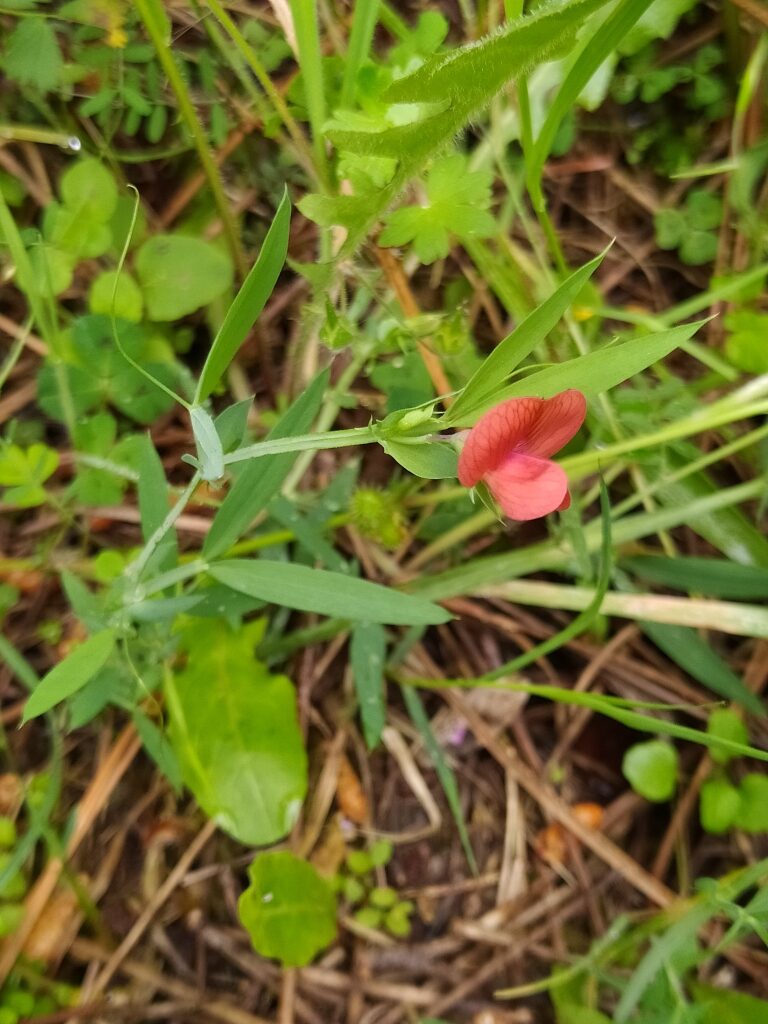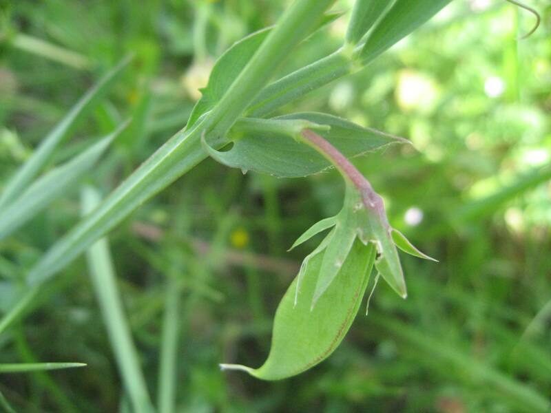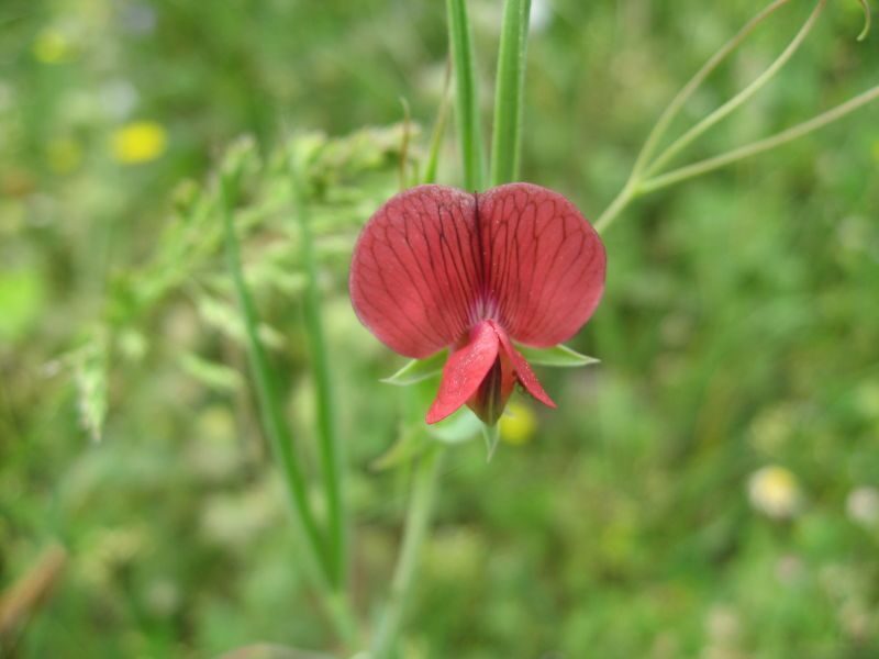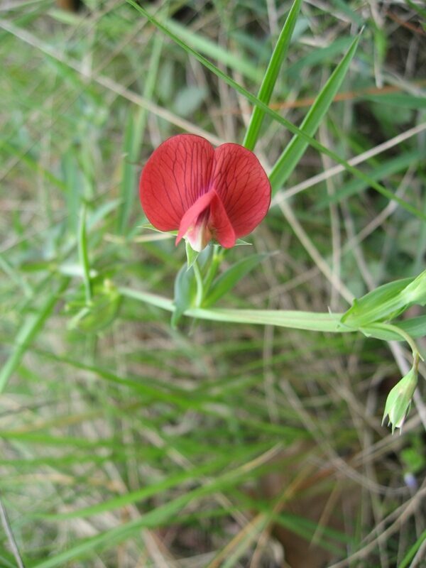 És una herba anual de 20-60 cm, enfiladissa i glabra. Les tiges són alades i ramificades. Les fulles tenen un parell de folíols oposats; el pecíol és netament alat i el circell ramificat. Les estípules són lanceolades, de 2-5 mm d’amplada, agudes o acuminades. Té flors solitàries amb el peduncle més curt que la fulla corresponent, el calze amb les dents 2-3 vegades més llargues que el tub i la corol·la vermella. El fruit és un llegum comprimit de 2-4 cm de longitud, d’un bru clar amb 3-6 granes.