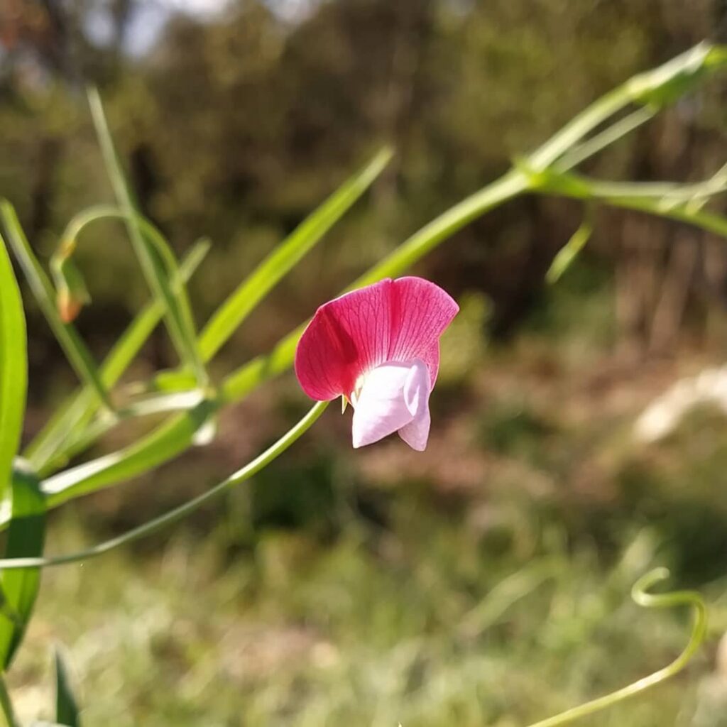 És una herba anual de 30-80 cm, enfiladissa i glabra. Les fulles inferiors són simples, oblongues i sense circell ni estípules, les mitjanes i superiors són pinnaticompostes amb 1-4 parells de folíols oblongs o linears, el raquis és alat i terminat en un circell molt ramificat. La Inflorescència te 1-2 flors sobre un peduncle tan llarg com la fulla corresponent o més. El Calze té el tub de 3-6 mm i les dents de diferent mida entre elles. La corol·la té l’estendard purpuri i les ales blavenques o blanquinoses. El fruit és un llegum comprimit, glabre de 3-8 cm de longitud amb 4-7 granes.