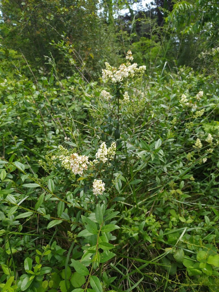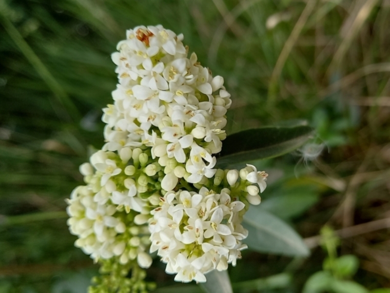 És un arbust d’1-3 m amb les branques patents; les joves, puberulents. L’escorça és llisa i grisenca. Les fulles són oposades, curtament peciolades amb el limbe lanceolat, glabre, gruixut i de contorn enter. Les inflorescències, en panícules terminals denses, tenen les flors blanques i flairoses amb el calze campanulat amb 4 petites dents, la corol·la amb un tub d’1-2 mm i 4 lòbuls ovats lleugerament reflexos a la floració. El fruit és una baia esfèrica negra de 3-6 mm de diàmetre.