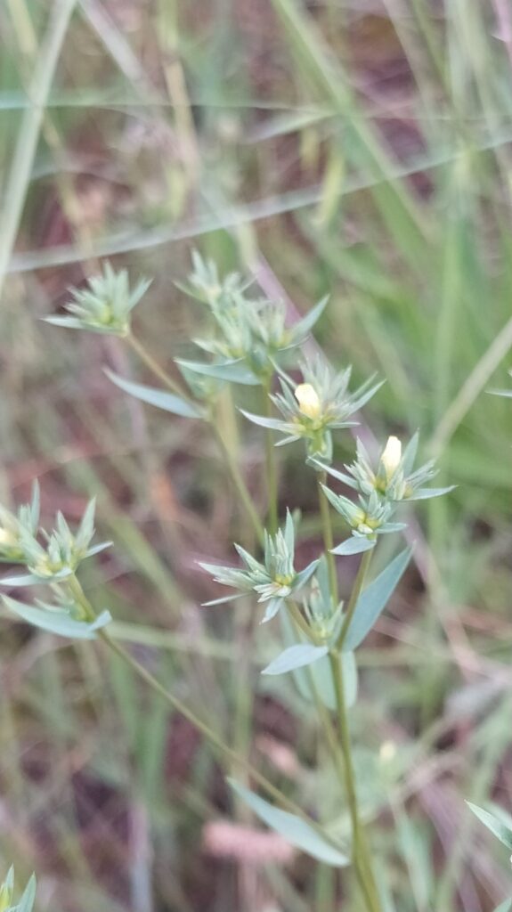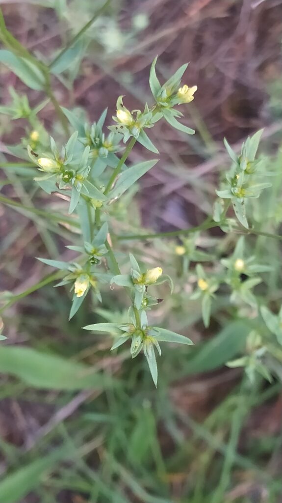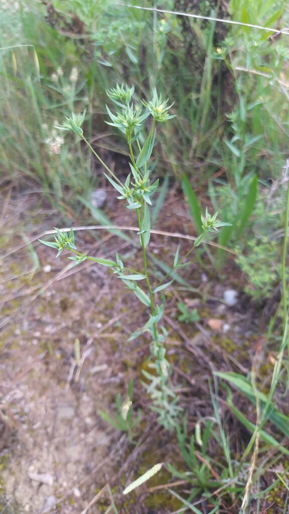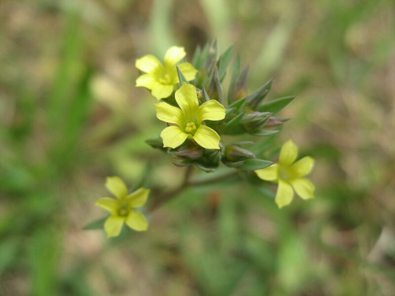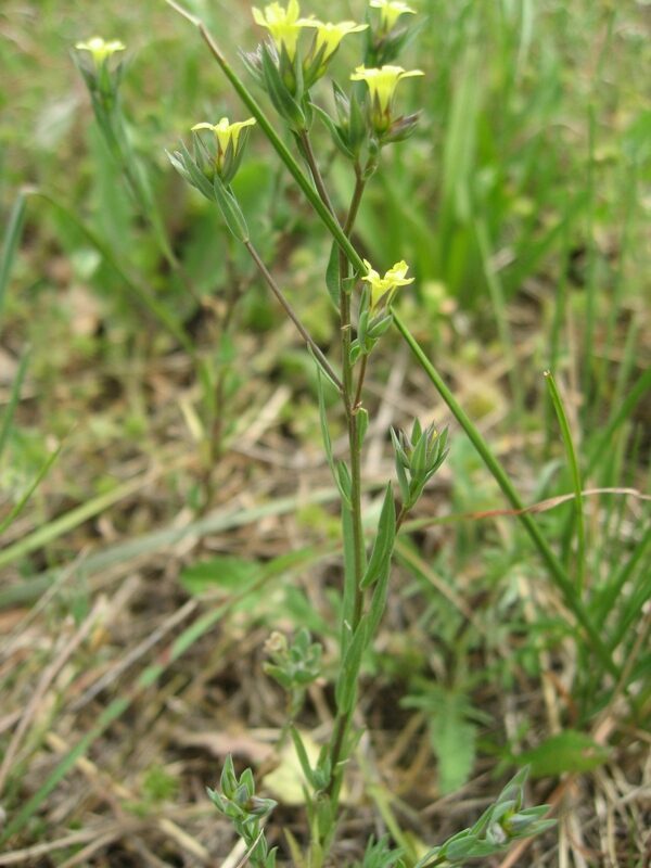 És una herba anual de 8-40 cm, erecta, ordinàriament ramificada a la part superior, de tendència rígida i tacte aspre Les fulles són alternes, caduques a la fructificació, linear-lanceolades, d’àpex agut i contorn escabre. La inflorescència és variable, de tendència corimbiforme, amb les flors curtament pedicel·lades, els sèpals lanceolats, llargament acuminats i els pètals grocs lliures entre si. El fruit és una càpsula subglobosa de 2-3 mm.